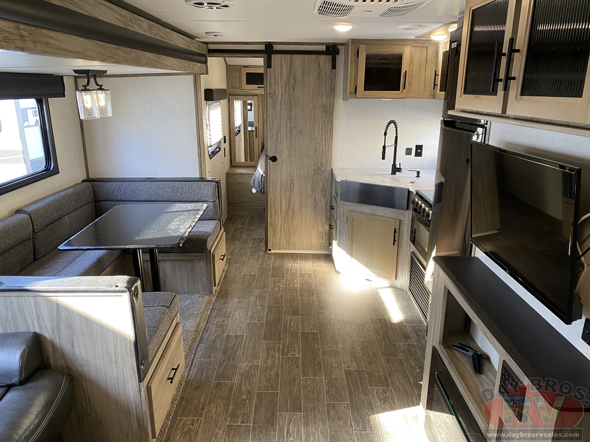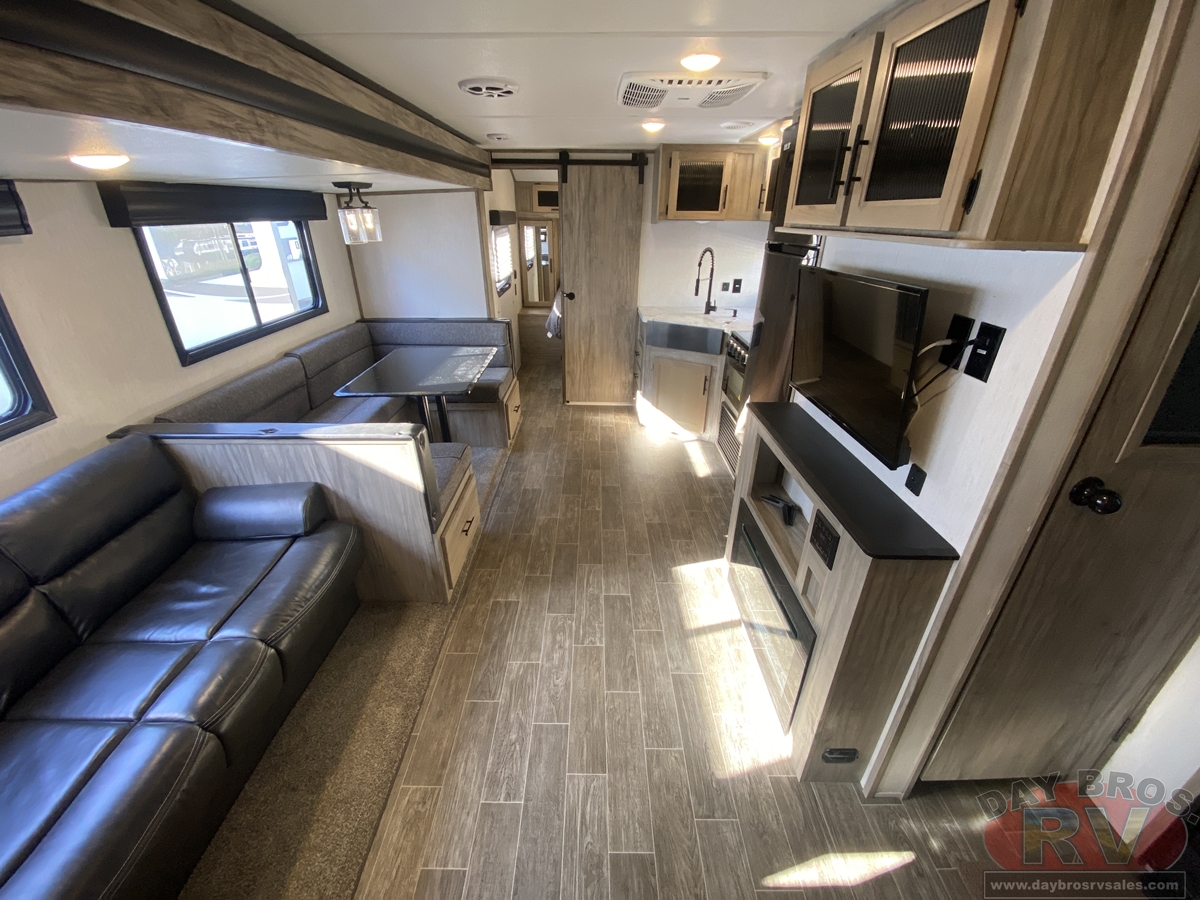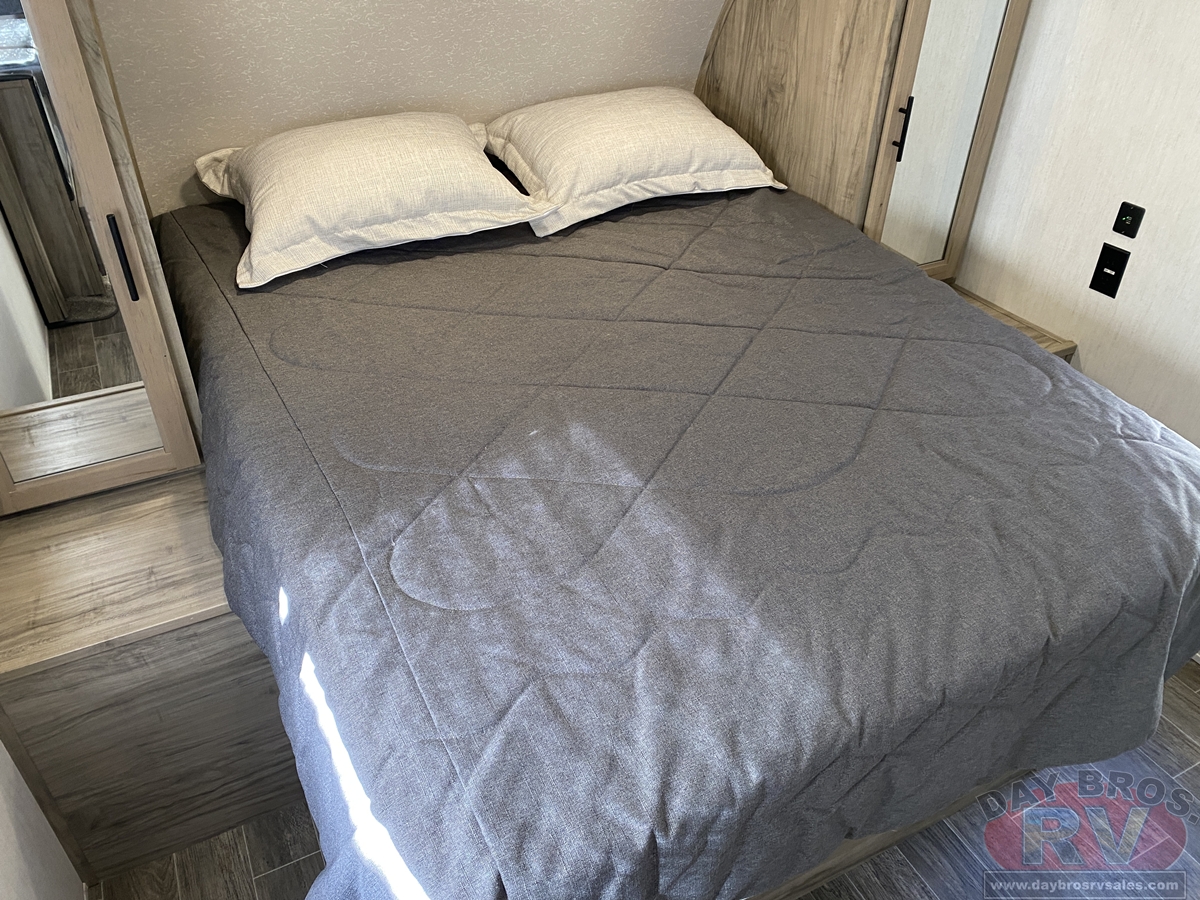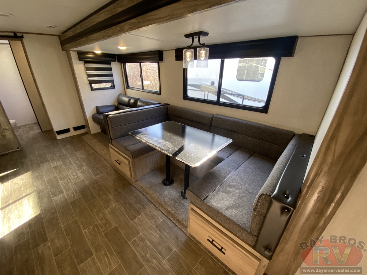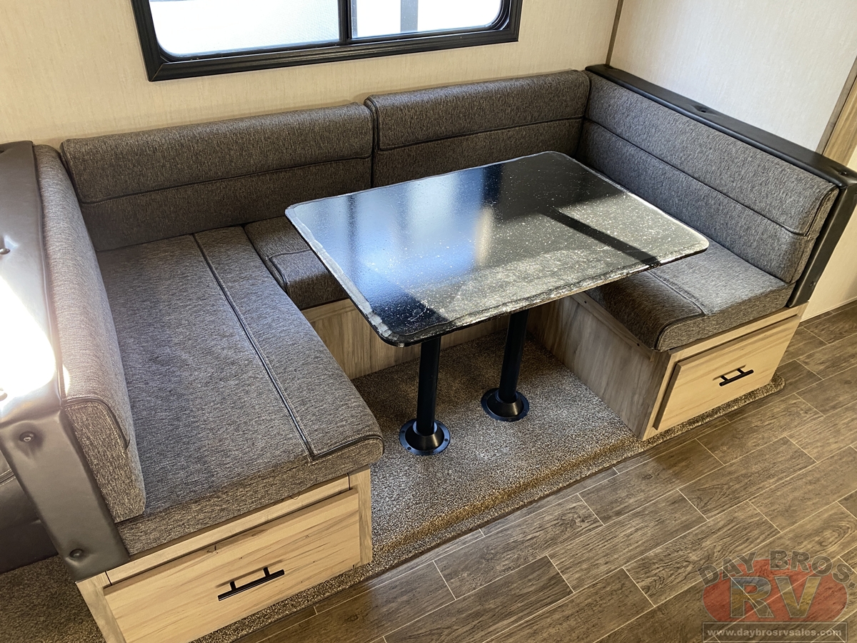 Perfect for the two of you that want to get out and tour or spend the summer at your favorite camp site! Some interior appointments include, abundant interior storage capacity, oversized rear bath with additional linen cabinet, oversized u-dinette seating surface, dual pots and pans drawers, farm-style sink and dual barn-style doors. Some exterior refinements include an oversized 20’ exterior awning and a full outside kitchen with fridge/freezer, working sink and cabinet storage!