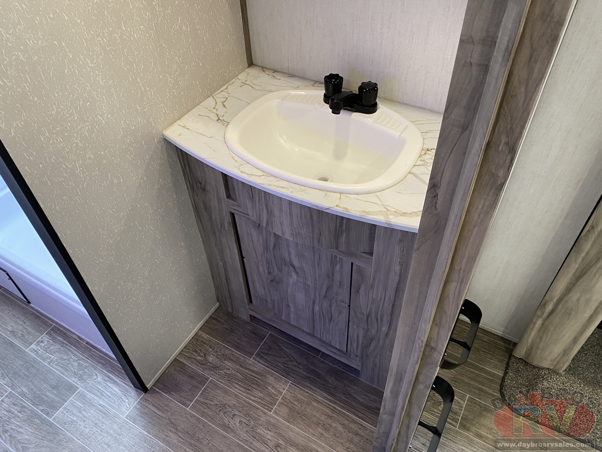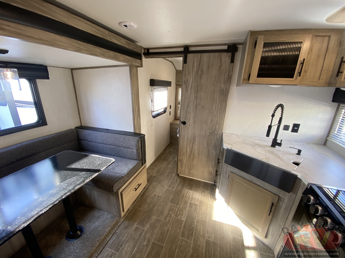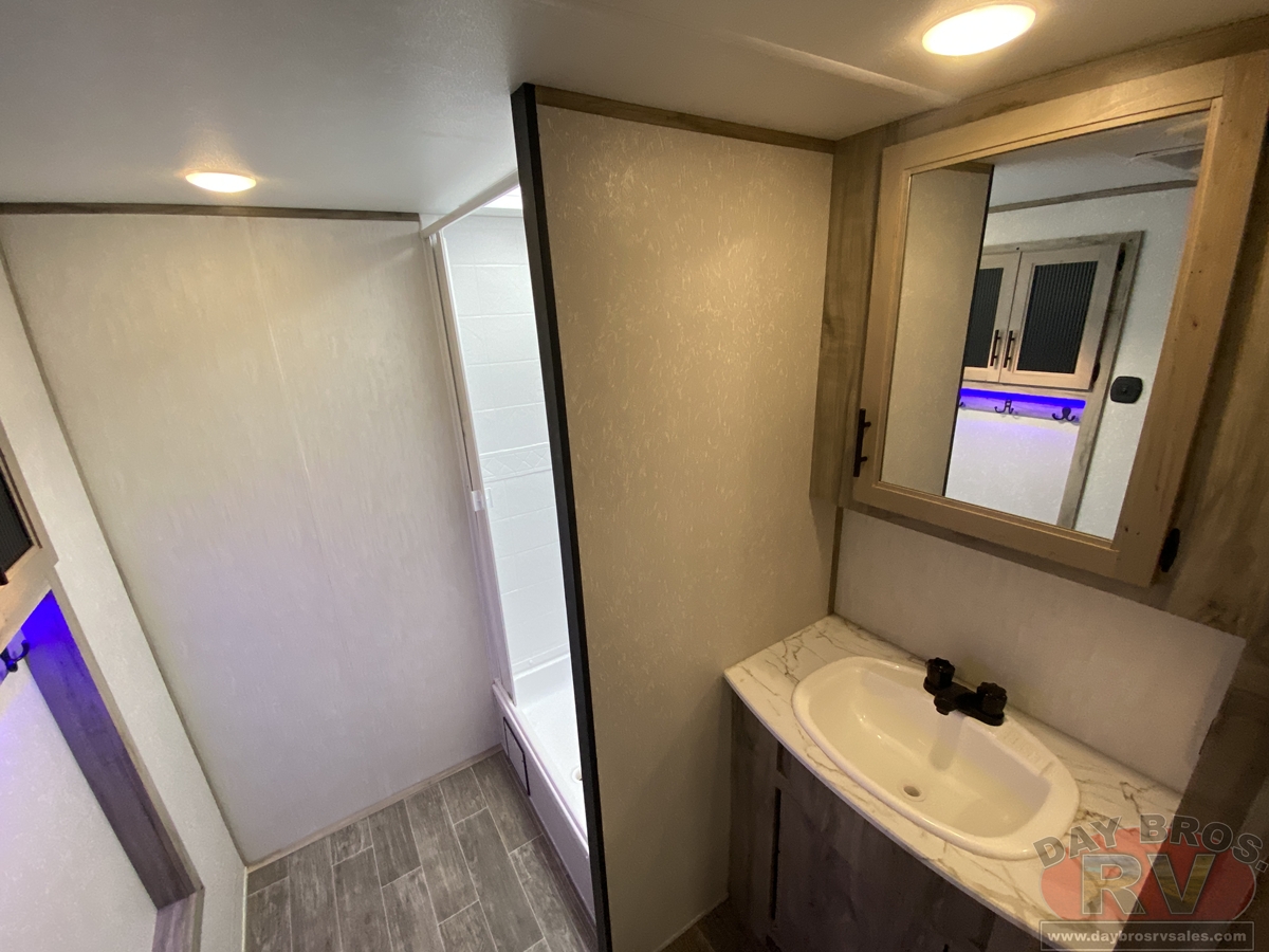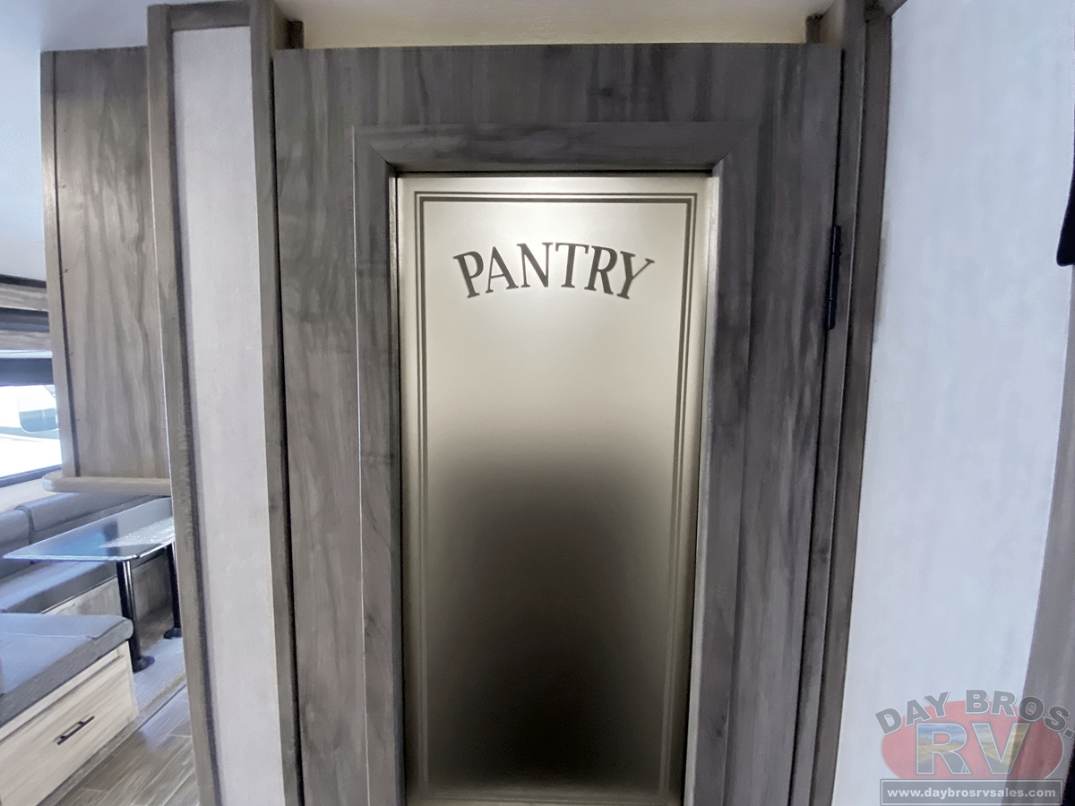 Perfect for the two of you that want to get out and tour or spend the summer at your favorite camp site! Some interior appointments include, abundant interior storage capacity, oversized rear bath with additional linen cabinet, oversized u-dinette seating surface, dual pots and pans drawers, farm-style sink and dual barn-style doors. Some exterior refinements include an oversized 20’ exterior awning and a full outside kitchen with fridge/freezer, working sink and cabinet storage!