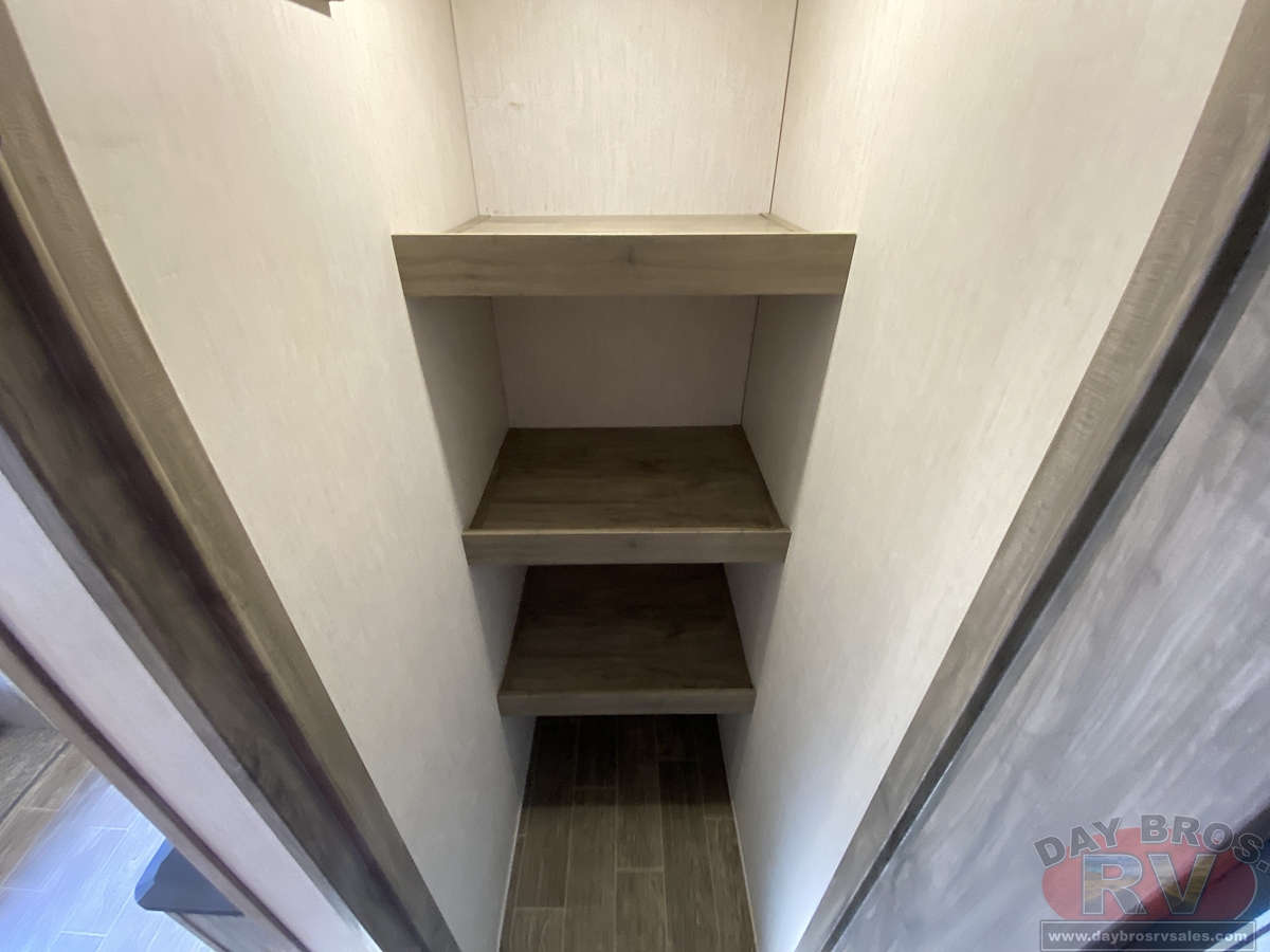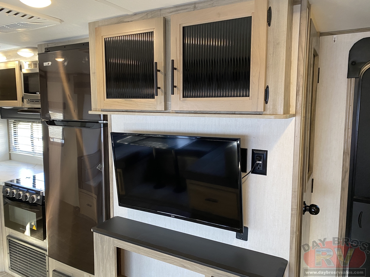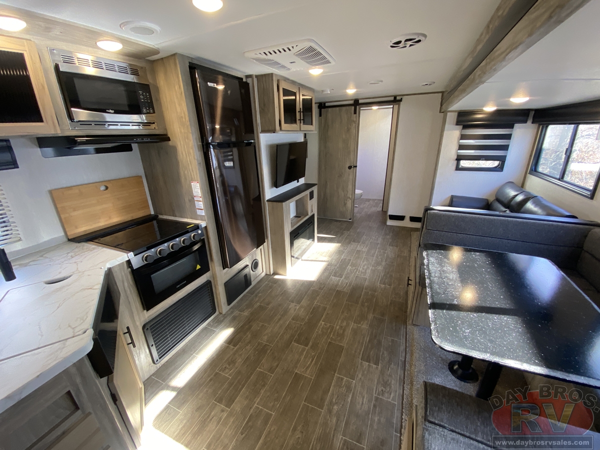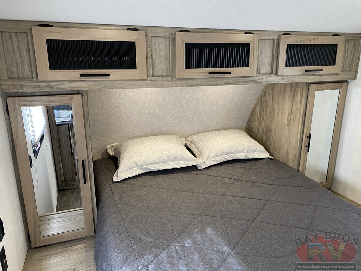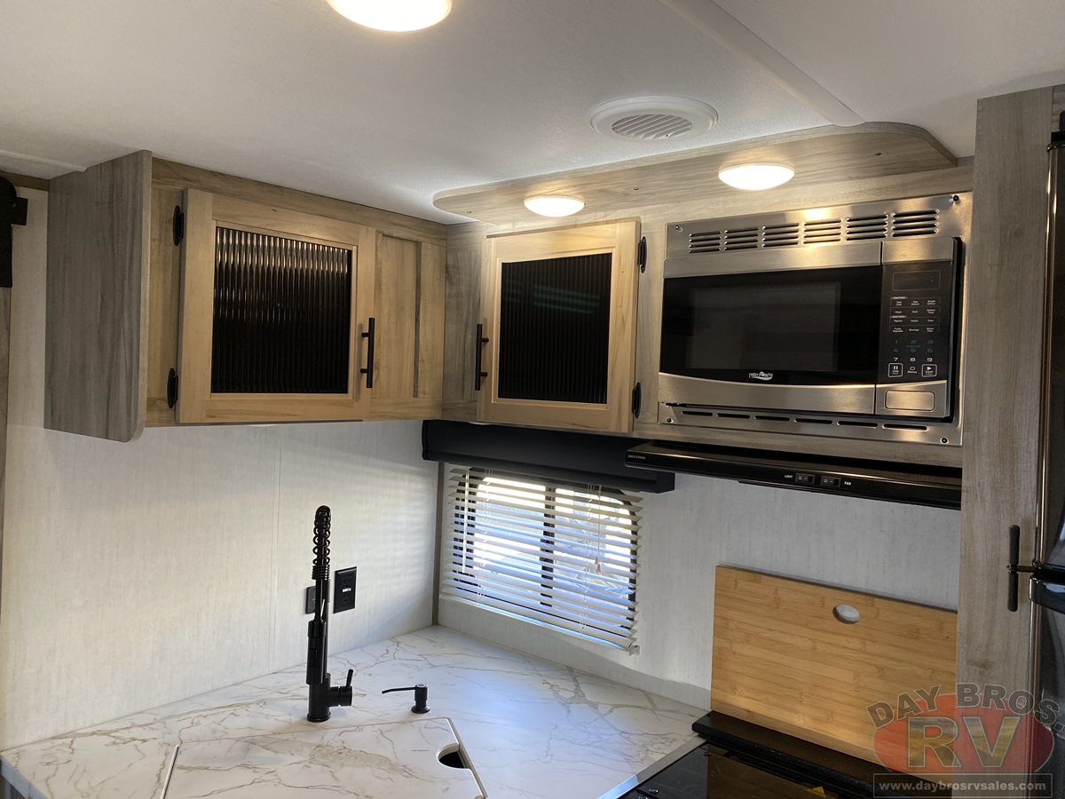 Perfect for the two of you that want to get out and tour or spend the summer at your favorite camp site! Some interior appointments include, abundant interior storage capacity, oversized rear bath with additional linen cabinet, oversized u-dinette seating surface, dual pots and pans drawers, farm-style sink and dual barn-style doors. Some exterior refinements include an oversized 20’ exterior awning and a full outside kitchen with fridge/freezer, working sink and cabinet storage!