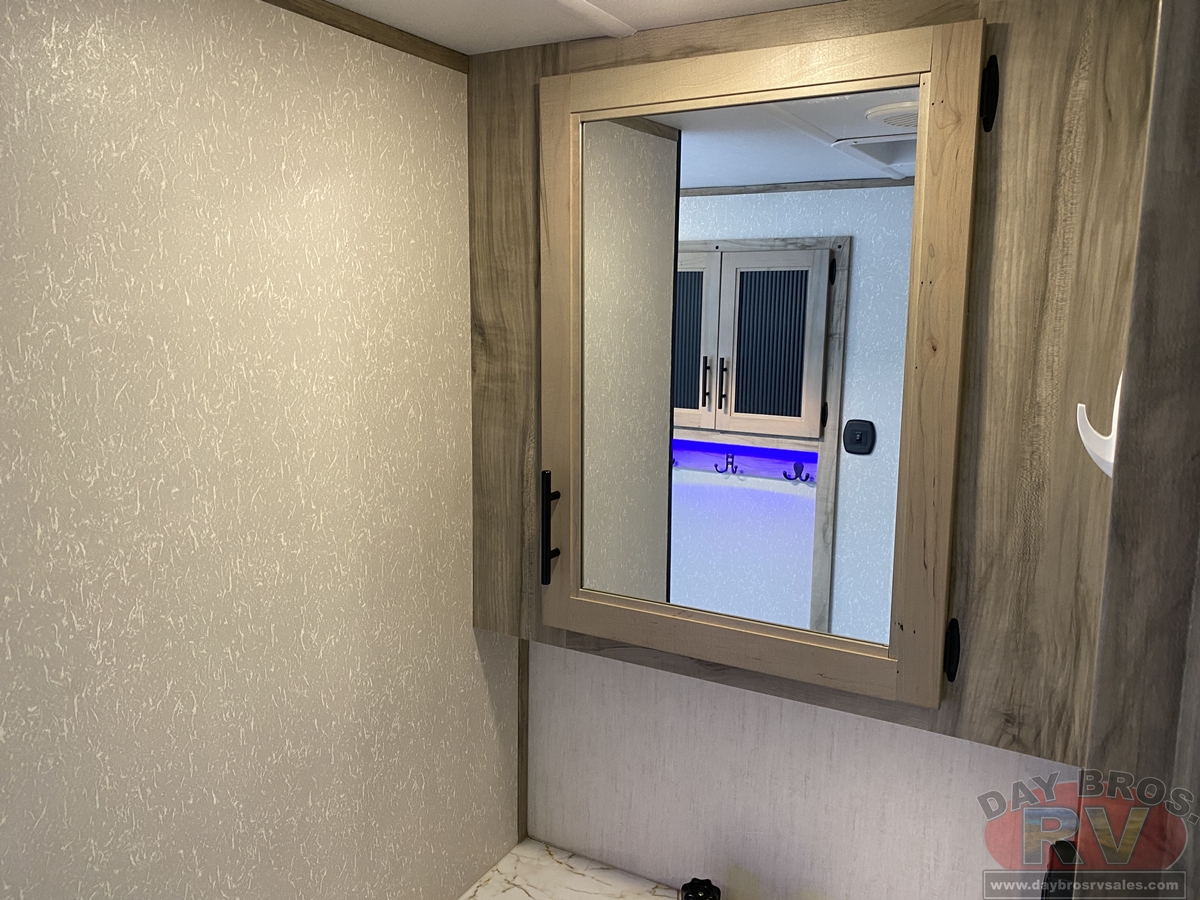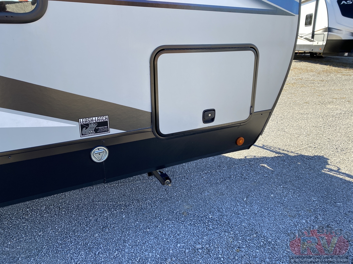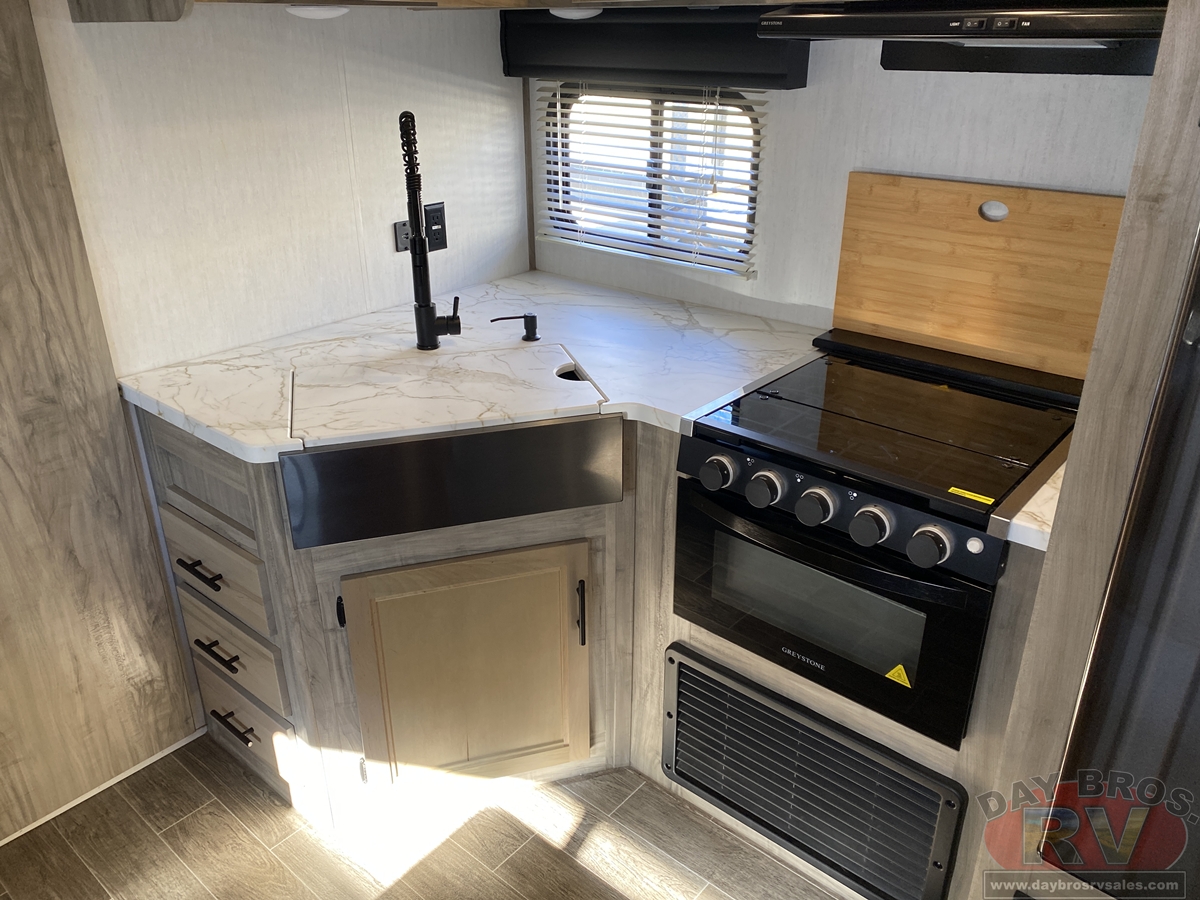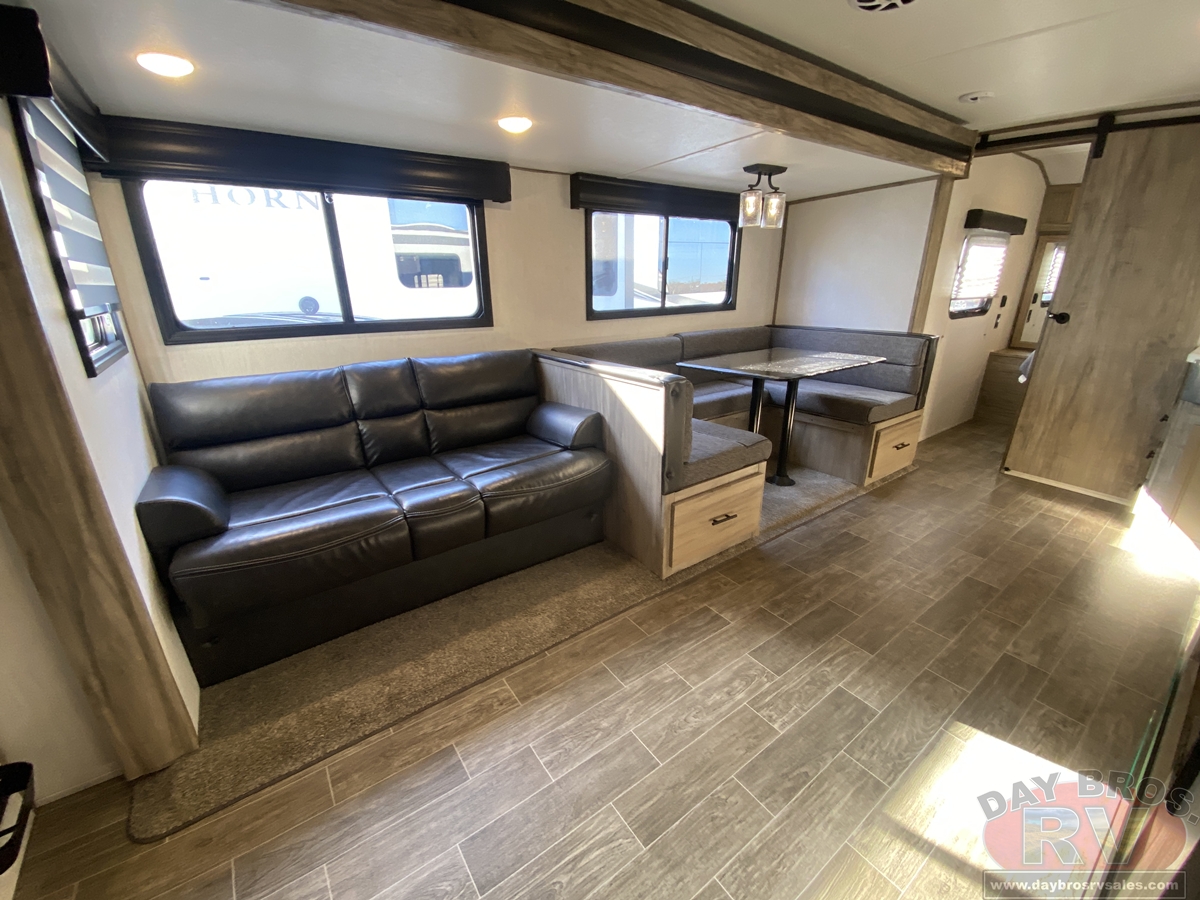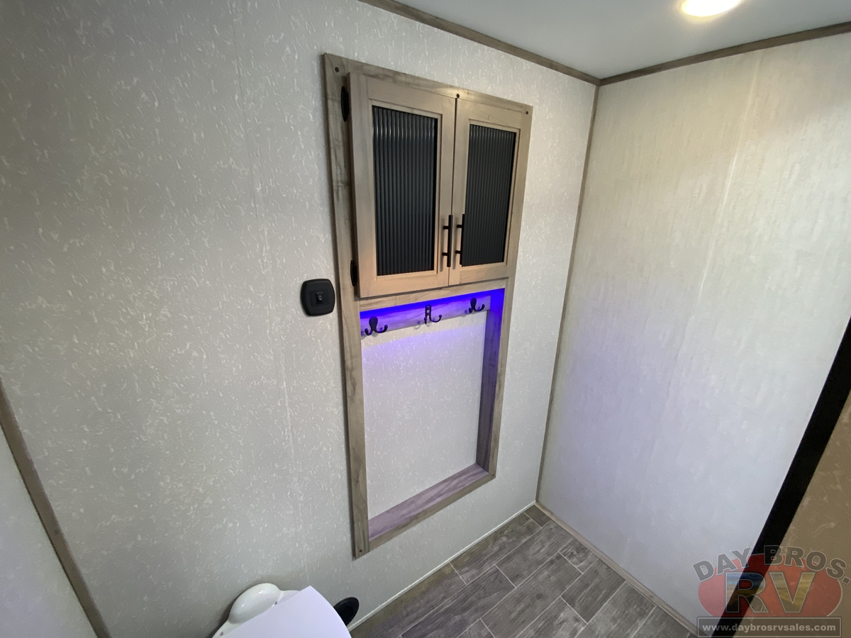 Perfect for the two of you that want to get out and tour or spend the summer at your favorite camp site! Some interior appointments include, abundant interior storage capacity, oversized rear bath with additional linen cabinet, oversized u-dinette seating surface, dual pots and pans drawers, farm-style sink and dual barn-style doors. Some exterior refinements include an oversized 20’ exterior awning and a full outside kitchen with fridge/freezer, working sink and cabinet storage!
