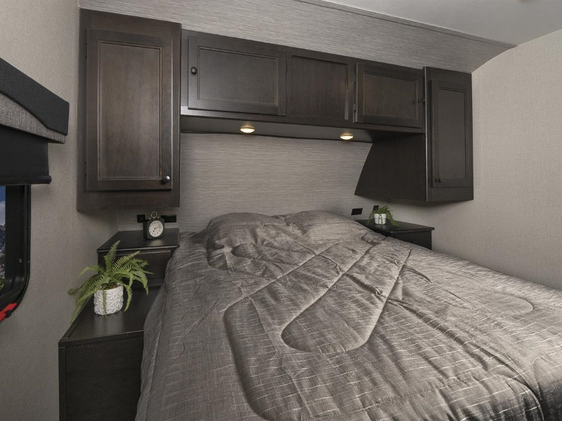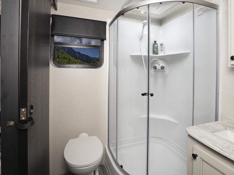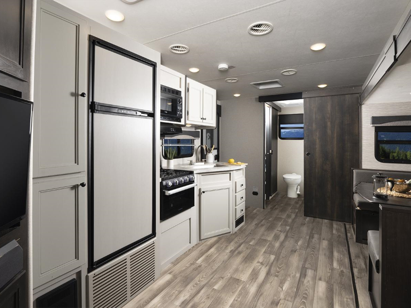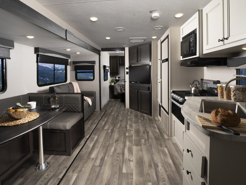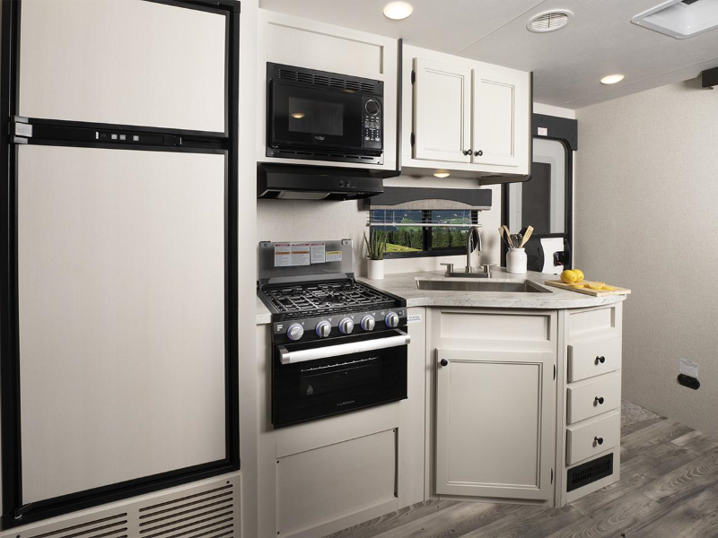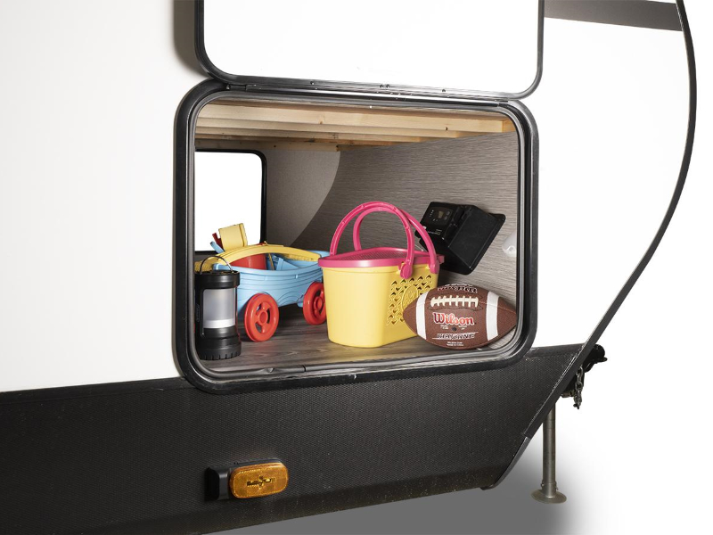 The Range Lite Travel Trailer maximizes interior space and storage while being lightweight and easy to tow, thanks in large part to our TuffShell™ fiberglass walls. Whether you choose a larger floorplan or a couples coach, extra-deep slideouts with flush residential floors add more livable shared space and make maintenance easy.