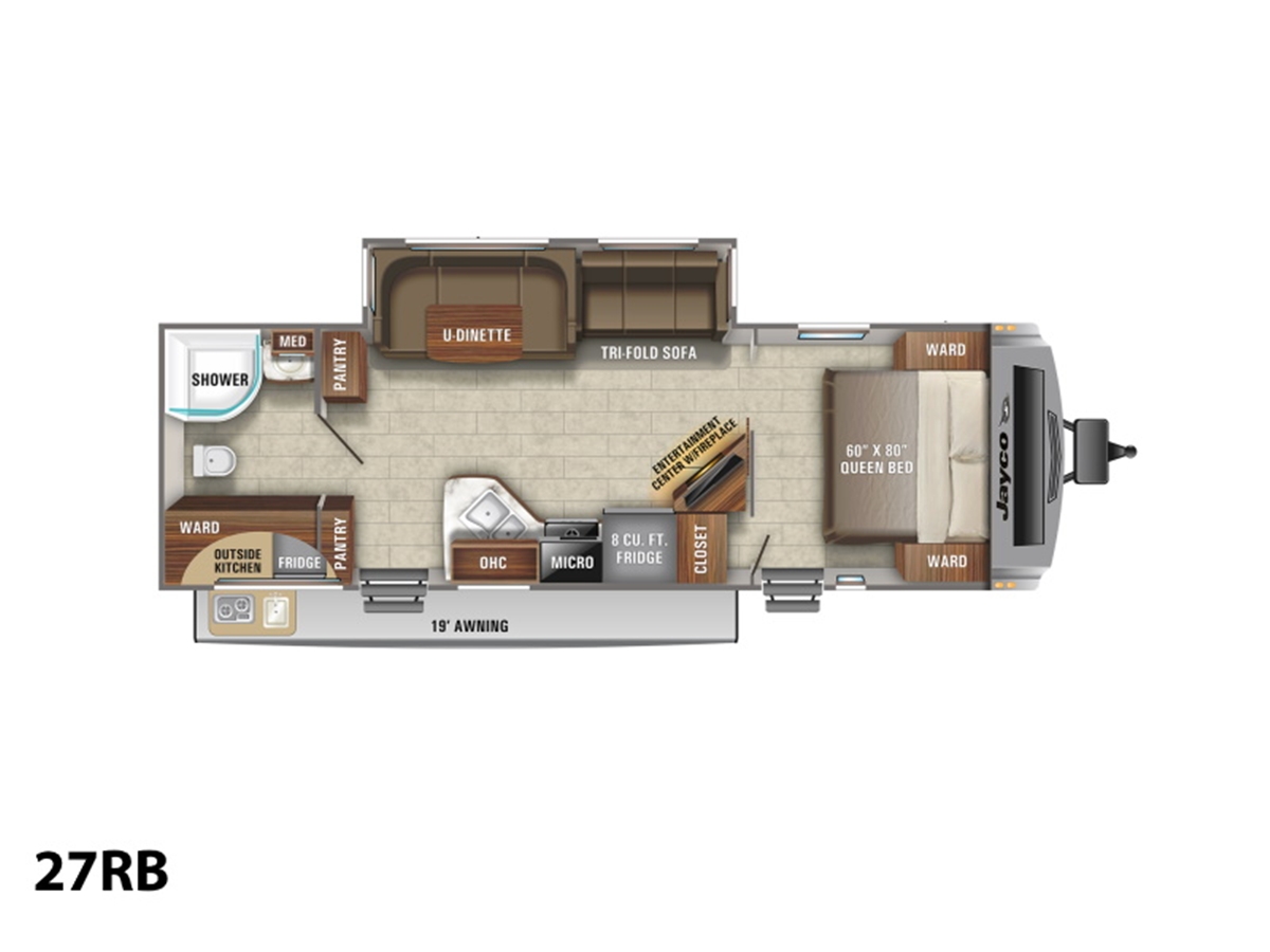 - Fixed bunks with 120V outlet and corner shelf (bunk models only)
