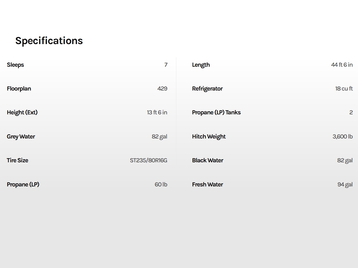 - 94 gal. fresh, 82 gal. gray, 82. gal. waste water tanks