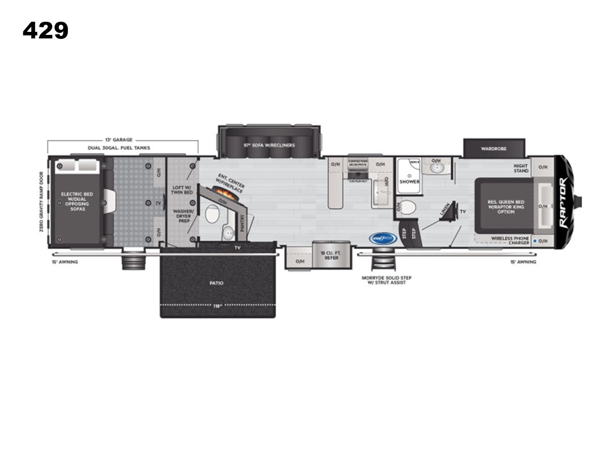 Keystone Raptor sets the standard for hardworking and innovative toy hauler fifth wheels. A favorite among thrill-seekers, Raptor has rapidly developed a new fan base. Working RVers, hobbyists, and outdoor enthusiasts of all types appreciate Raptor's flexible floorplans and large garages. Multi-zone living and sophisticated design make Raptors one of the best toy hauler brands for families as well. Raptor toy haulers strike the perfect balance of creature comfort and rugged flexibility to deliver no-limits adventure that evolves as you do.