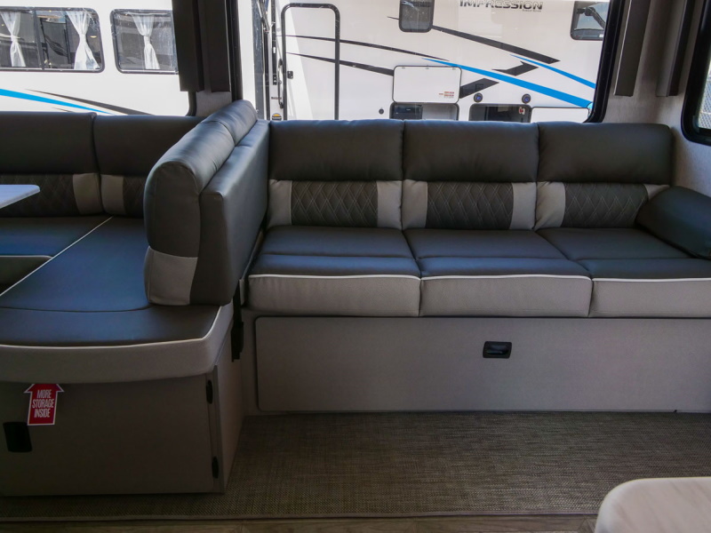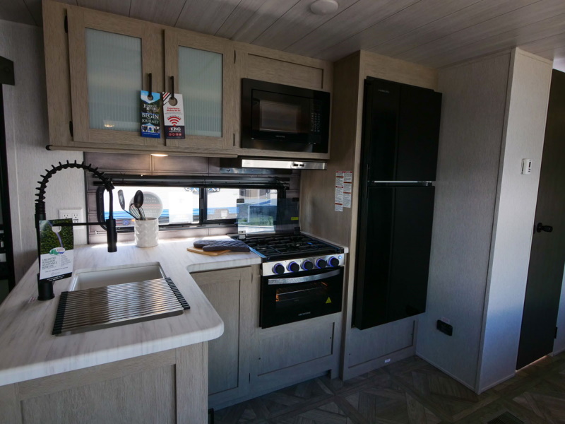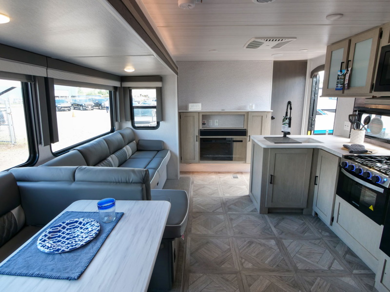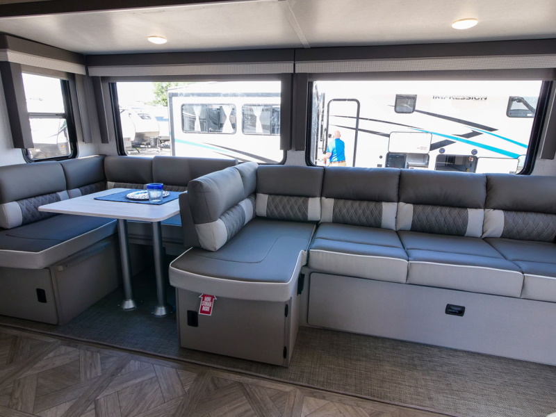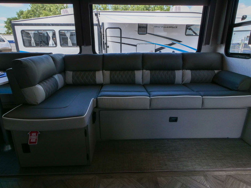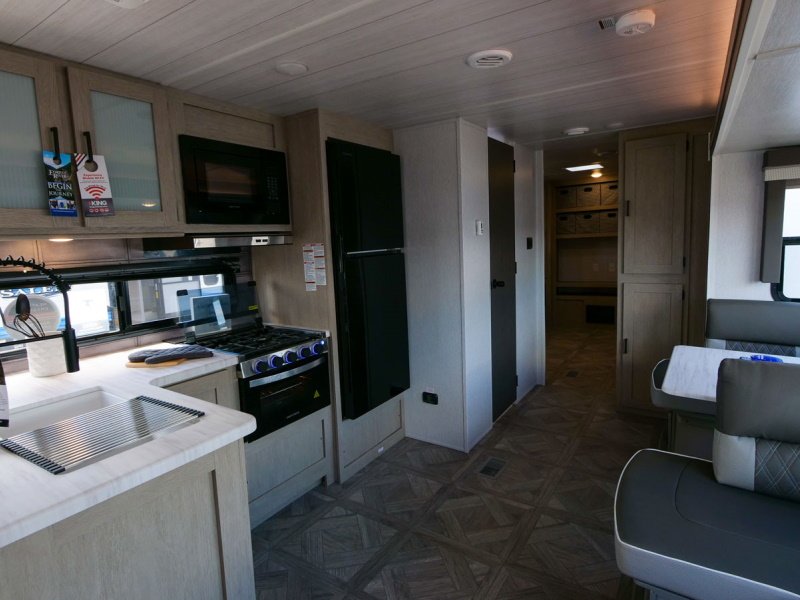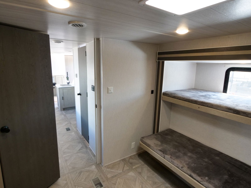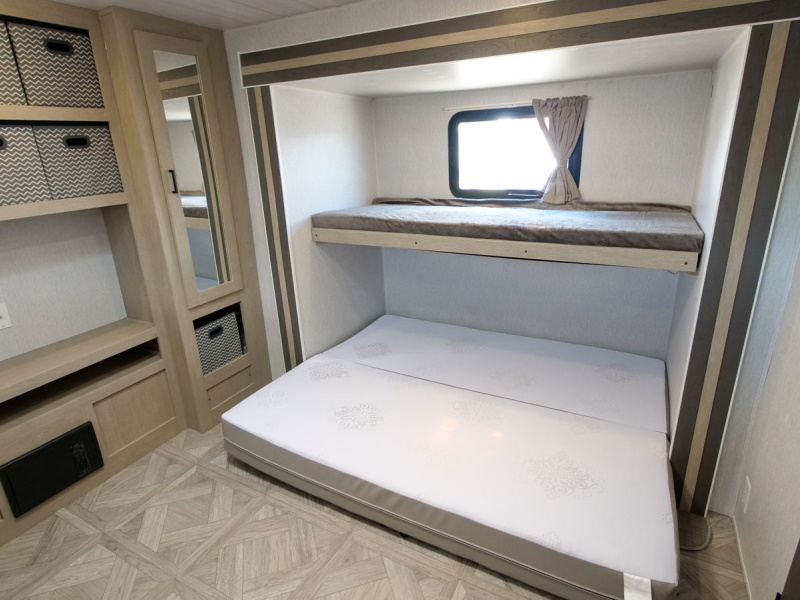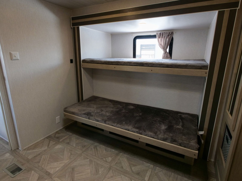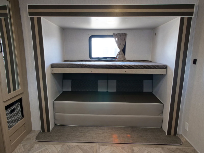 The 31KQBTS is the ultimate bunkhouse, with three total slide outs and an outside kitchen. This well-equipped travel trailer features oversized panoramic windows, the ever-popular U-dinette, which you can customize with the adjacent Versa-Lounge. The kitchen includes a 11 CU. FT. refrigerator and stovetop with oven and LED accents, plus cabinets for all your cooking essentials!