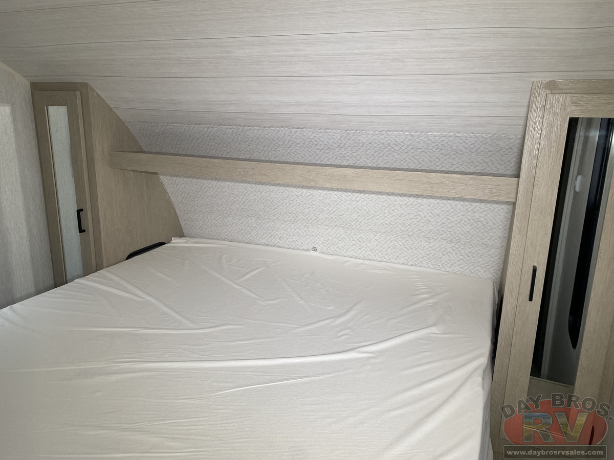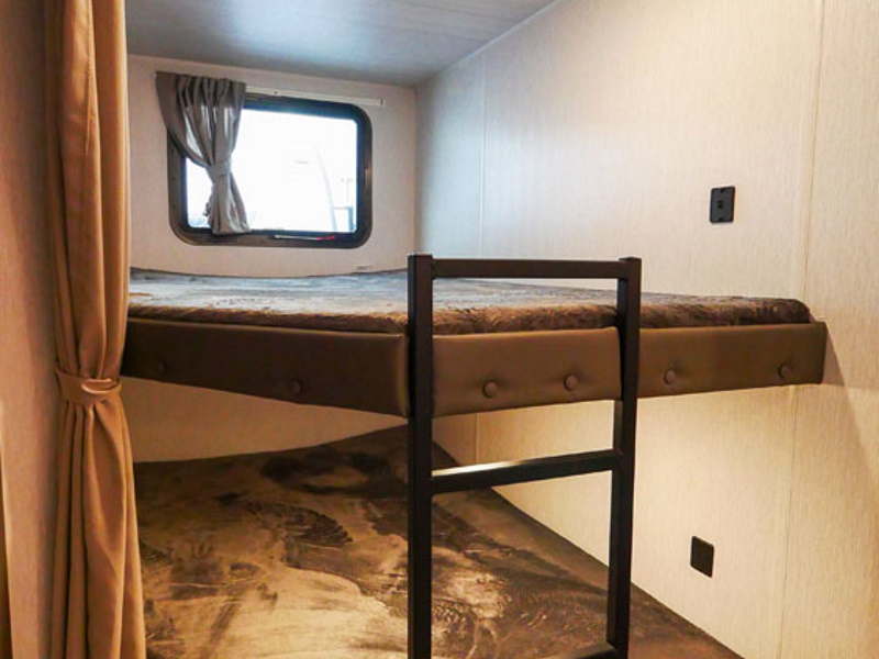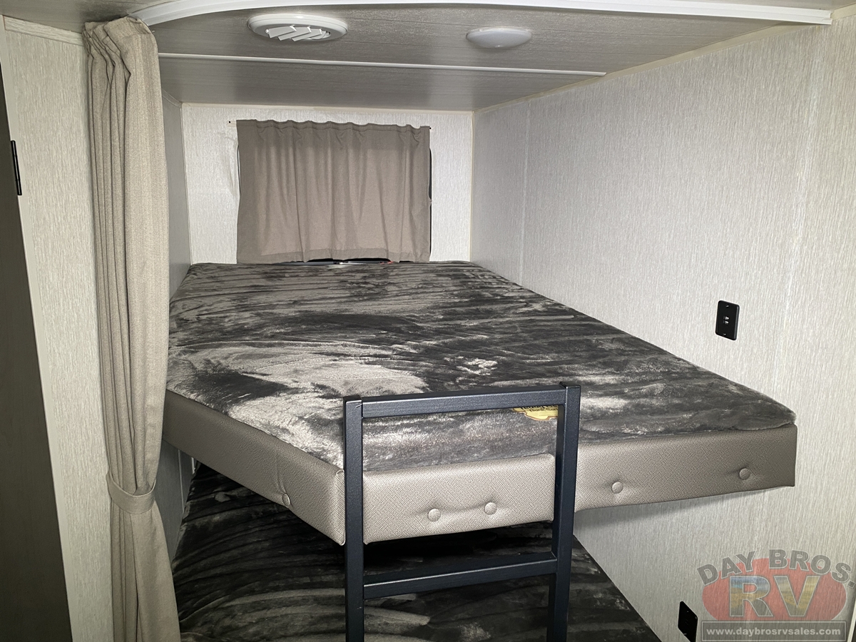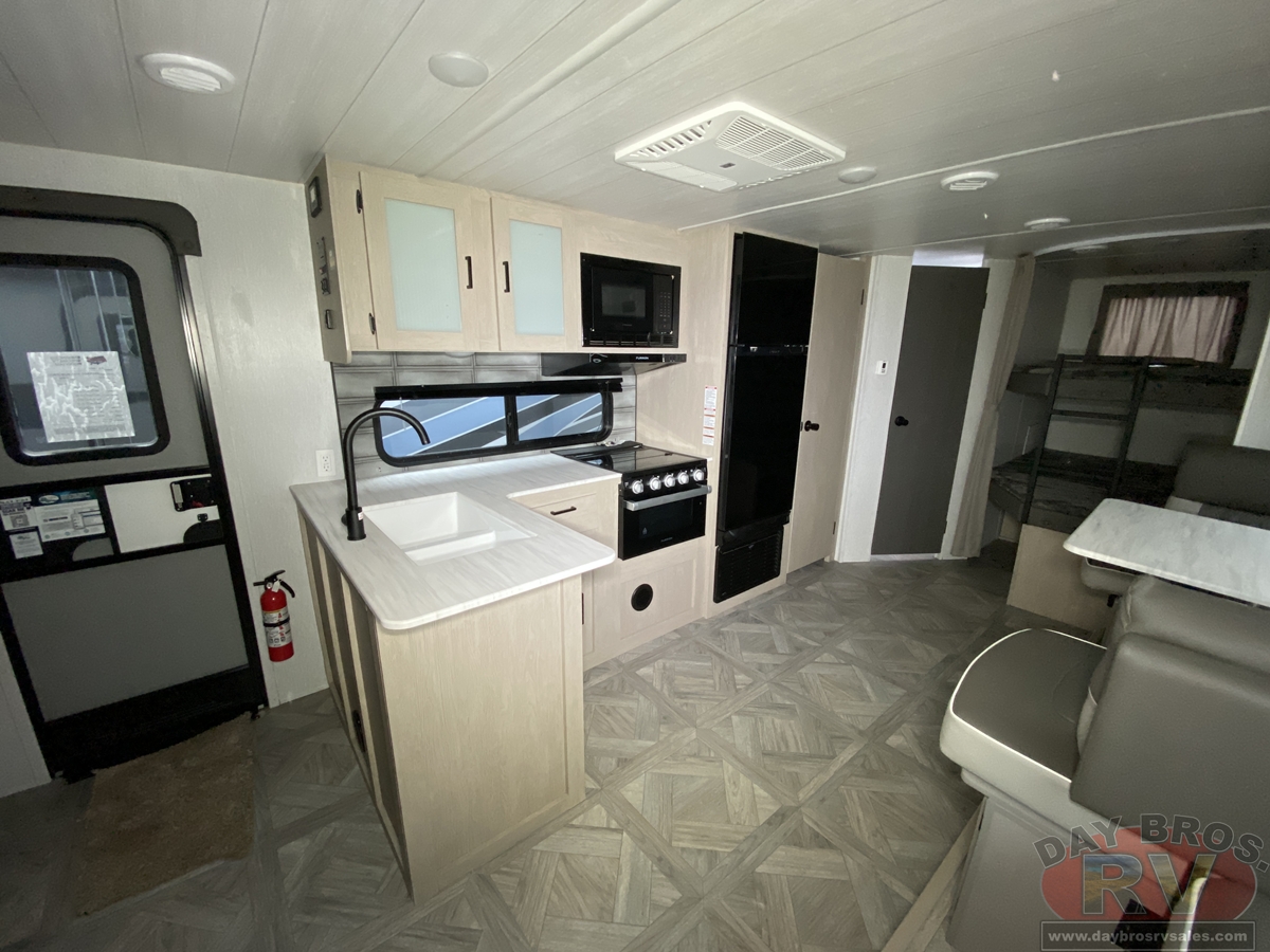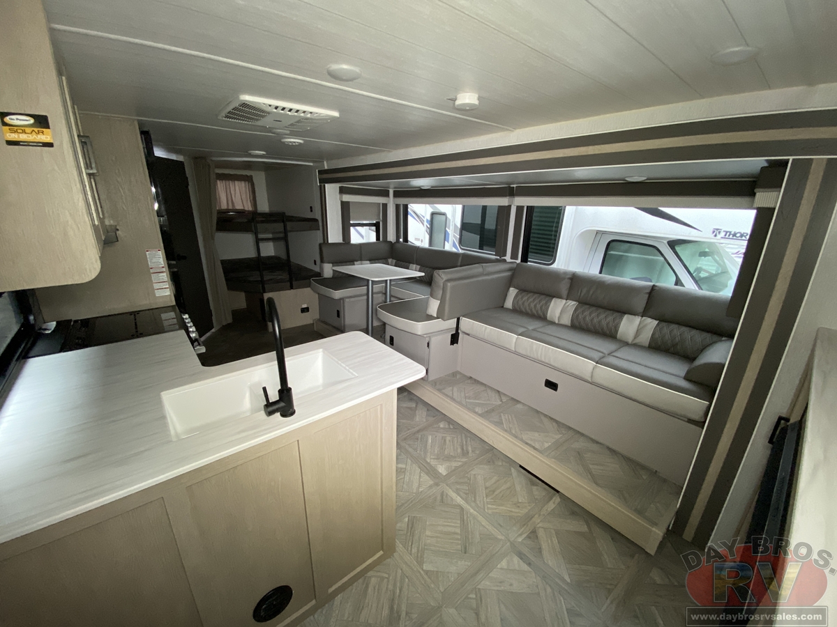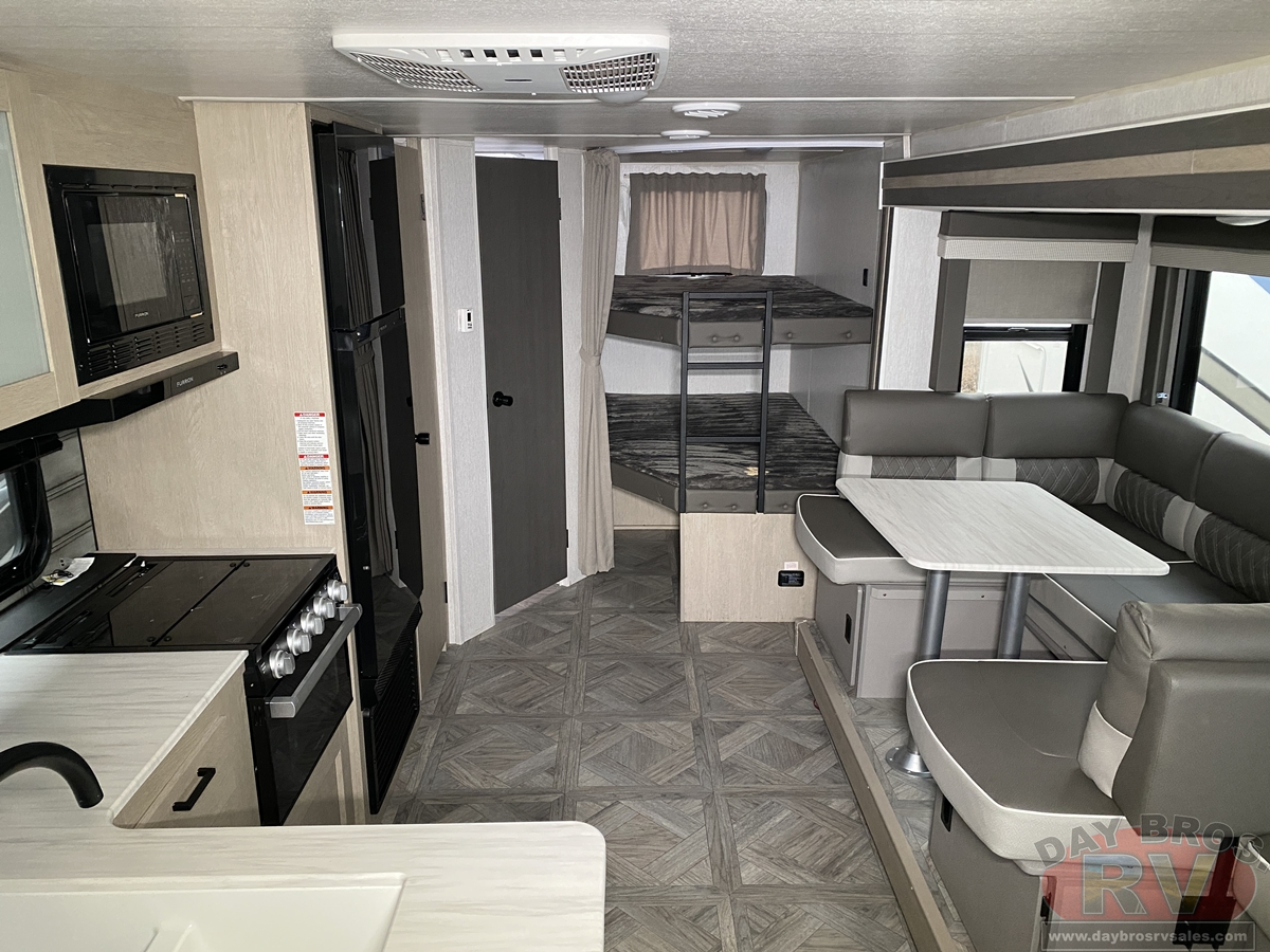 The 263BHXL is perfect for family travels. The rear features two oversized bunks for the kids, with plenty of space to stretch out. The grown-ups will sleep soundly in the front queen bedroom, which includes hanging closets and under-bed Stow N Go Storage. The living area includes panoramic windows and the Versa-Lounge. The kitchen provides a 11 CU. FT. refrigerator and TONS of storage.