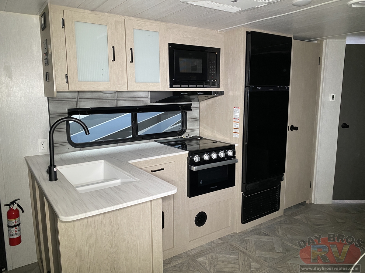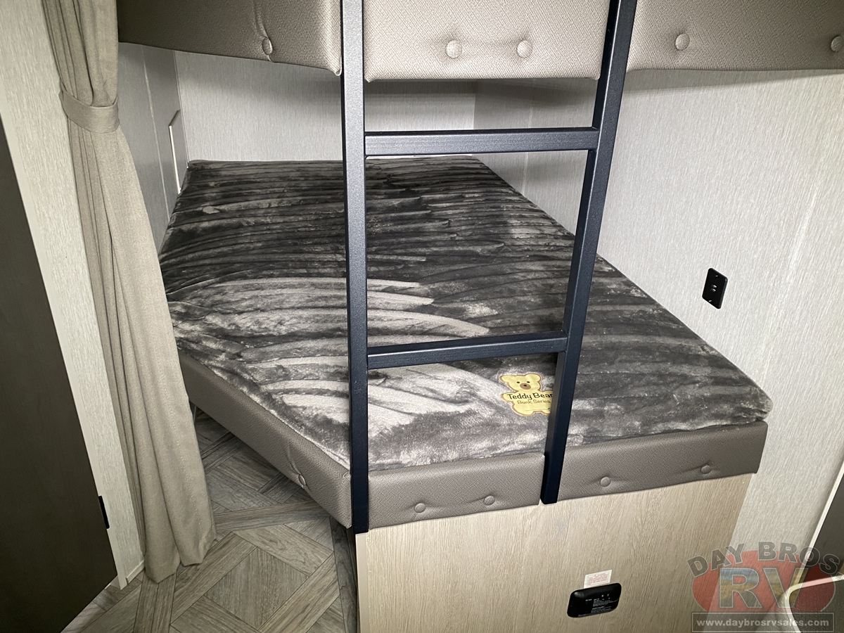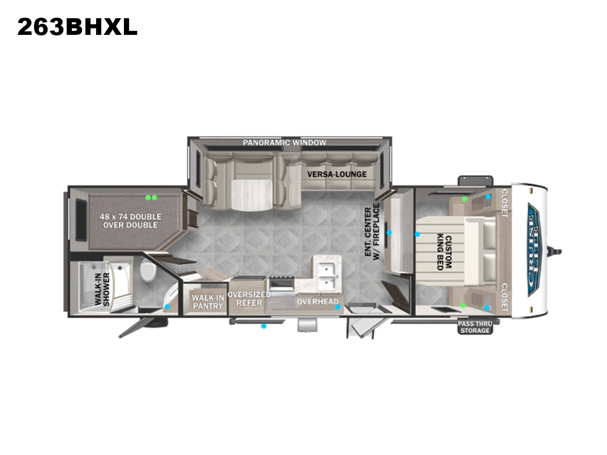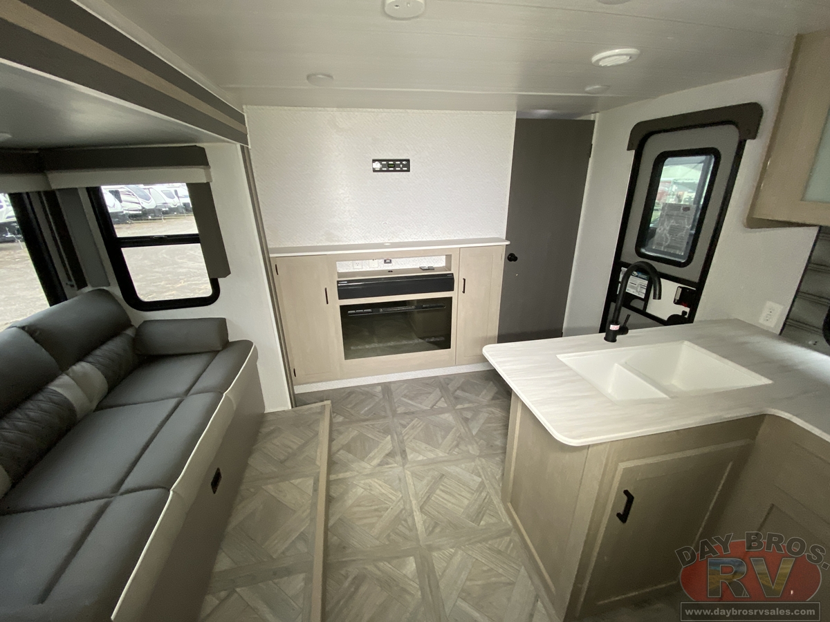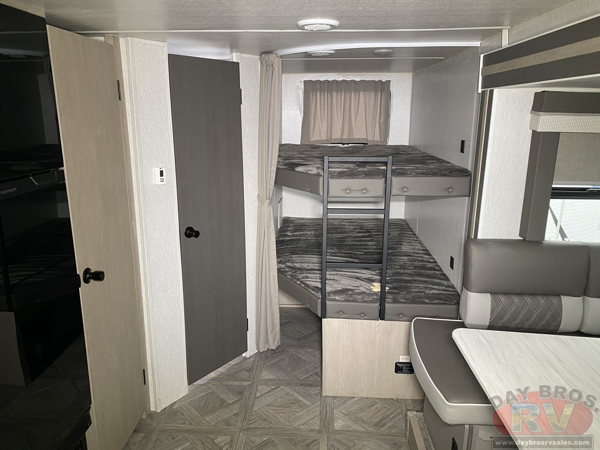 The 263BHXL is perfect for family travels. The rear features two oversized bunks for the kids, with plenty of space to stretch out. The grown-ups will sleep soundly in the front queen bedroom, which includes hanging closets and under-bed Stow N Go Storage. The living area includes panoramic windows and the Versa-Lounge. The kitchen provides a 11 CU. FT. refrigerator and TONS of storage.