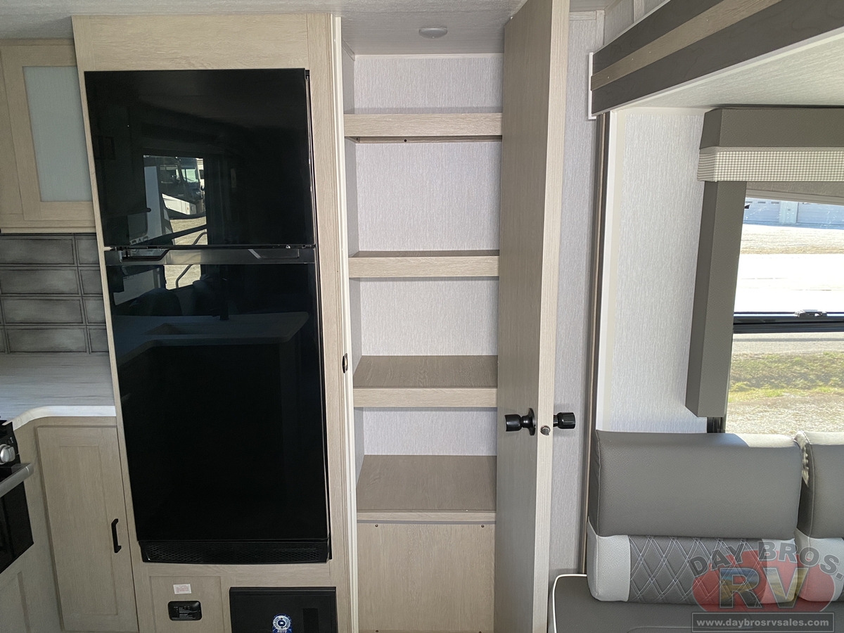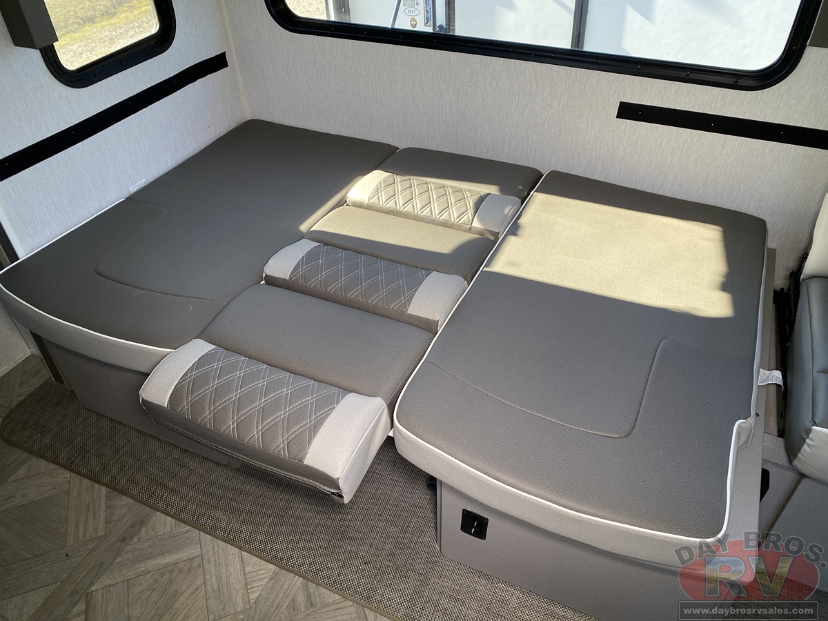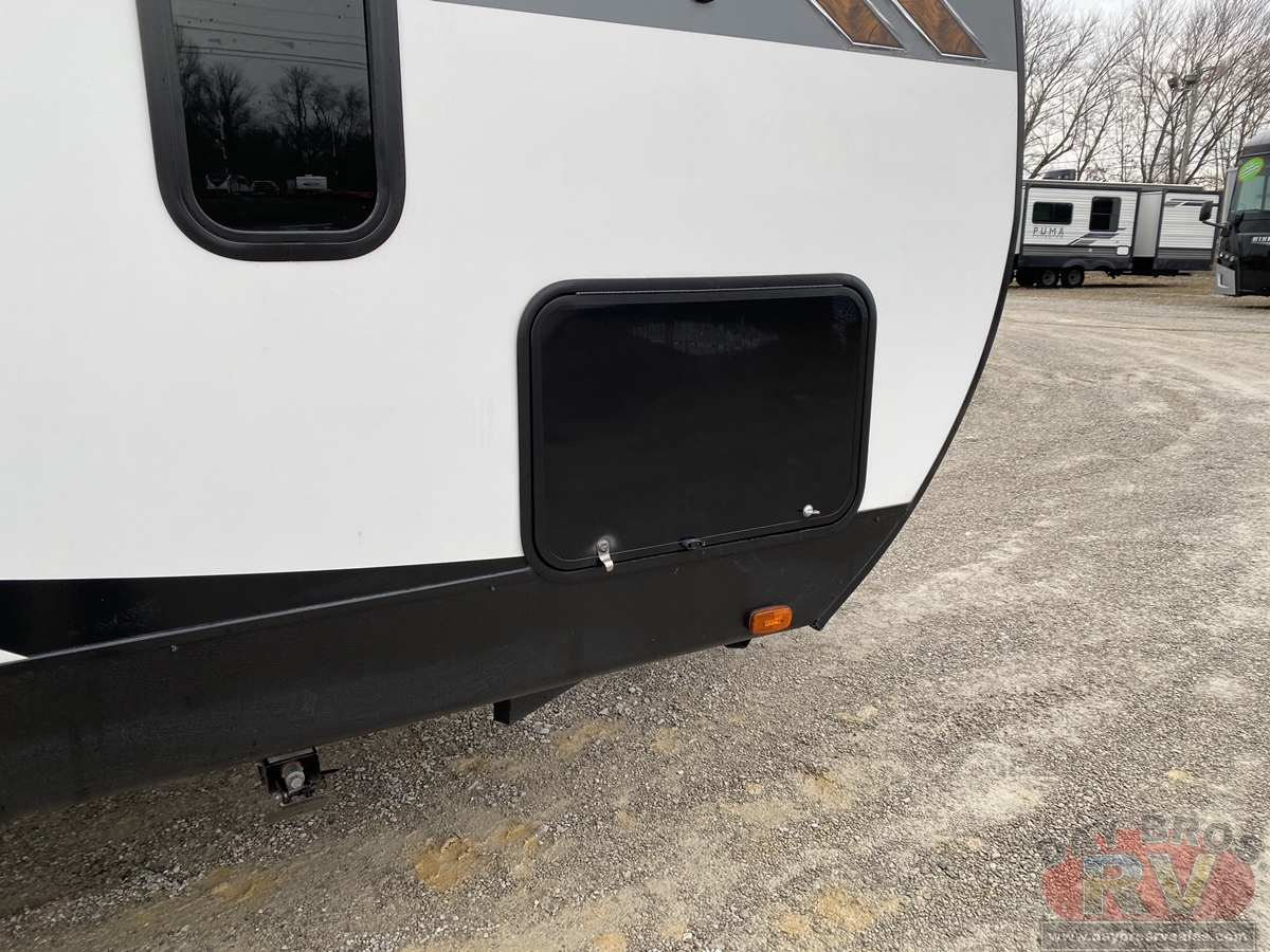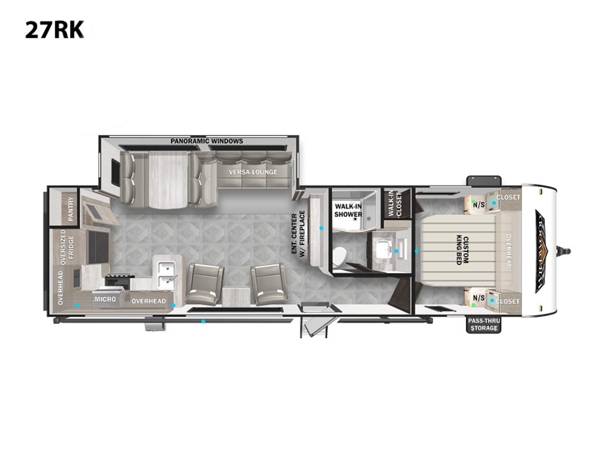 The 27RK stands out with its spacious kitchen and panoramic campsite windows. You will love the Versa-Lounge, which can reconfigure and customize according to your needs—and conveniently below is the Stow N Go Storage! This model also provides a fireplace (heater) and 11 CU. FT. refrigerator making you feel right at home.