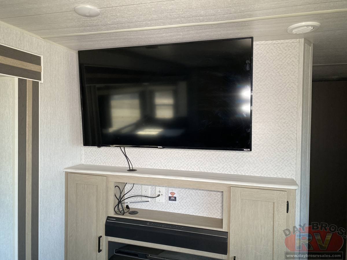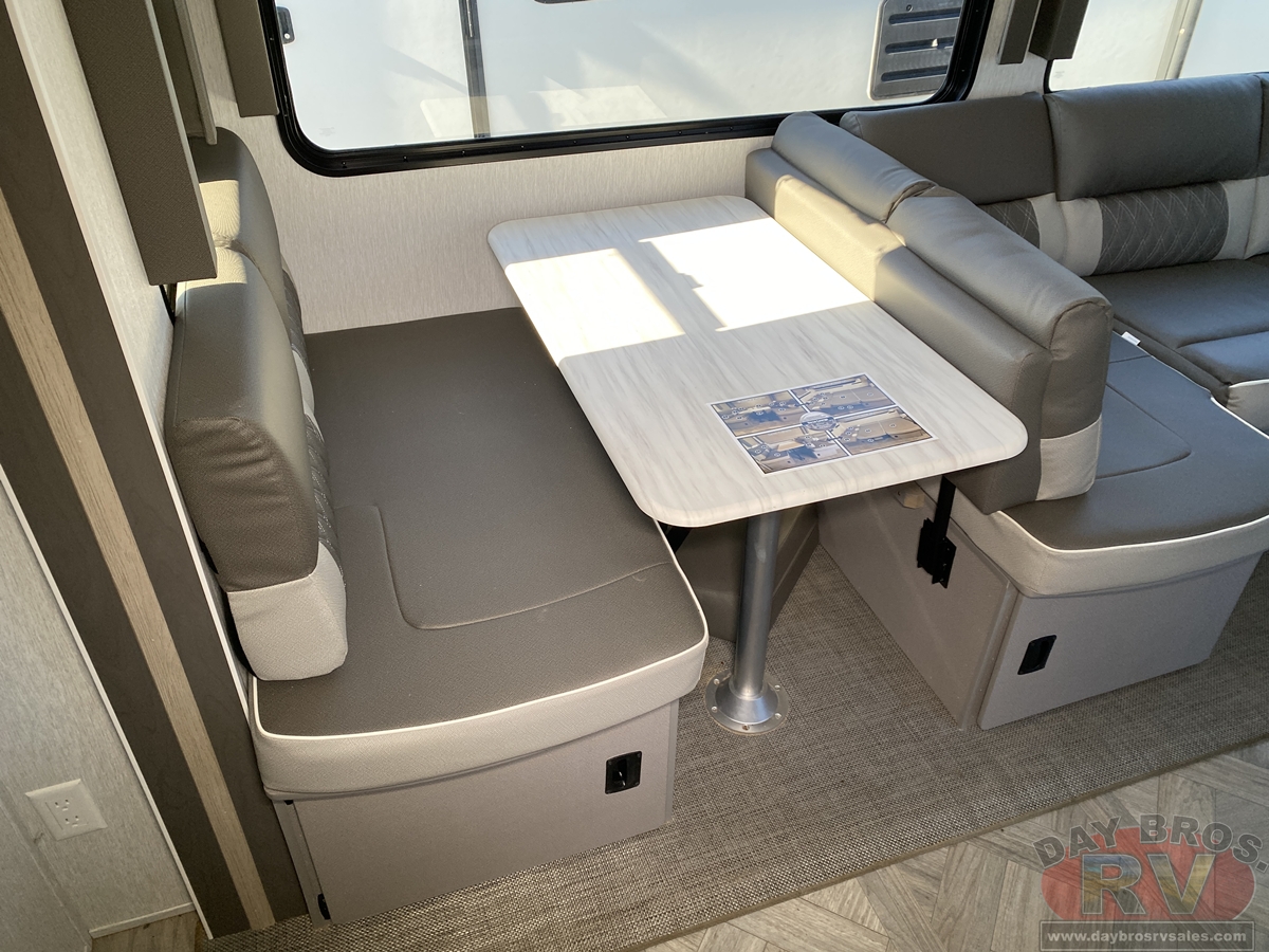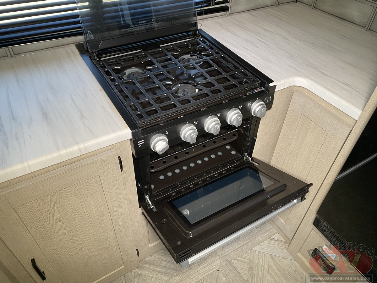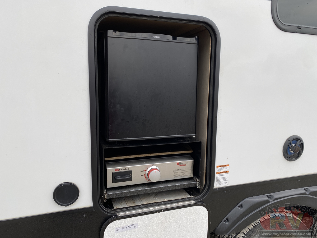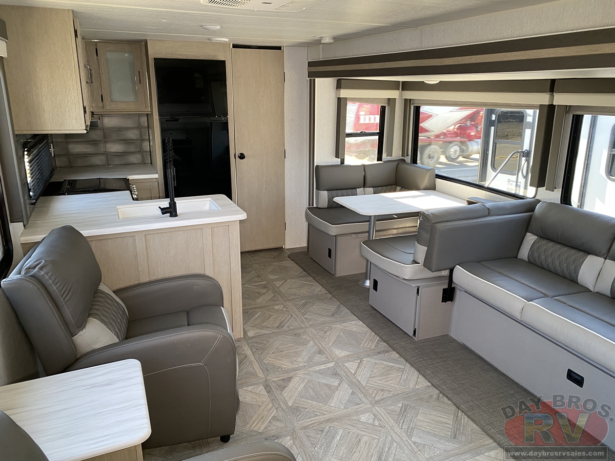 The 27RK stands out with its spacious kitchen and panoramic campsite windows. You will love the Versa-Lounge, which can reconfigure and customize according to your needs—and conveniently below is the Stow N Go Storage! This model also provides a fireplace (heater) and 11 CU. FT. refrigerator making you feel right at home.