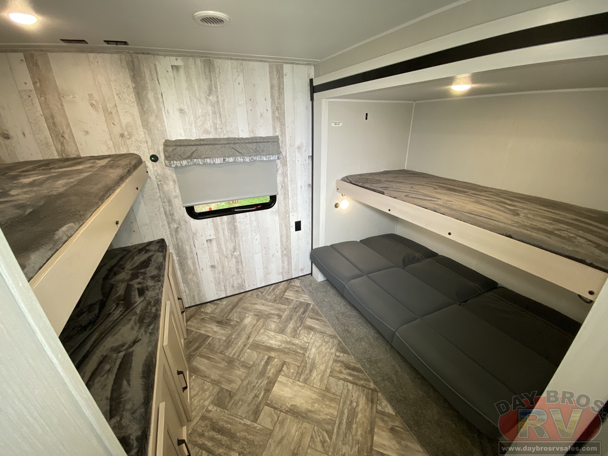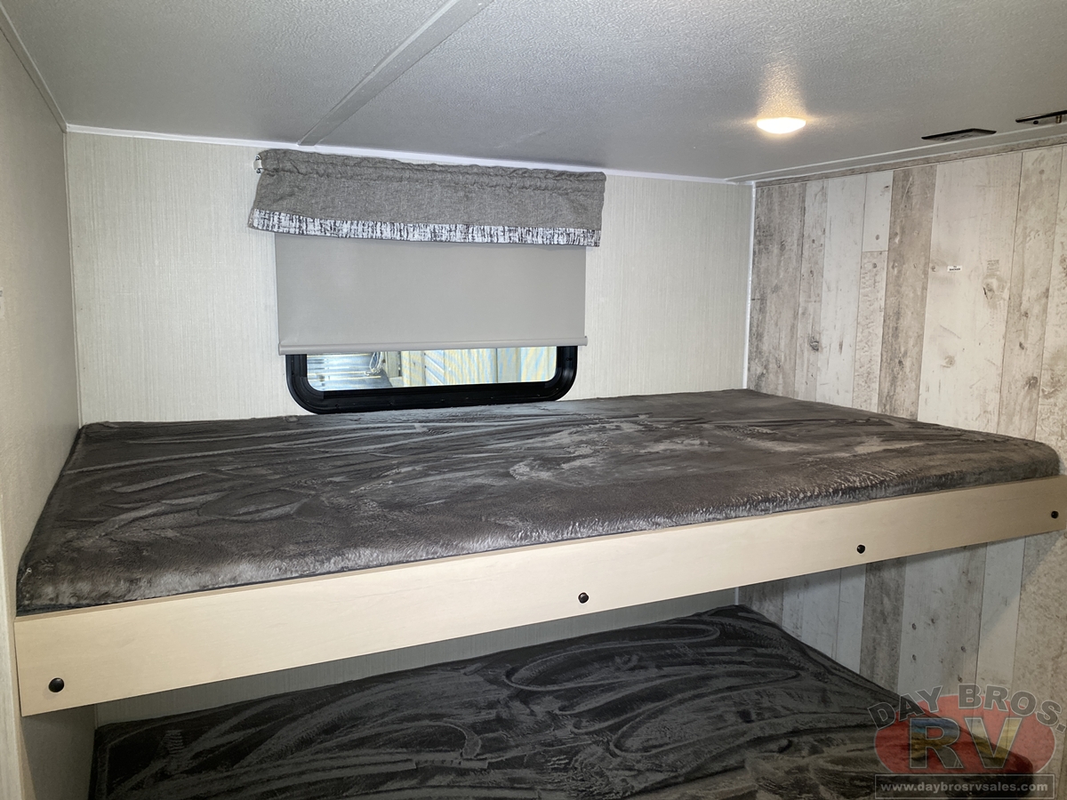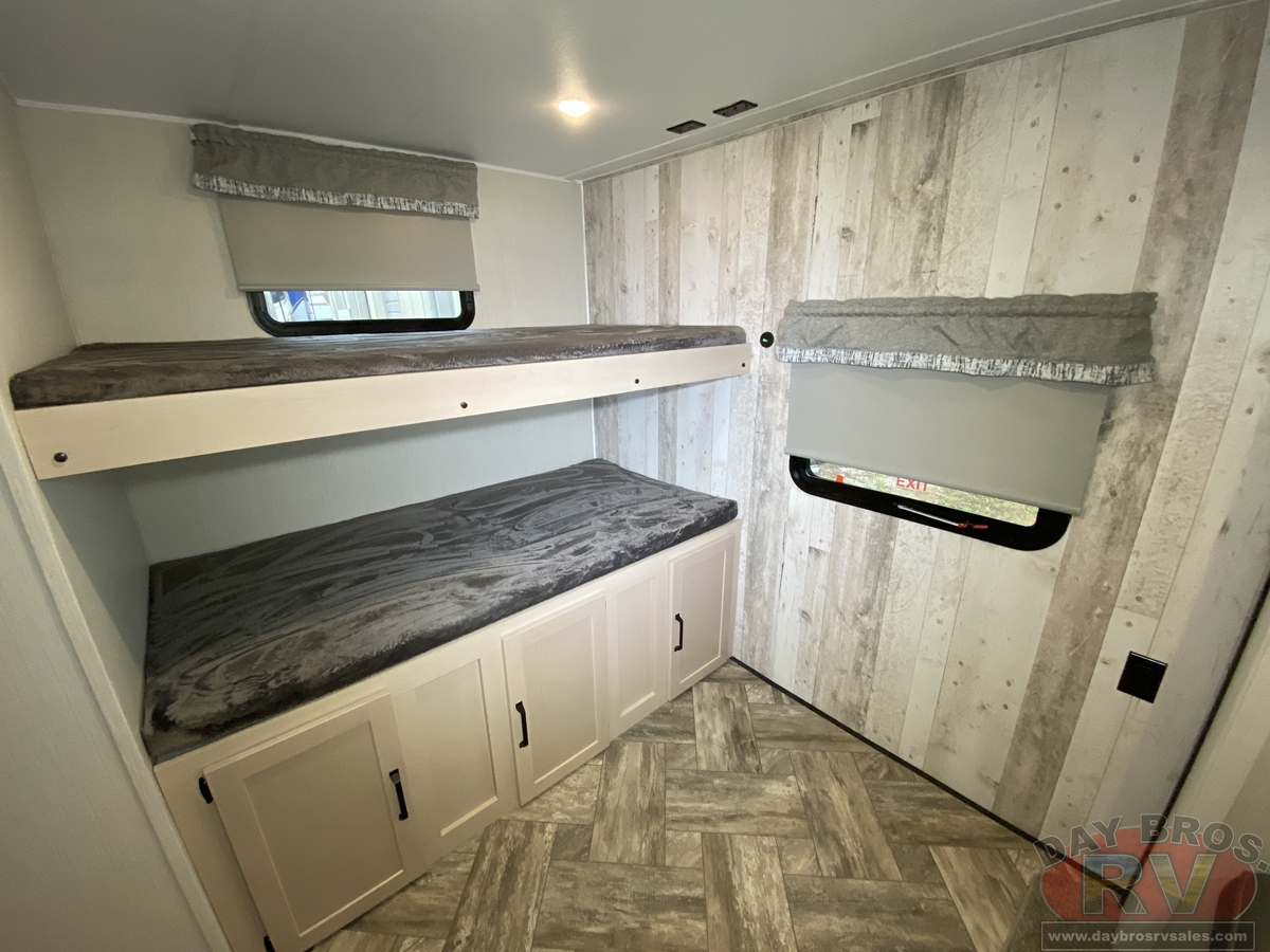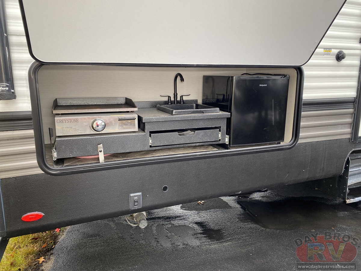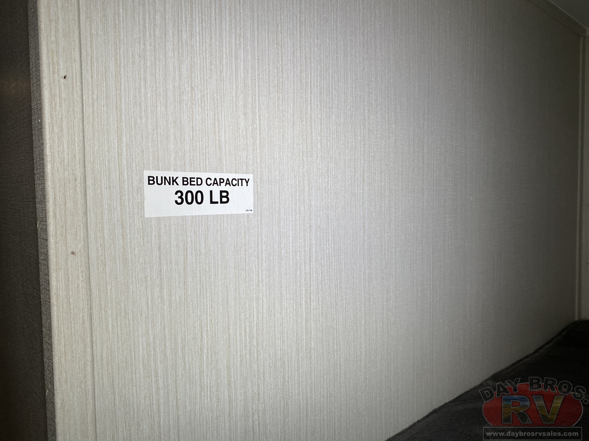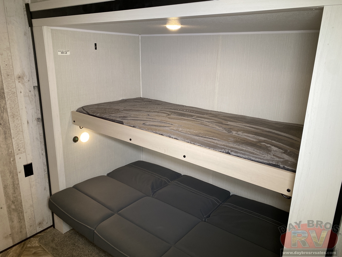 This bunk house travel trailer supplies you a great deal of space in the front bedroom. With a slide out and a large closet for all of your clothes, it will feel like your bedroom at home. The bunk house in the rear provides space for all guests to be comfortable and to make things a cut above, this floor plan provides two bathrooms. Furthermore, the exterior mini camp kitchen features a fridge and a griddle for those of you who like to cook in nature.