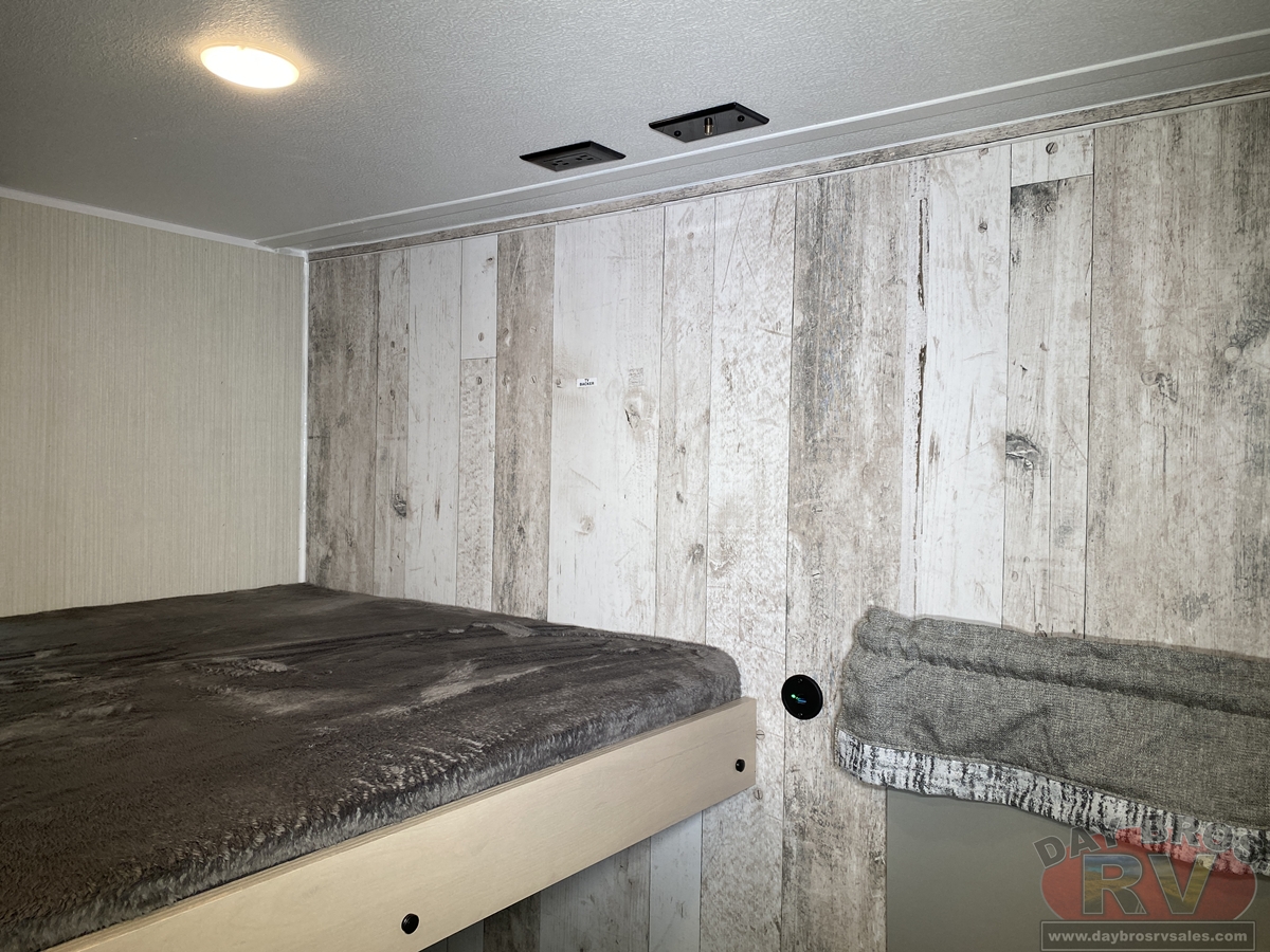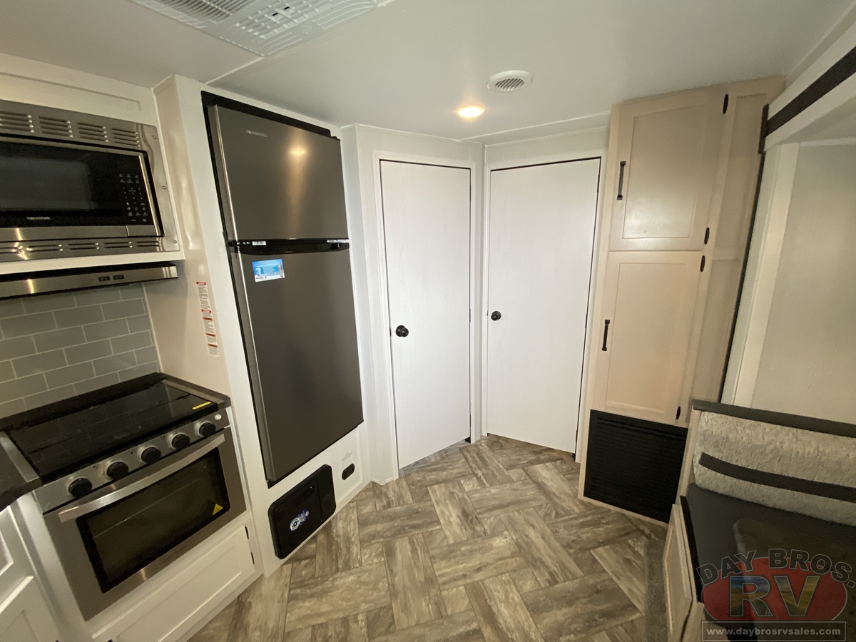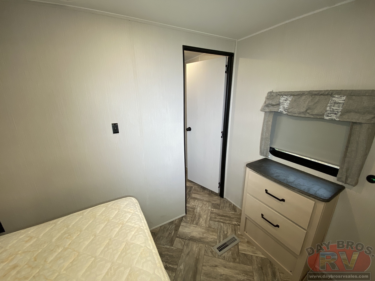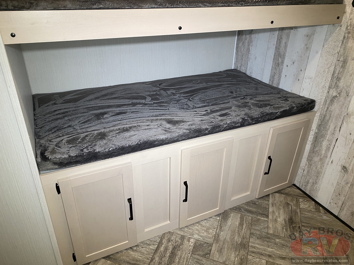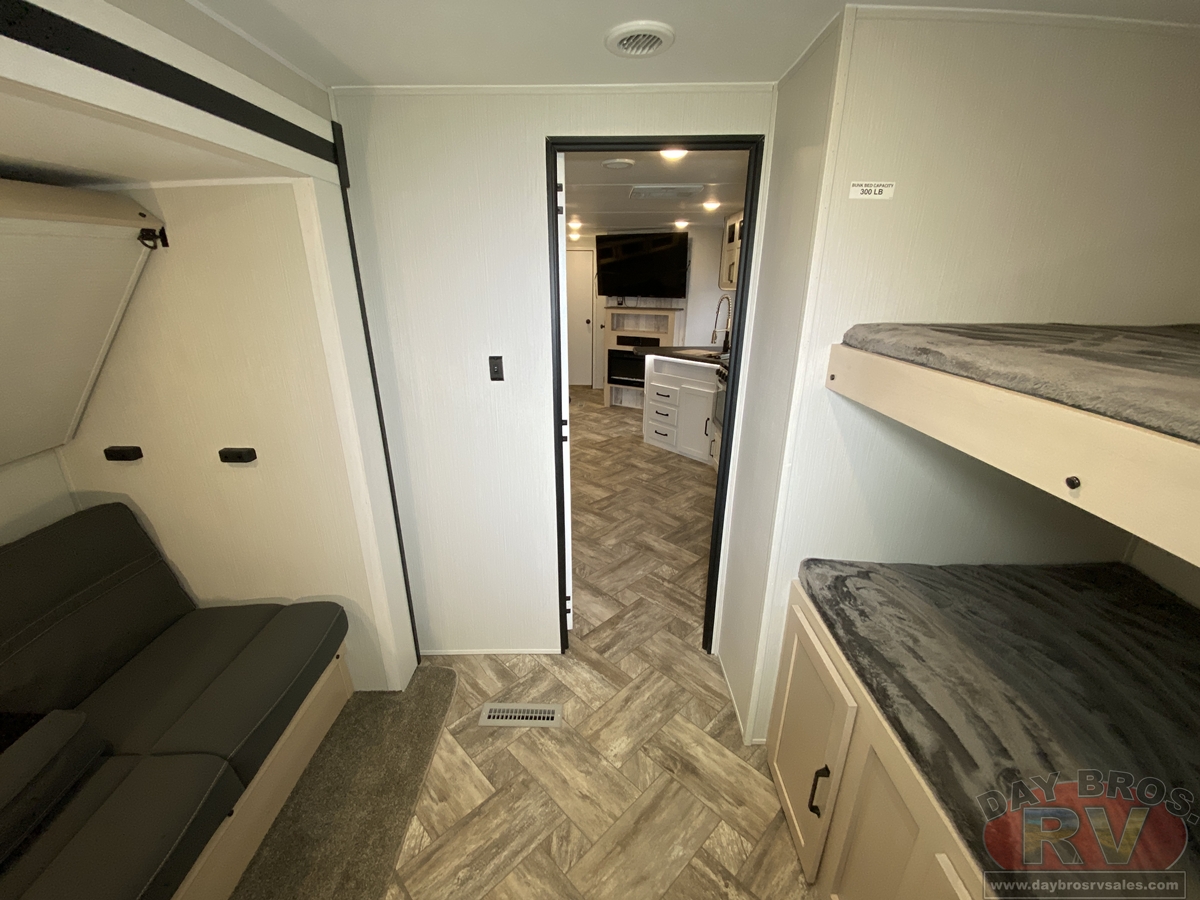 This bunk house travel trailer supplies you a great deal of space in the front bedroom. With a slide out and a large closet for all of your clothes, it will feel like your bedroom at home. The bunk house in the rear provides space for all guests to be comfortable and to make things a cut above, this floor plan provides two bathrooms. Furthermore, the exterior mini camp kitchen features a fridge and a griddle for those of you who like to cook in nature.