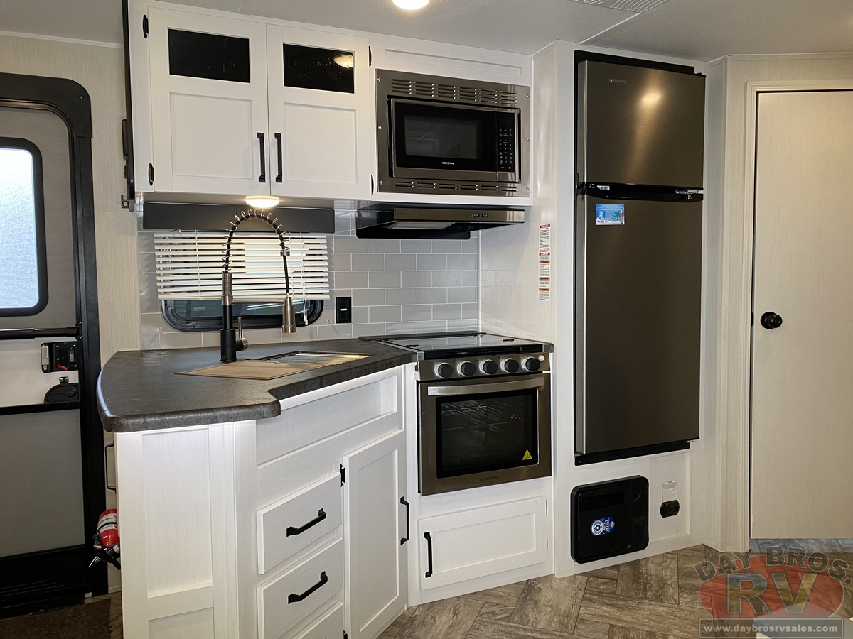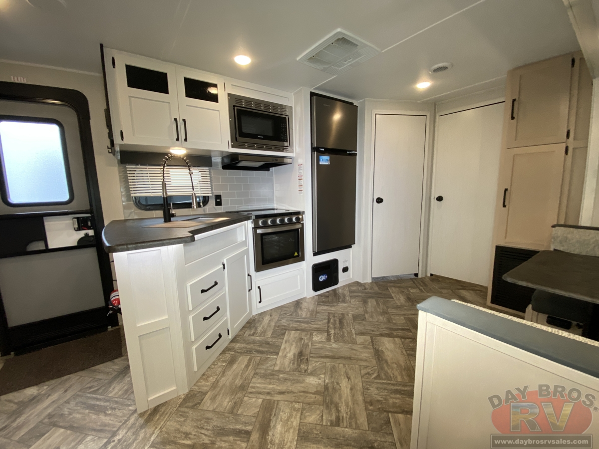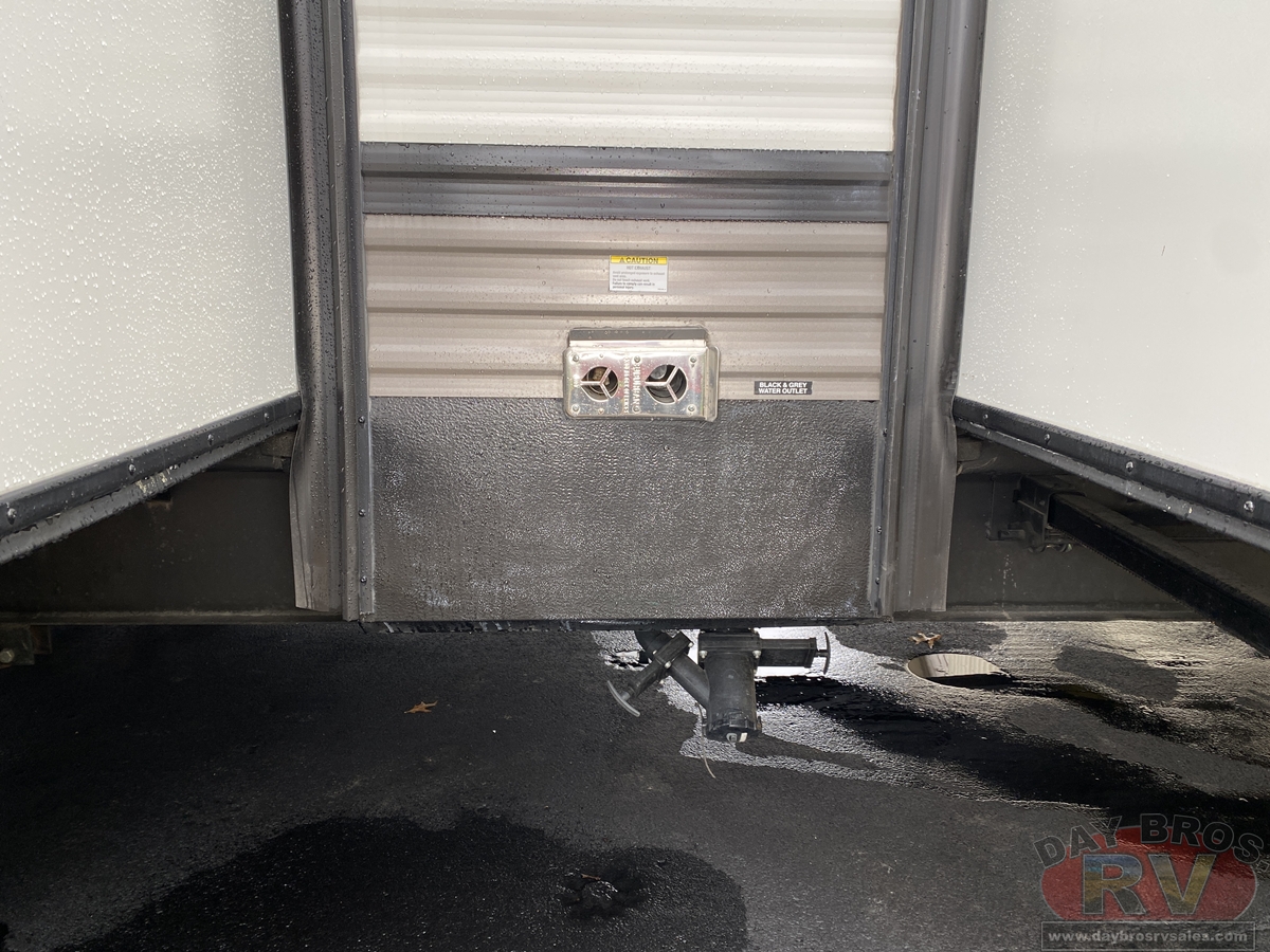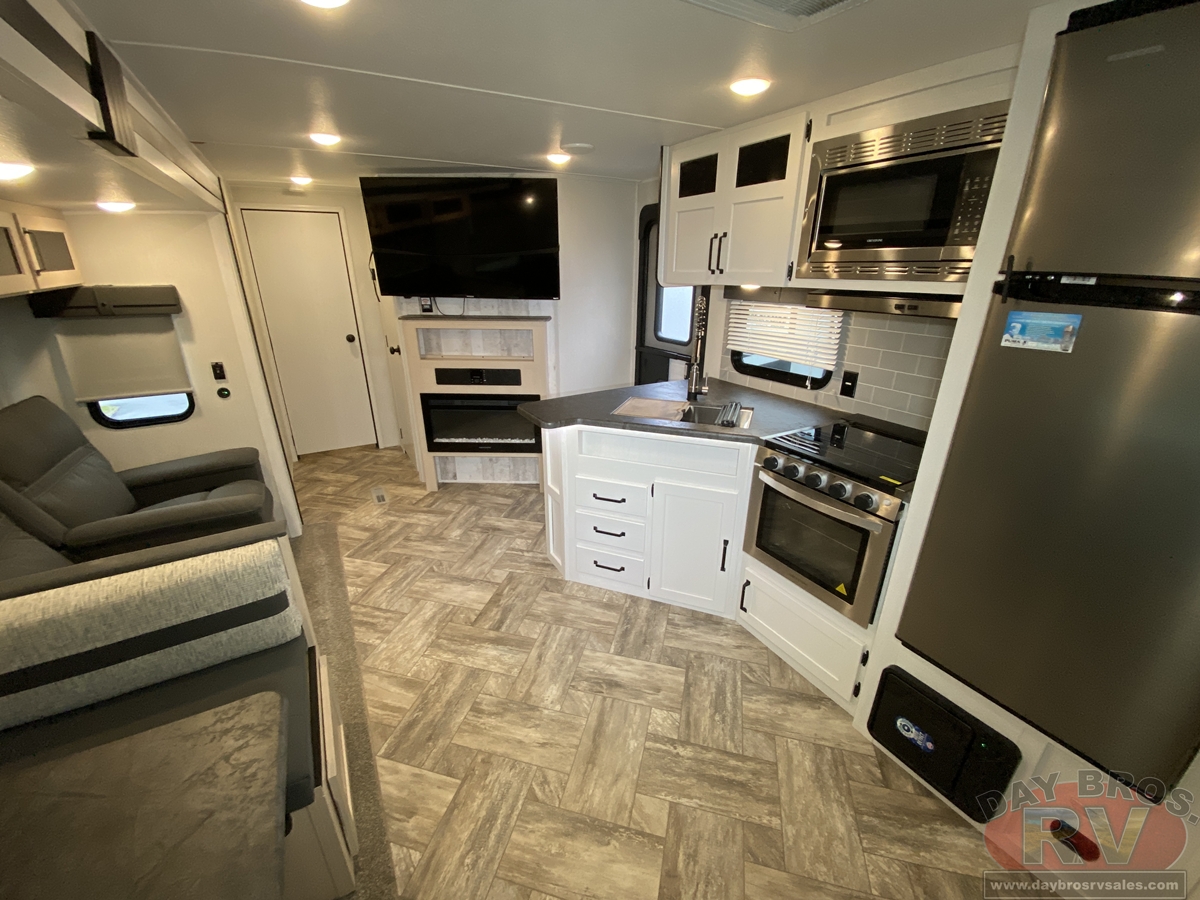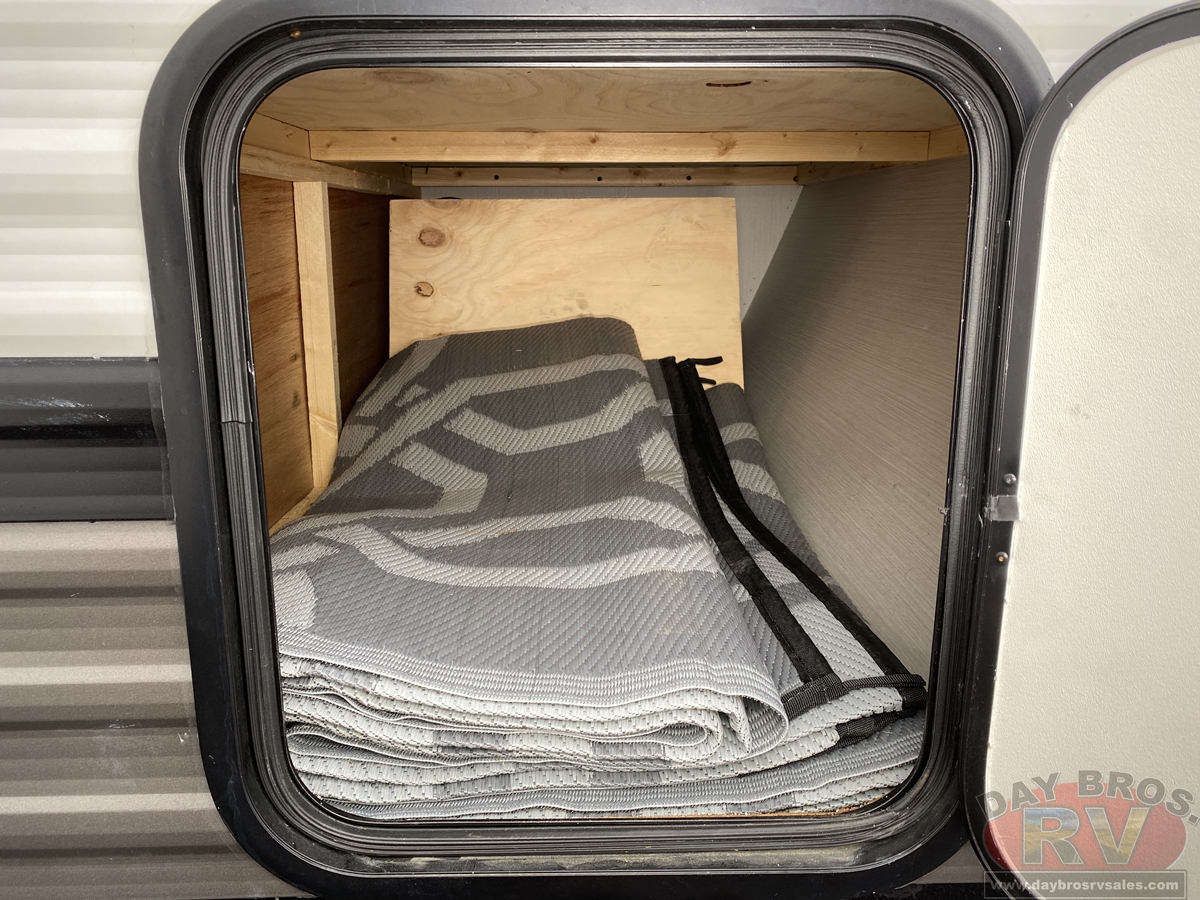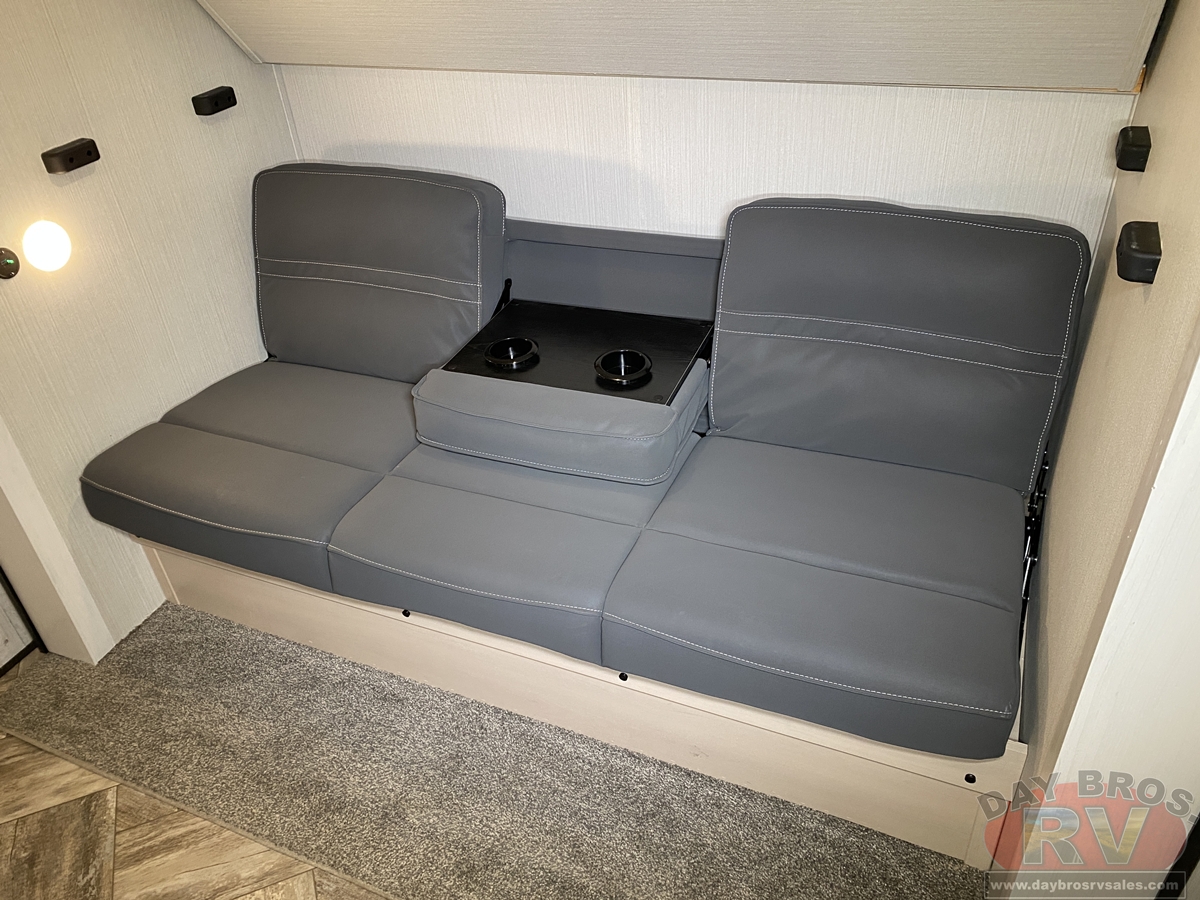 This bunk house travel trailer supplies you a great deal of space in the front bedroom. With a slide out and a large closet for all of your clothes, it will feel like your bedroom at home. The bunk house in the rear provides space for all guests to be comfortable and to make things a cut above, this floor plan provides two bathrooms. Furthermore, the exterior mini camp kitchen features a fridge and a griddle for those of you who like to cook in nature.
