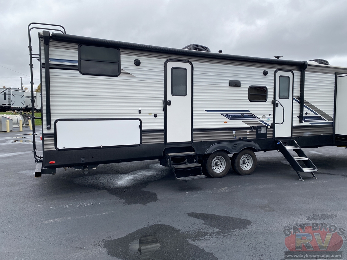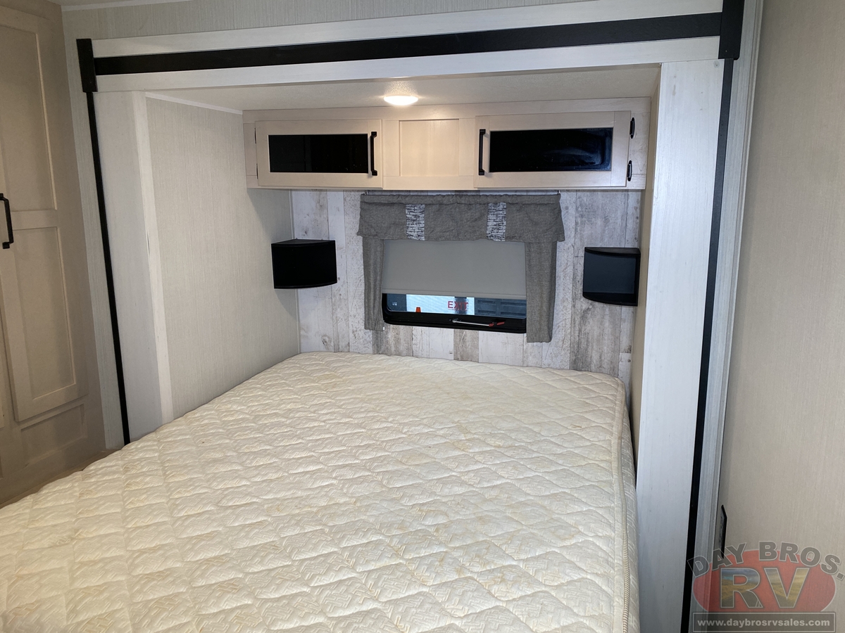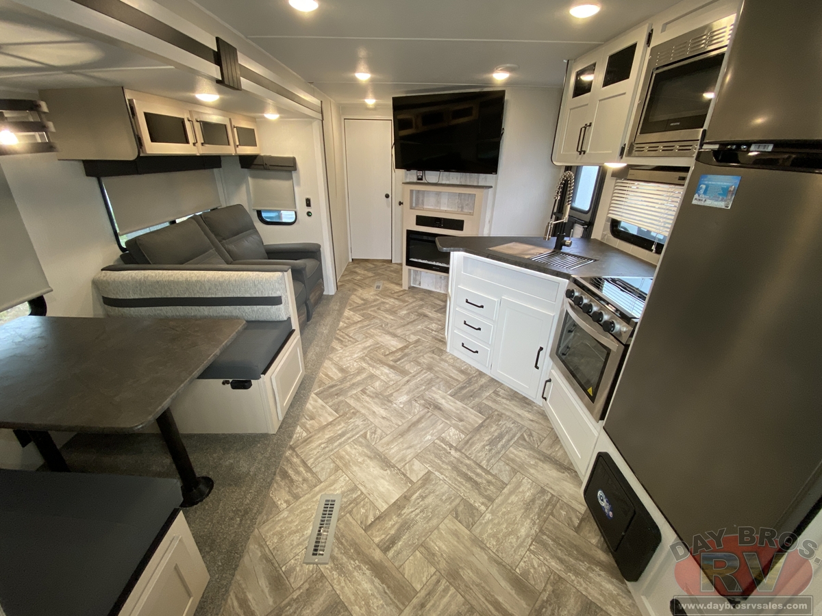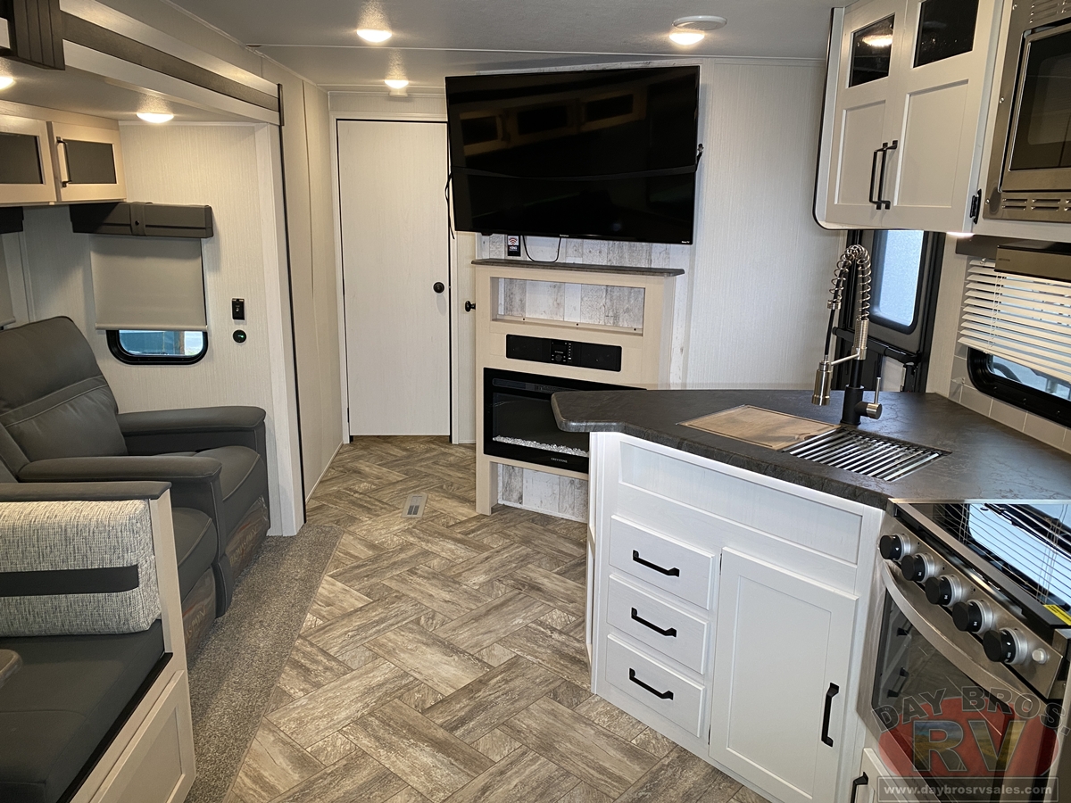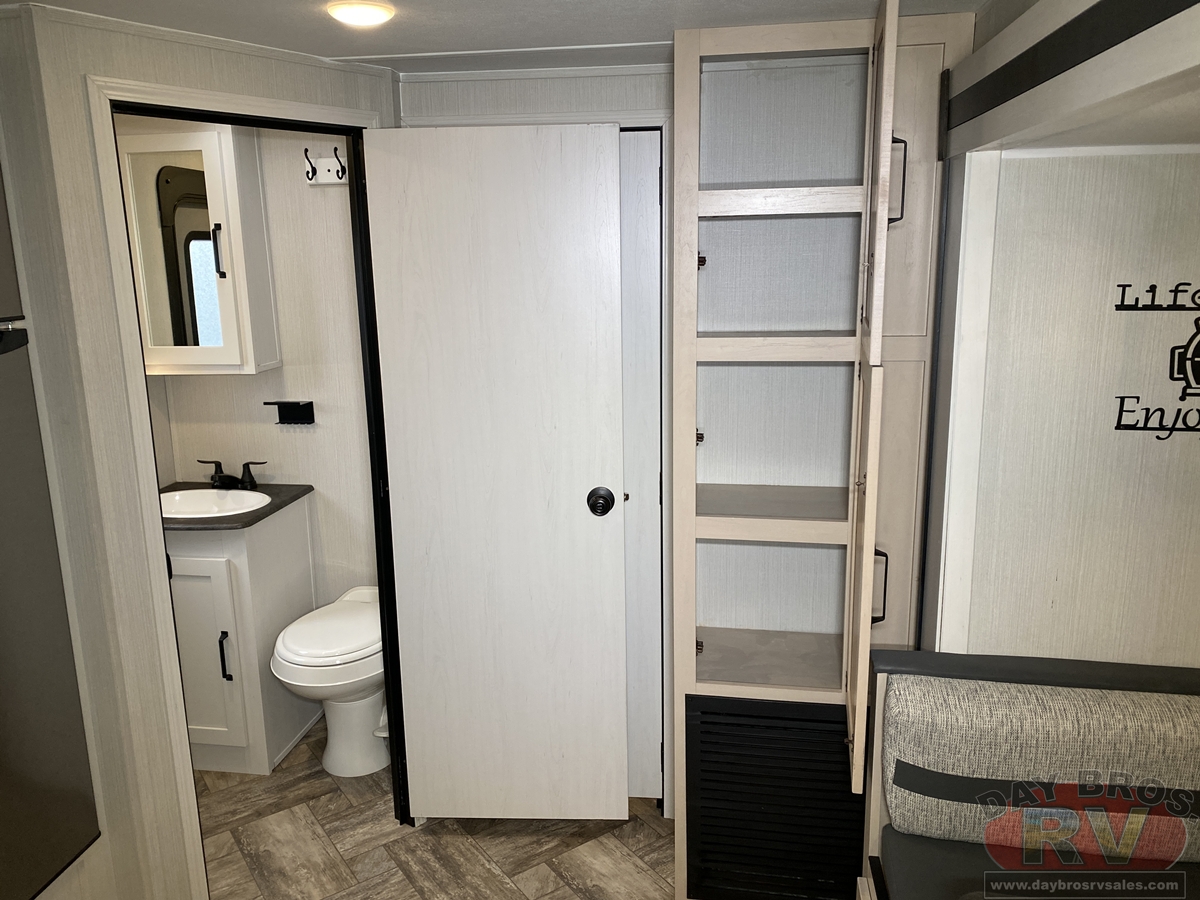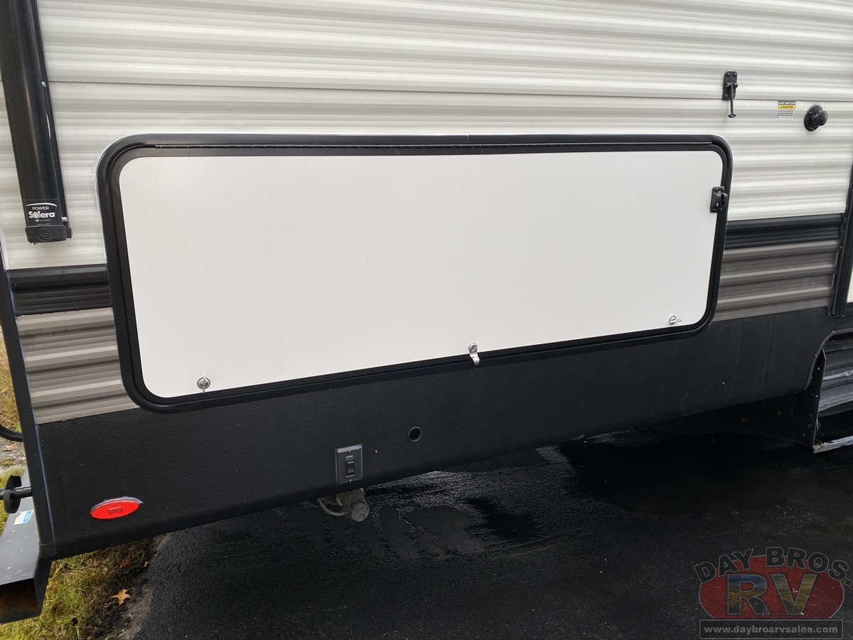 This bunk house travel trailer supplies you a great deal of space in the front bedroom. With a slide out and a large closet for all of your clothes, it will feel like your bedroom at home. The bunk house in the rear provides space for all guests to be comfortable and to make things a cut above, this floor plan provides two bathrooms. Furthermore, the exterior mini camp kitchen features a fridge and a griddle for those of you who like to cook in nature.