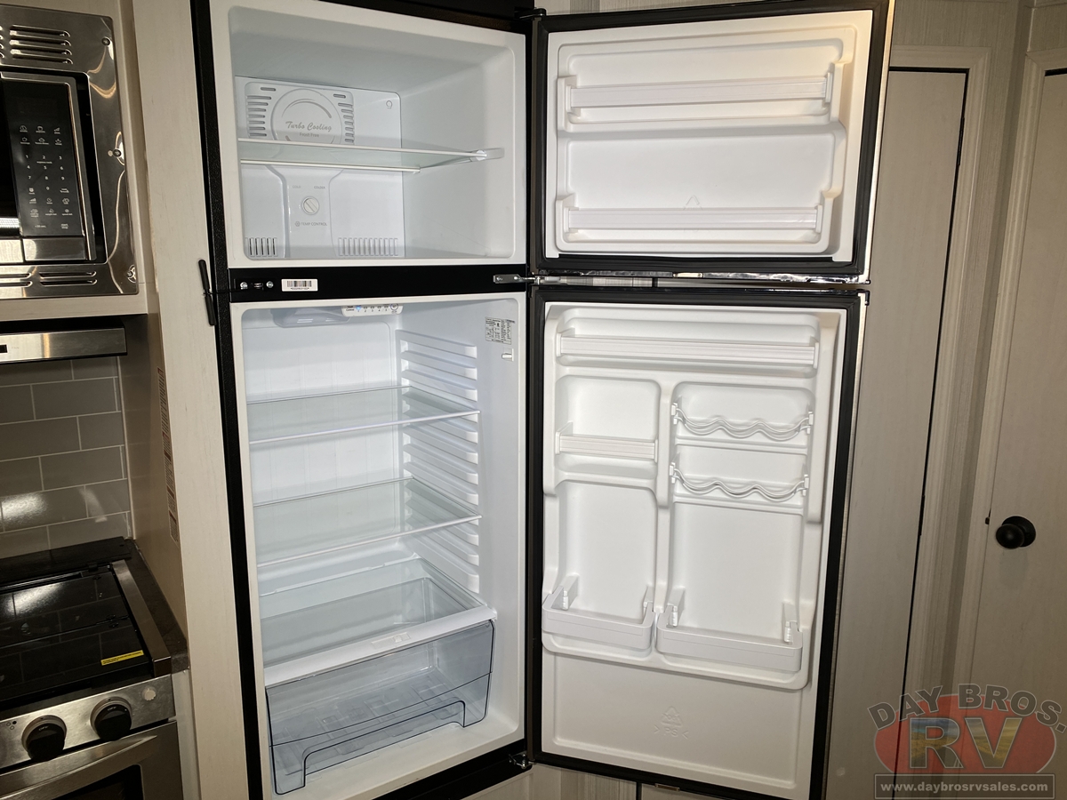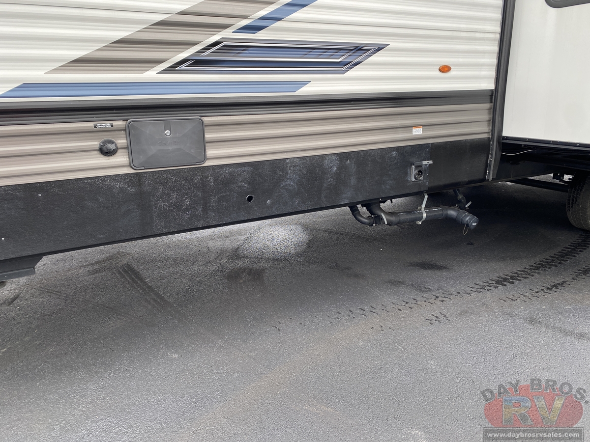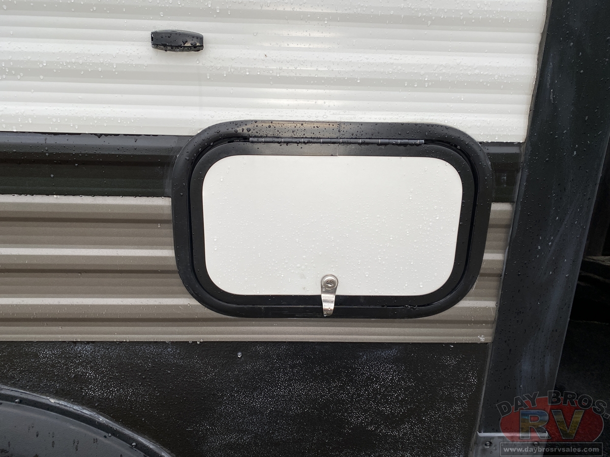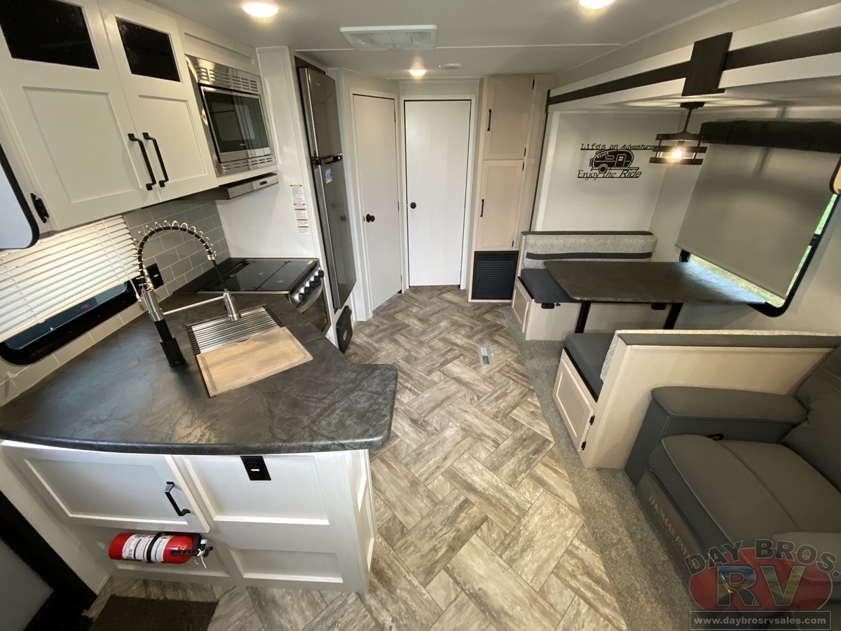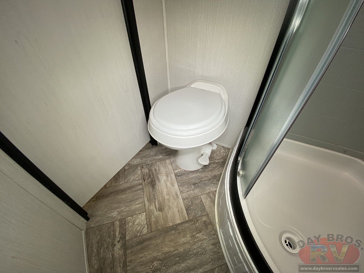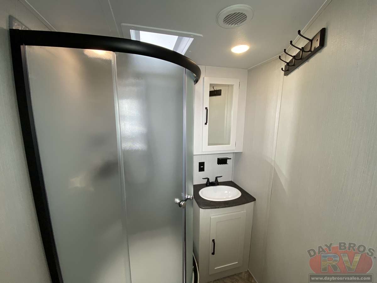 This bunk house travel trailer supplies you a great deal of space in the front bedroom. With a slide out and a large closet for all of your clothes, it will feel like your bedroom at home. The bunk house in the rear provides space for all guests to be comfortable and to make things a cut above, this floor plan provides two bathrooms. Furthermore, the exterior mini camp kitchen features a fridge and a griddle for those of you who like to cook in nature.