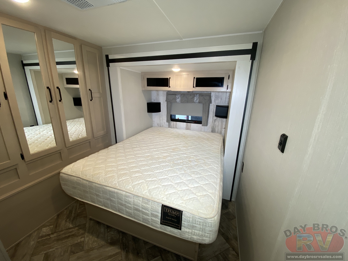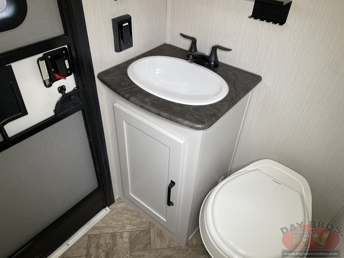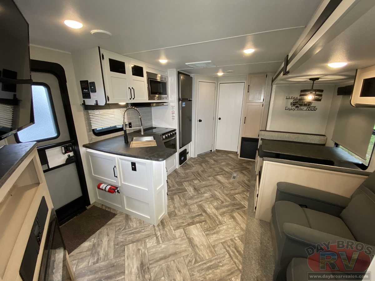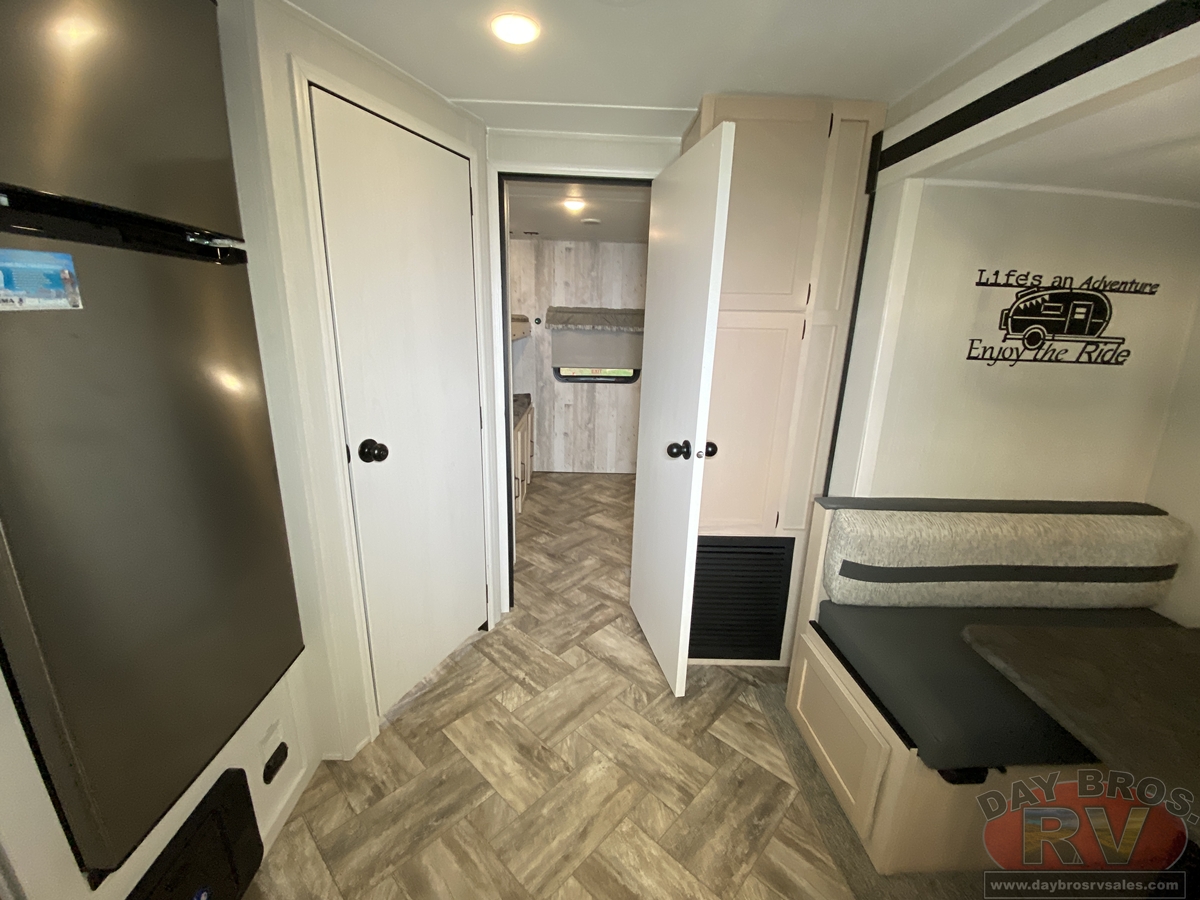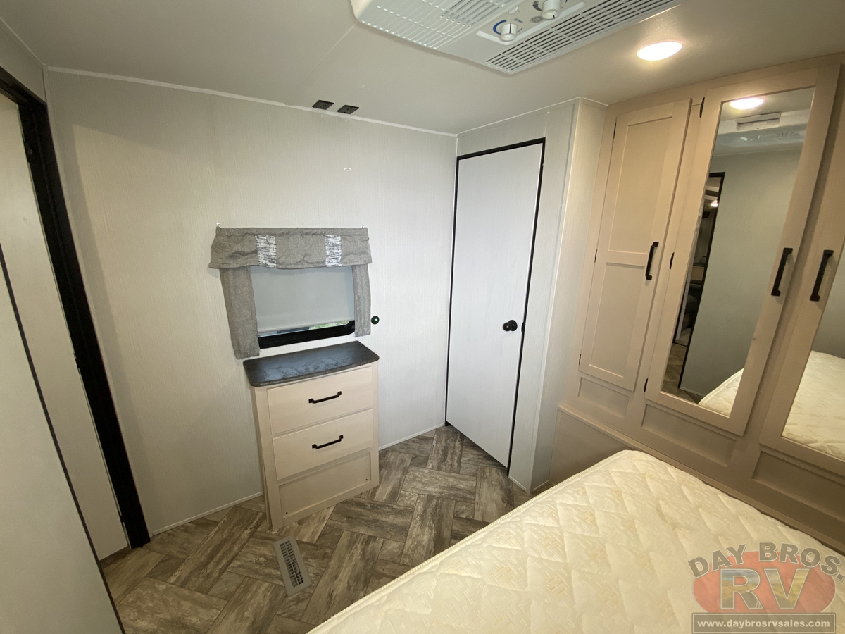 This bunk house travel trailer supplies you a great deal of space in the front bedroom. With a slide out and a large closet for all of your clothes, it will feel like your bedroom at home. The bunk house in the rear provides space for all guests to be comfortable and to make things a cut above, this floor plan provides two bathrooms. Furthermore, the exterior mini camp kitchen features a fridge and a griddle for those of you who like to cook in nature.