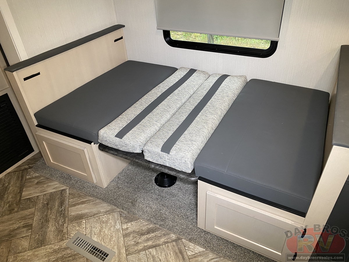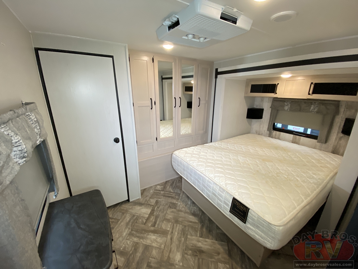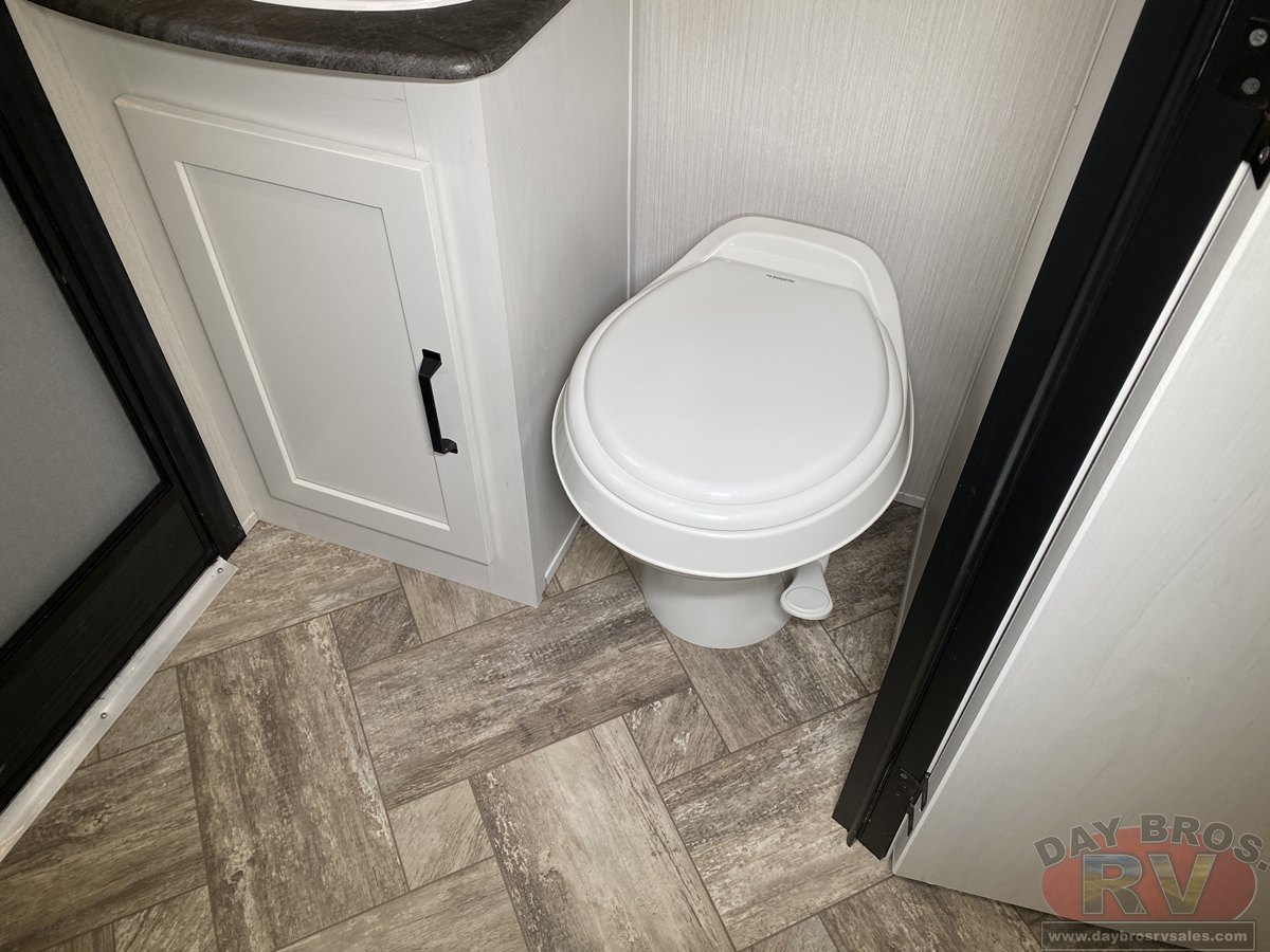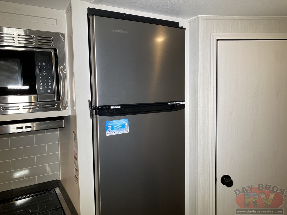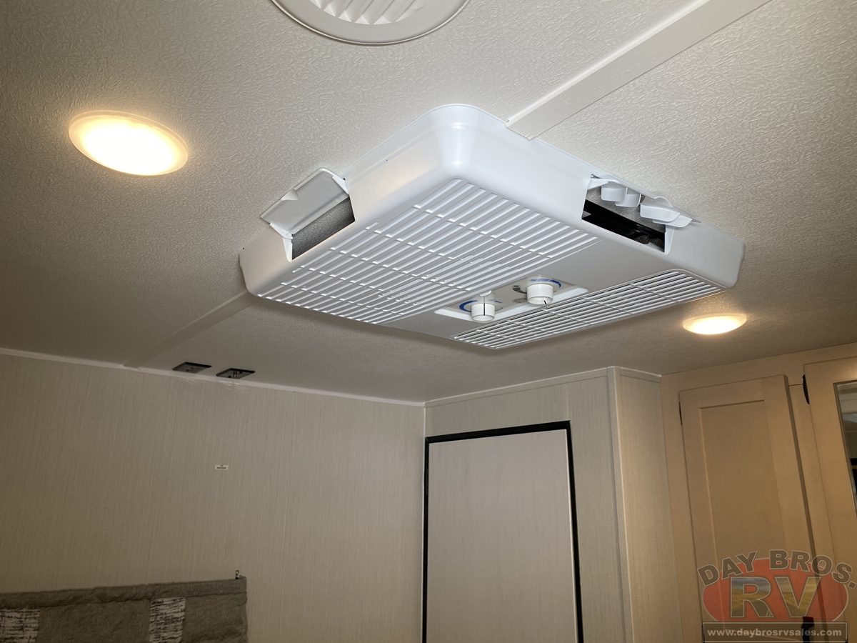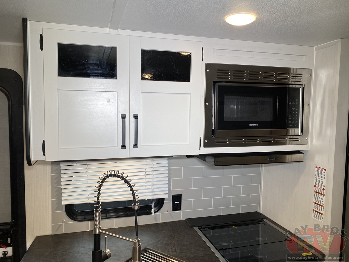 This bunk house travel trailer supplies you a great deal of space in the front bedroom. With a slide out and a large closet for all of your clothes, it will feel like your bedroom at home. The bunk house in the rear provides space for all guests to be comfortable and to make things a cut above, this floor plan provides two bathrooms. Furthermore, the exterior mini camp kitchen features a fridge and a griddle for those of you who like to cook in nature.