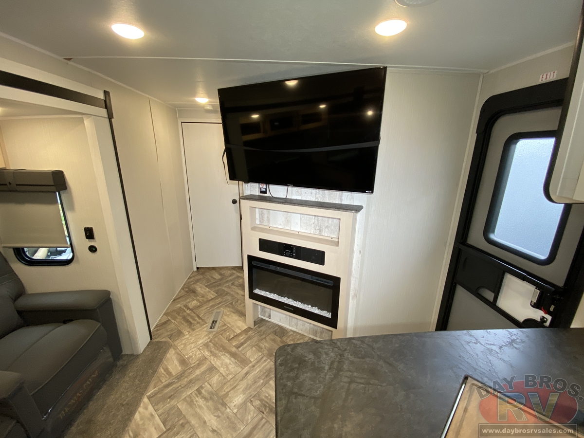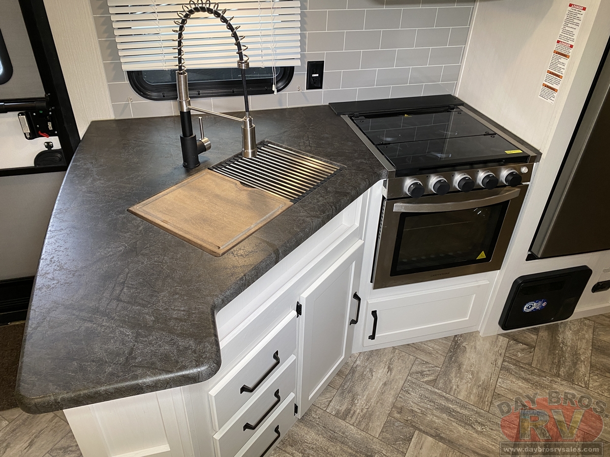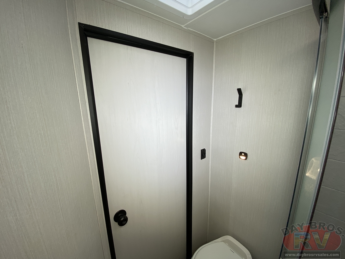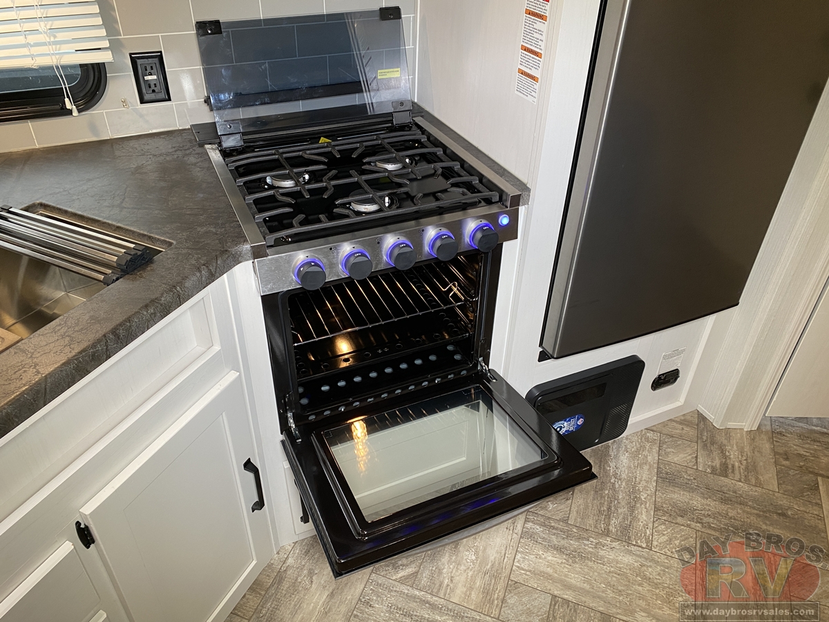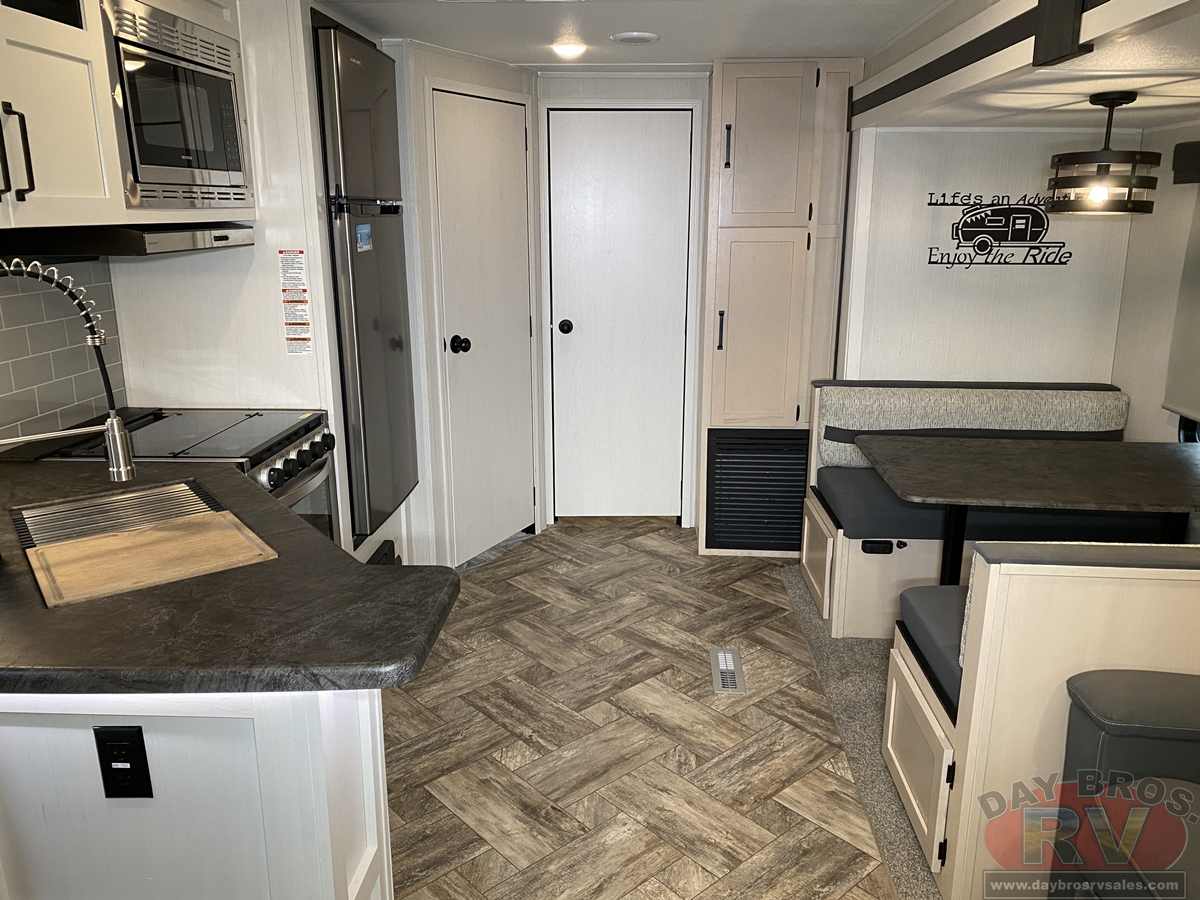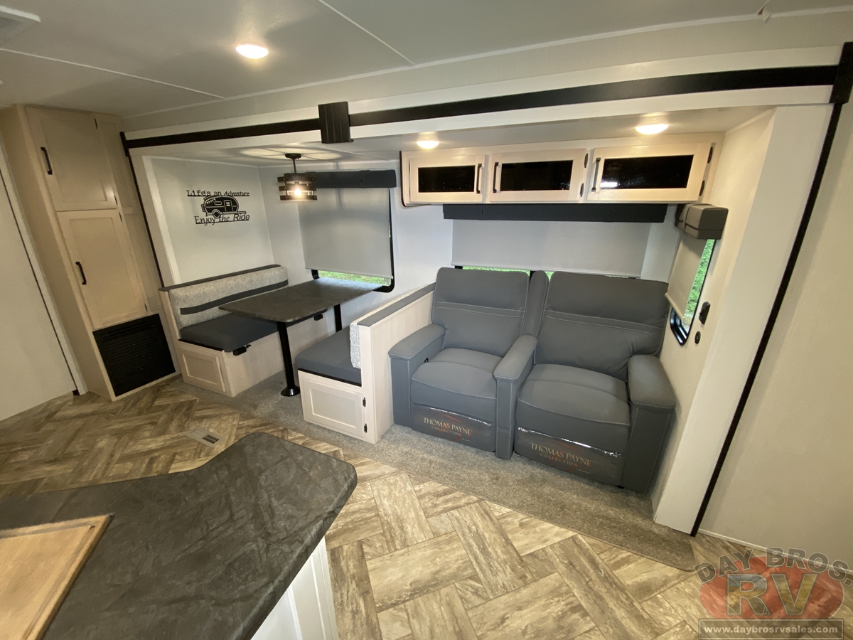 This bunk house travel trailer supplies you a great deal of space in the front bedroom. With a slide out and a large closet for all of your clothes, it will feel like your bedroom at home. The bunk house in the rear provides space for all guests to be comfortable and to make things a cut above, this floor plan provides two bathrooms. Furthermore, the exterior mini camp kitchen features a fridge and a griddle for those of you who like to cook in nature.