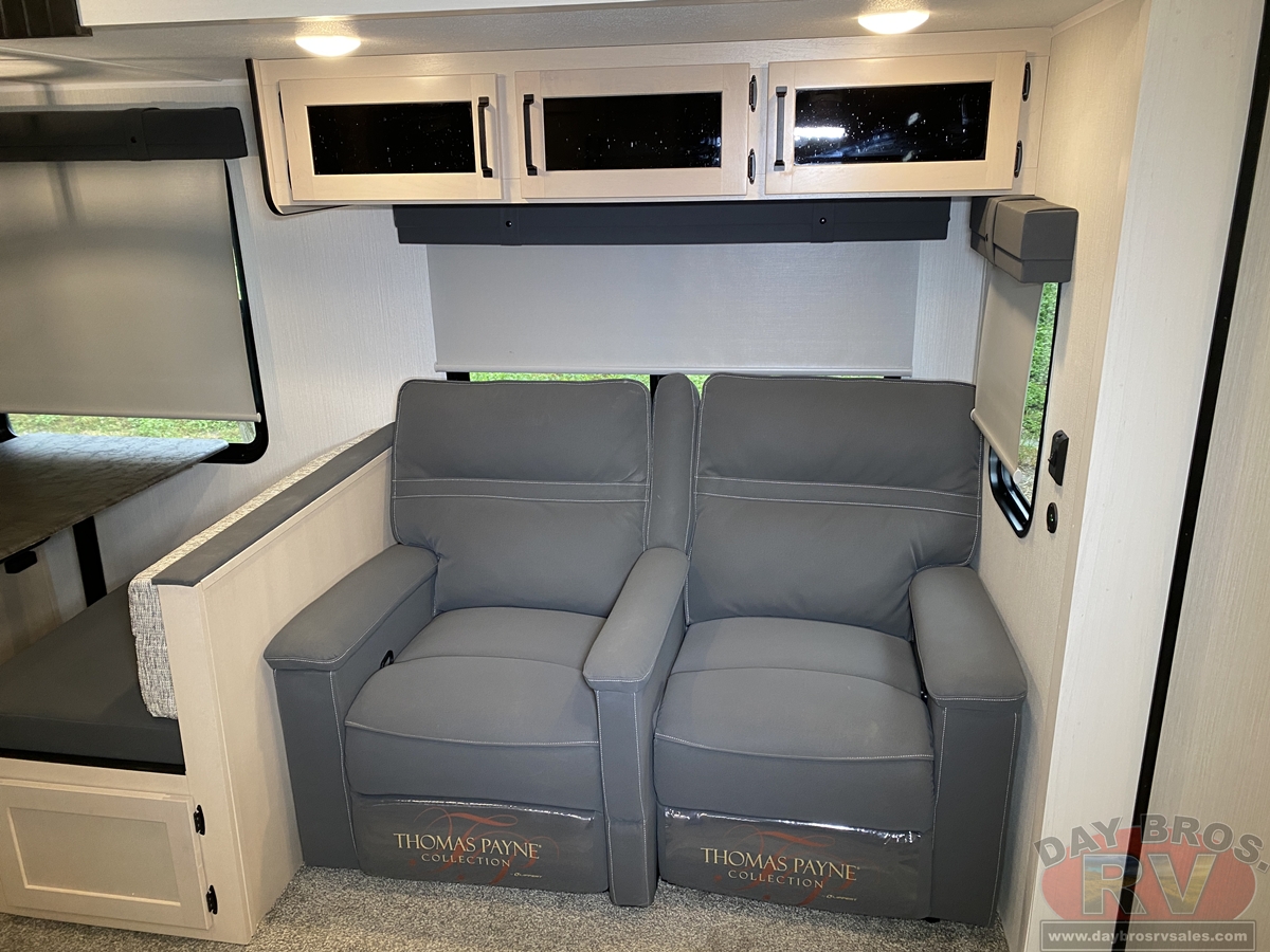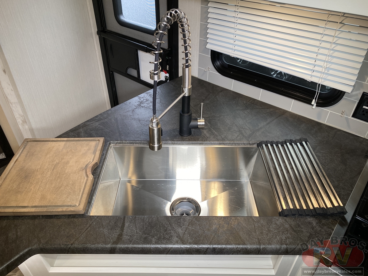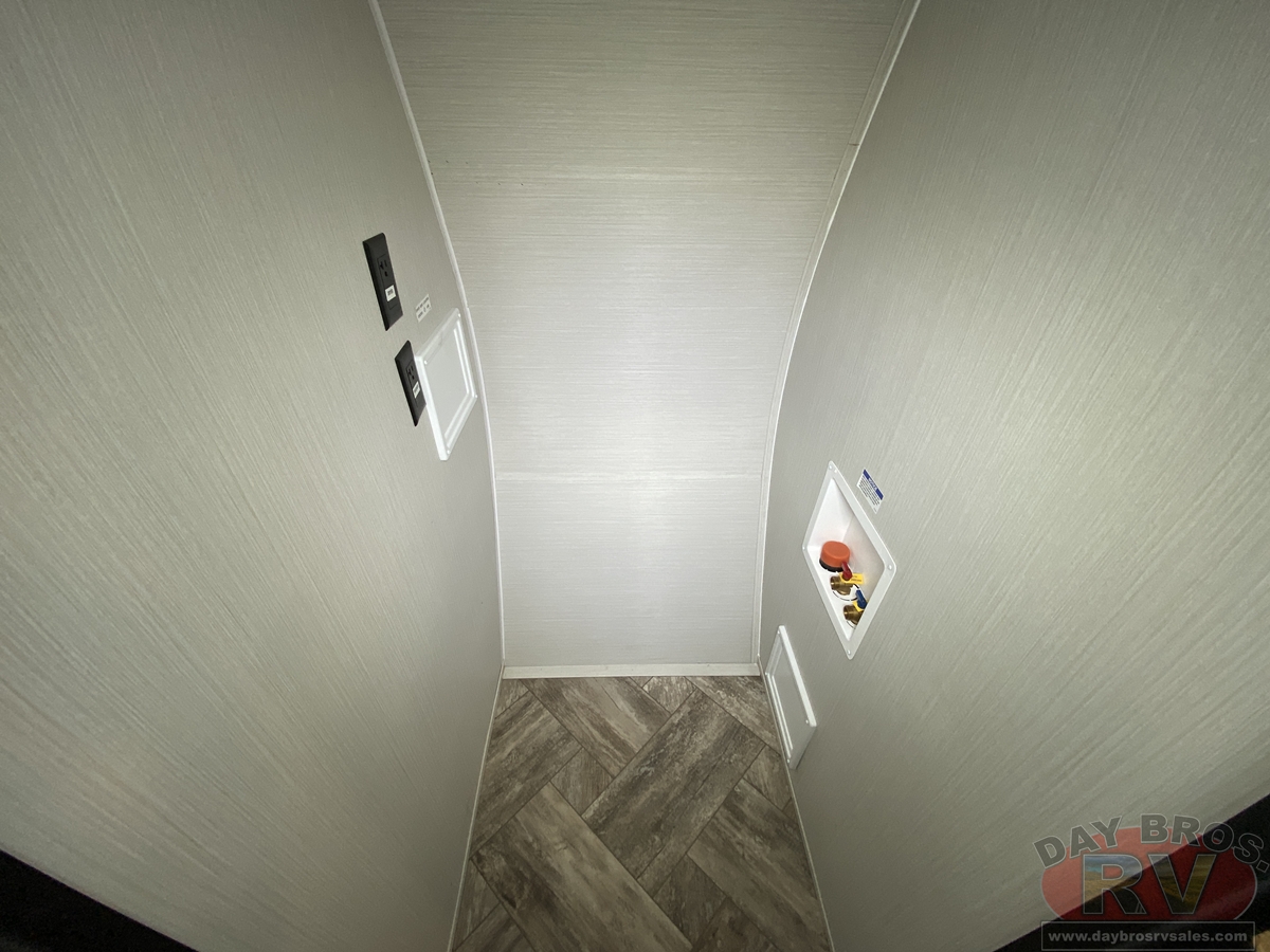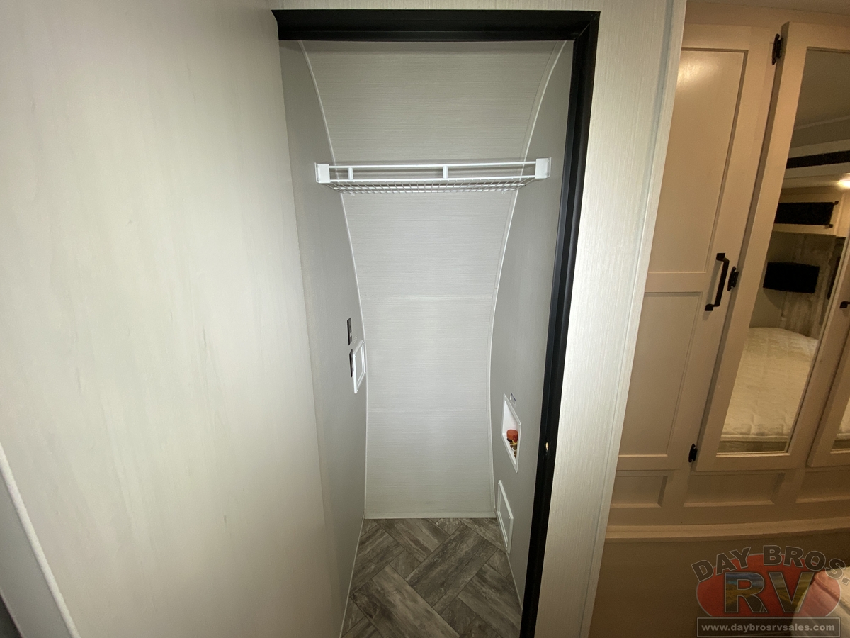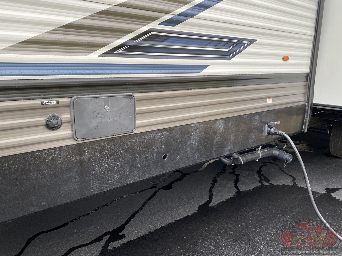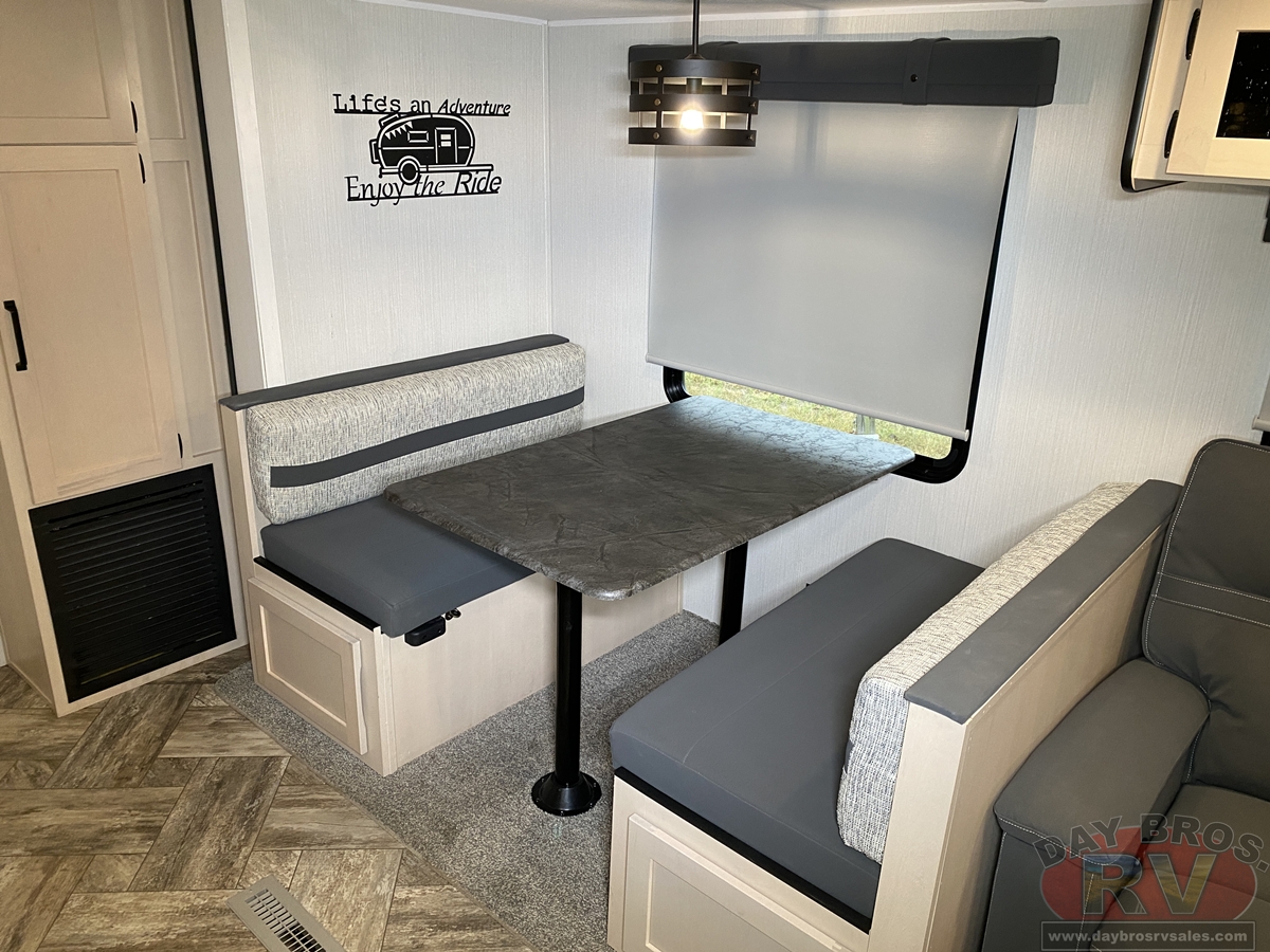 This bunk house travel trailer supplies you a great deal of space in the front bedroom. With a slide out and a large closet for all of your clothes, it will feel like your bedroom at home. The bunk house in the rear provides space for all guests to be comfortable and to make things a cut above, this floor plan provides two bathrooms. Furthermore, the exterior mini camp kitchen features a fridge and a griddle for those of you who like to cook in nature.