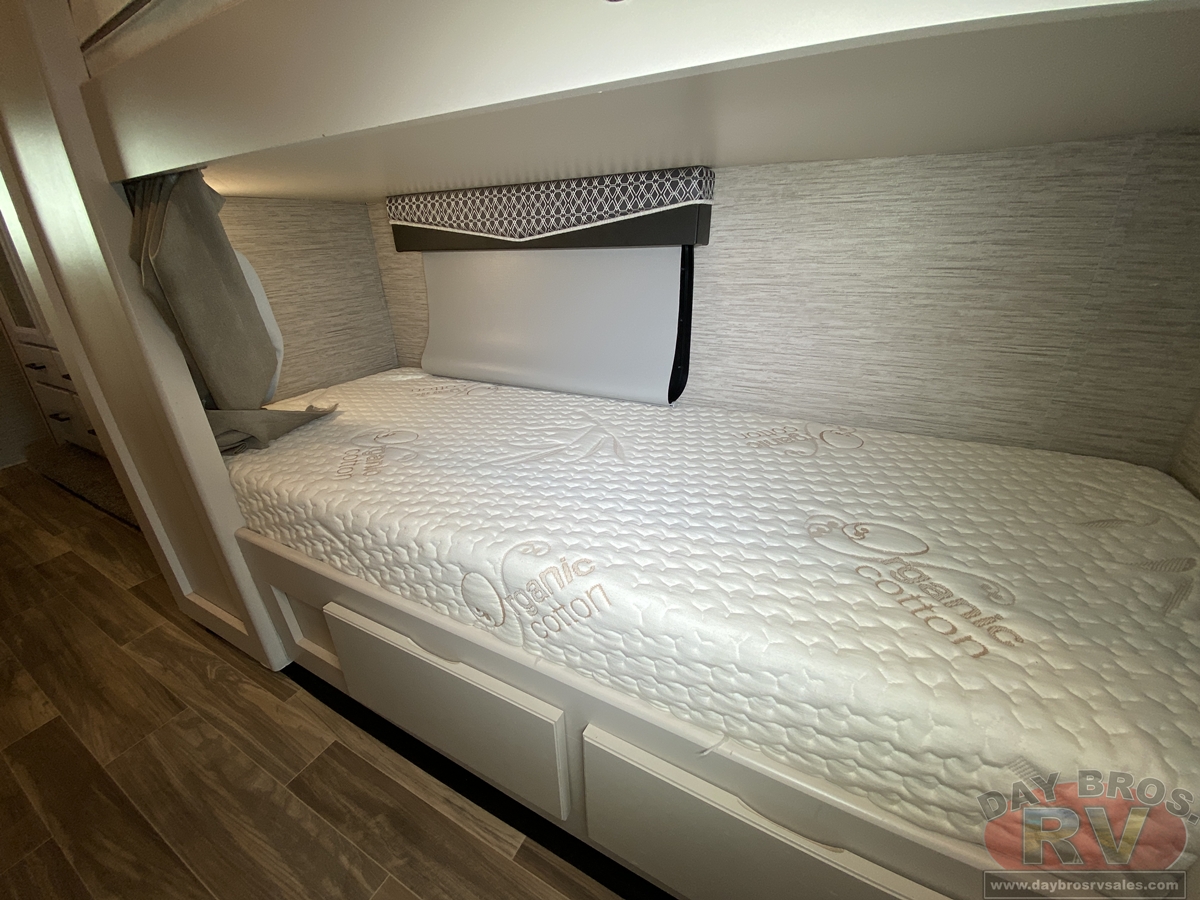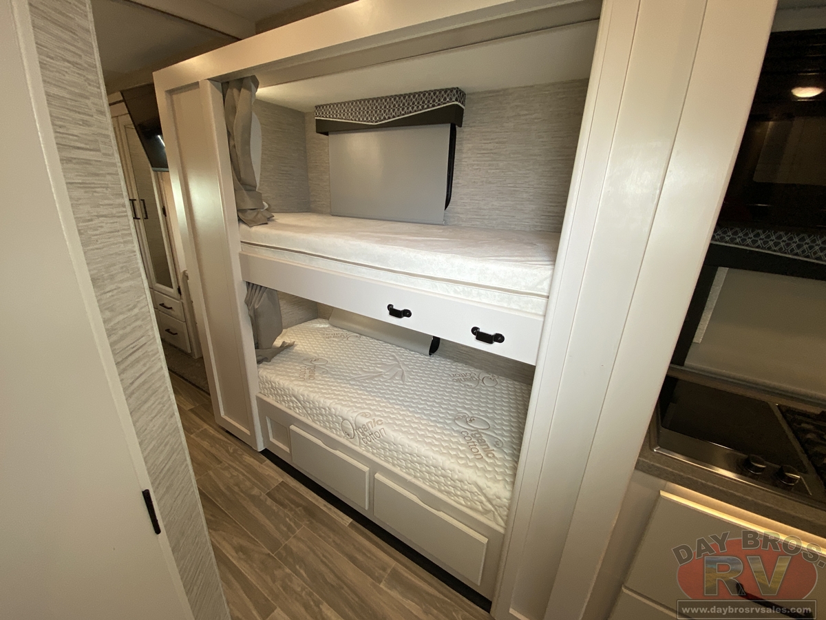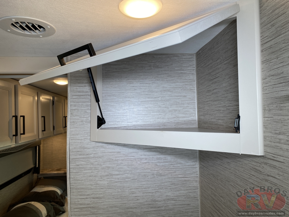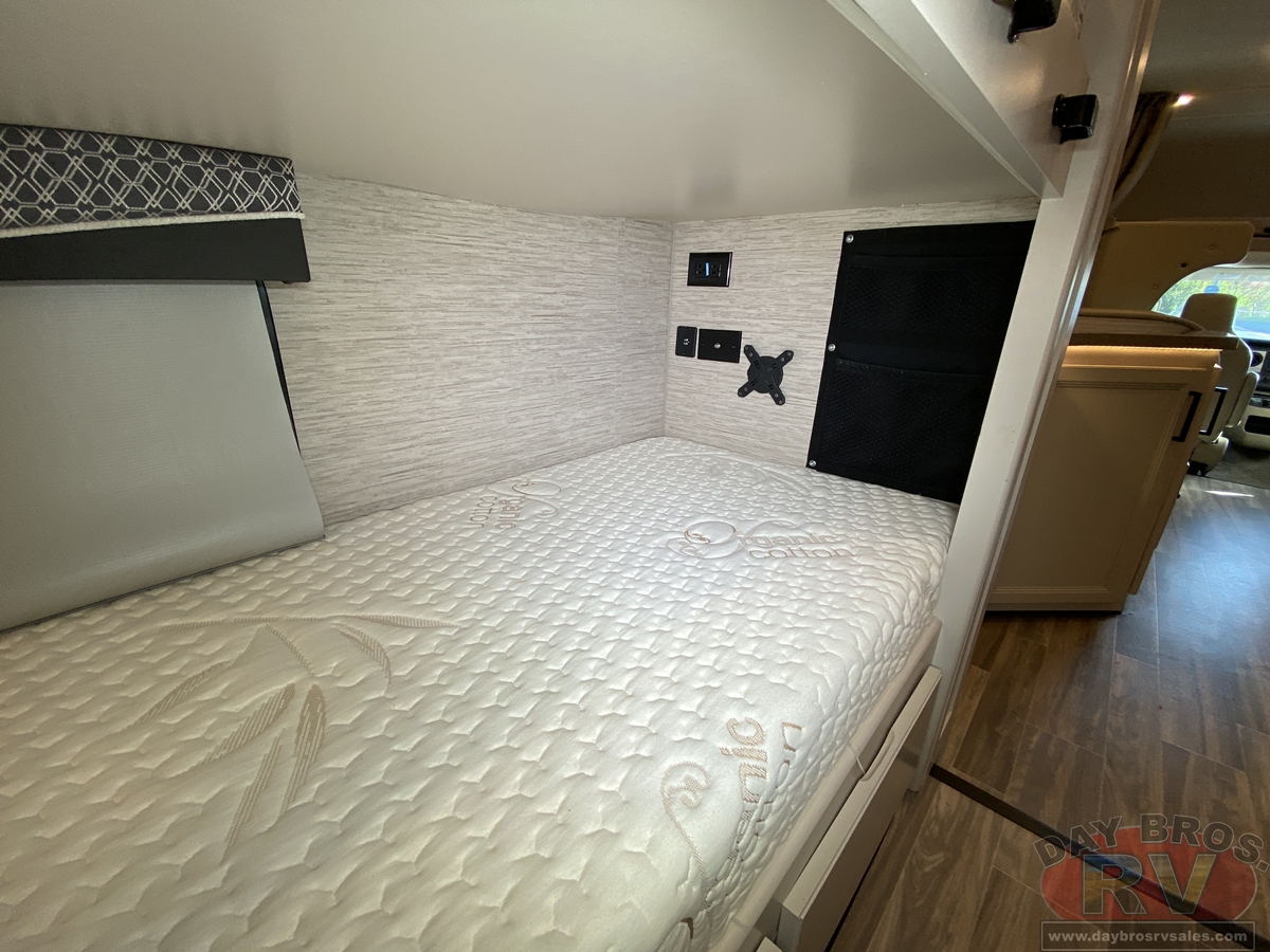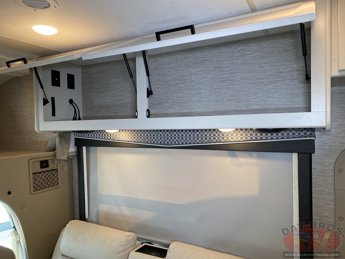 Premium Window Privacy Roller | Leatherette Jack-Knife Sofa | Flat Panel Cabinet Doors with Nickel Finish Hardware & Decorative Glass Inserts in Kitchen Overhead Cabinet Doors | Cab-Over Sleeping Area with Cup Holders & Telescoping Bunk Ladder | Leatherette Dream Dinette® Booth with Single Child Safety Tether | Wireless Phone Charger with USB Charging Port on Dinette Table Top | Wall Cubby with Net & USB Charging Port