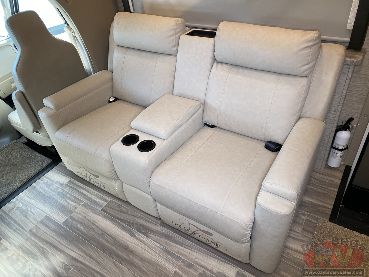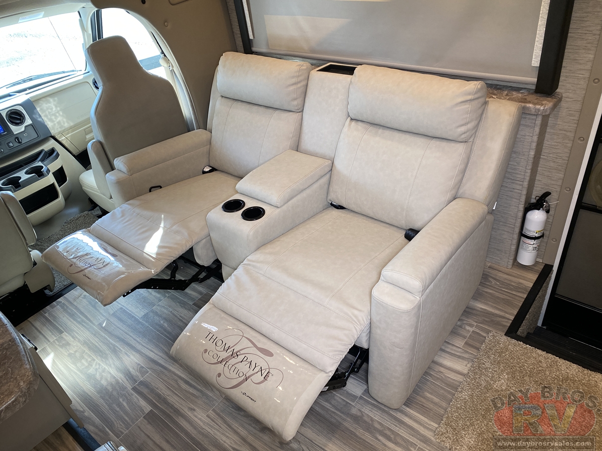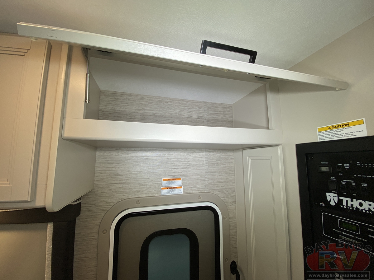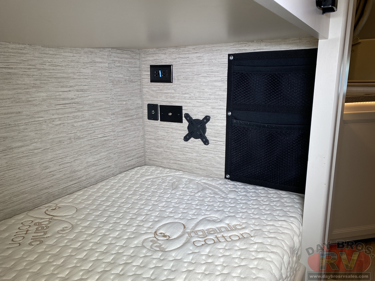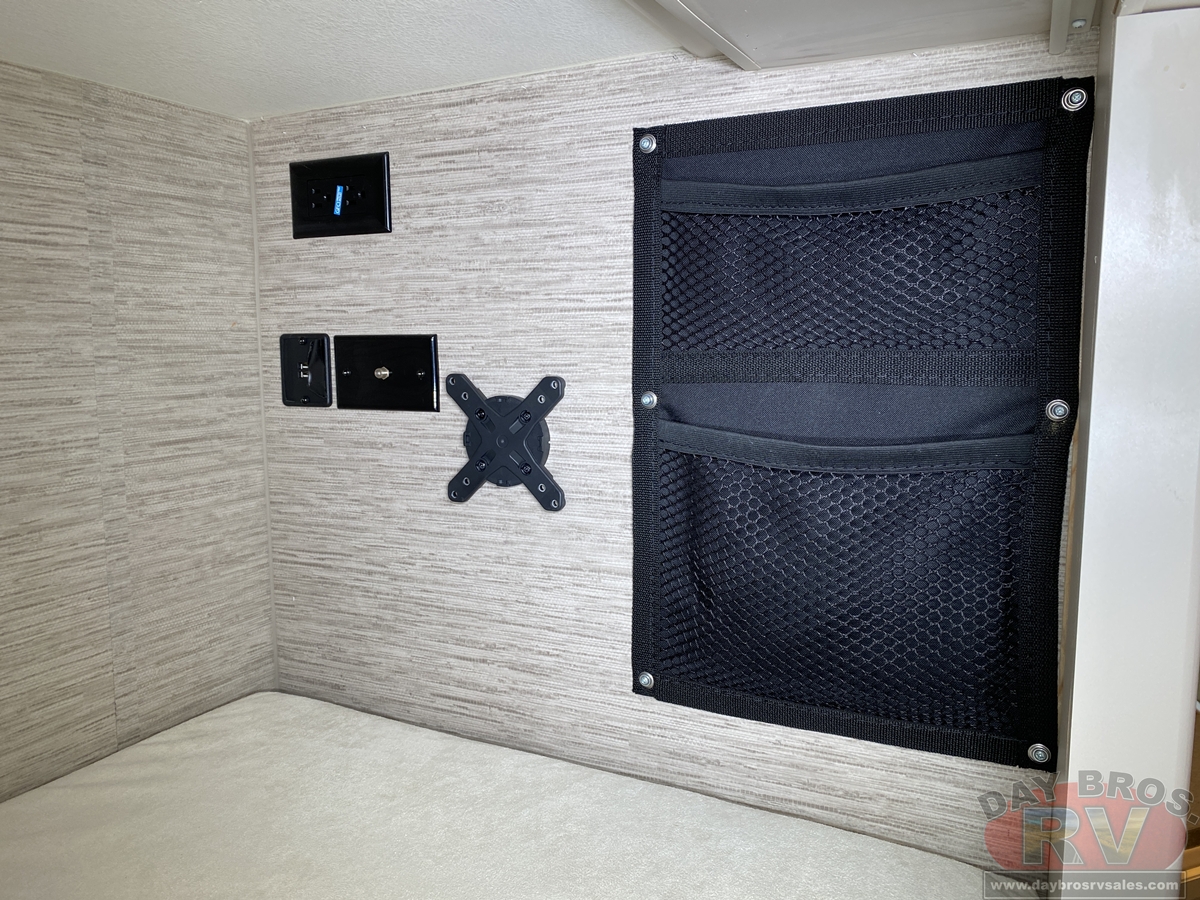 Premium Window Privacy Roller | Leatherette Jack-Knife Sofa | Flat Panel Cabinet Doors with Nickel Finish Hardware & Decorative Glass Inserts in Kitchen Overhead Cabinet Doors | Cab-Over Sleeping Area with Cup Holders & Telescoping Bunk Ladder | Leatherette Dream Dinette® Booth with Single Child Safety Tether | Wireless Phone Charger with USB Charging Port on Dinette Table Top | Wall Cubby with Net & USB Charging Port