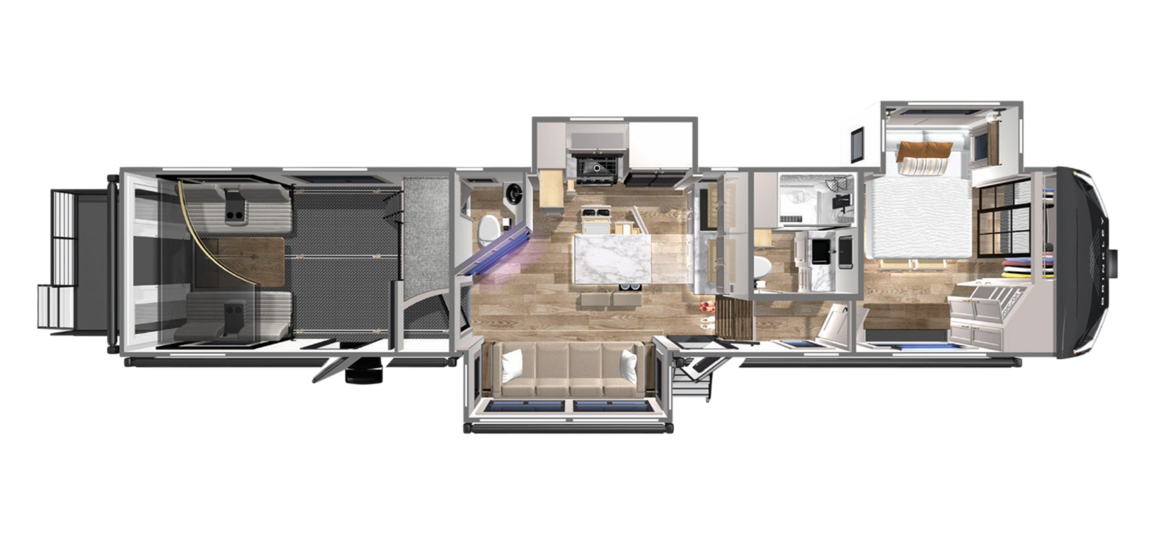 With any Model G toy hauler fifth wheel by Brinkley you will enjoy luxurious amenities, tons of storage space, and innovative features that have been developed and tested in the real world. Durable construction includes an industry leading PDI process, an industry best insulation package, and reinforced and walkable slide roofs. Some of the exterior features you'll find are a 3-way pass-through with a multi-functional flip-up bulkhead wall, under I-beam storage, a MAX-Vision reverse lighting system, and a low-maintenance roof to name a few. A Rockford Fosgate audio system comes standard, along with a OneControl app system that lets you control your fifth wheel's functions right from your mobile device. You will find the solar system with a designated storage area to be ultra convenient, plus there is a FlexPower 5500 with a dual fuel inverter generator for all your power needs. Head inside to find a residential interior with Brinkley's CraftSense wood trim construction, floating entrance steps, integrated window screens and insulated blackout blinds, and residential solid surface countertops plus backsplash. You will also enjoy the neon shower lighting and recessed medicine cabinets in the bath, plus motion activated LED bed lights and dual bedside outlets in the bedroom. Choose a Model G toy hauler fifth wheel to experience all the luxury it has to offer!