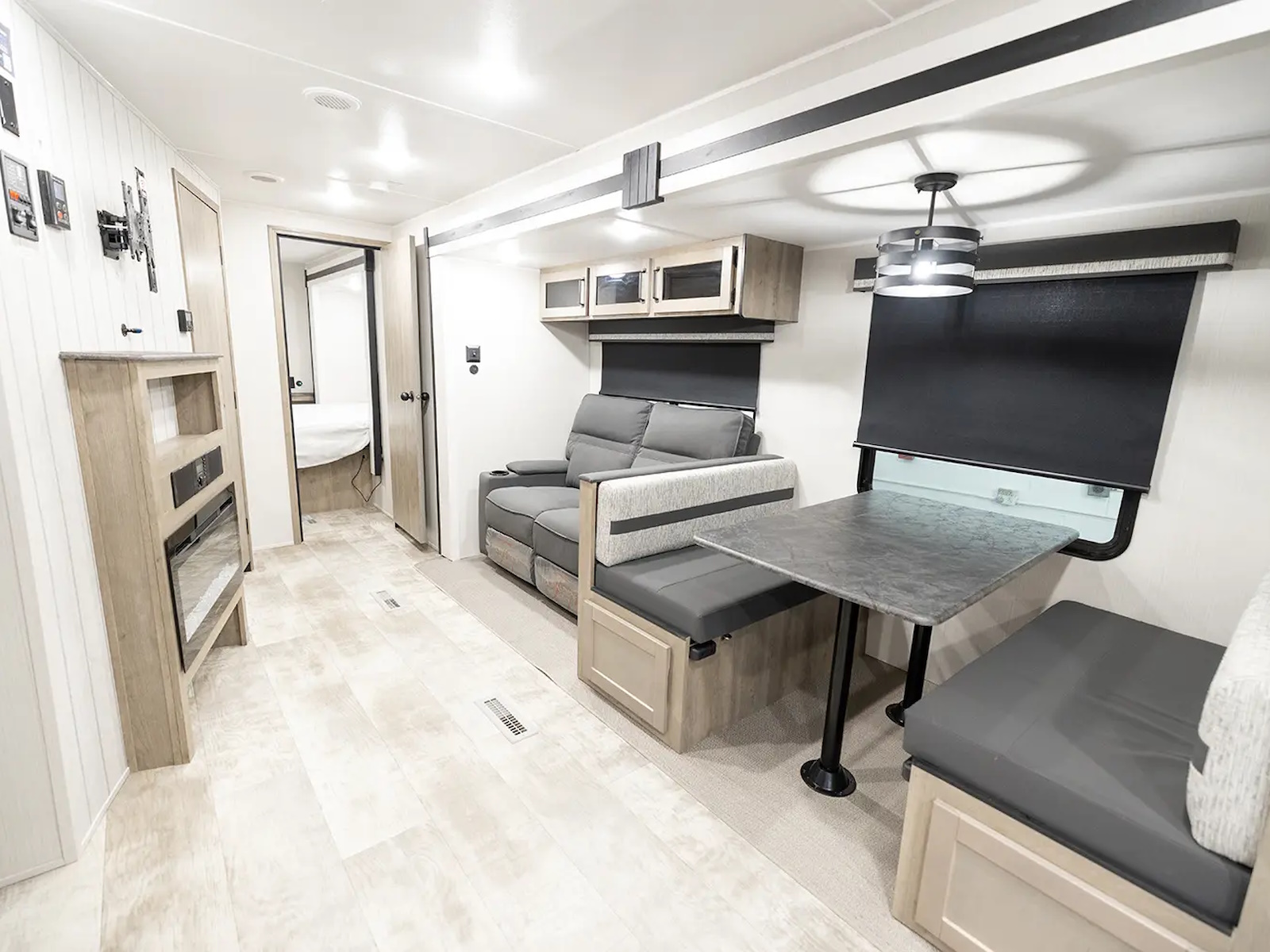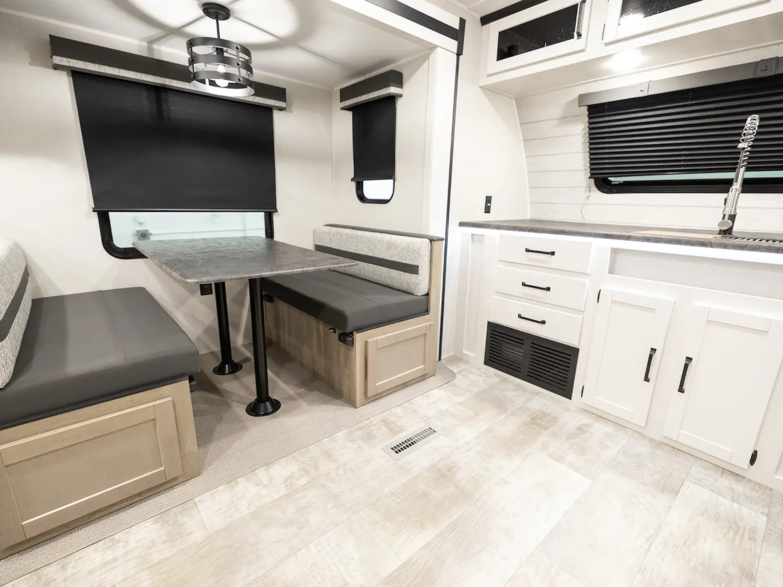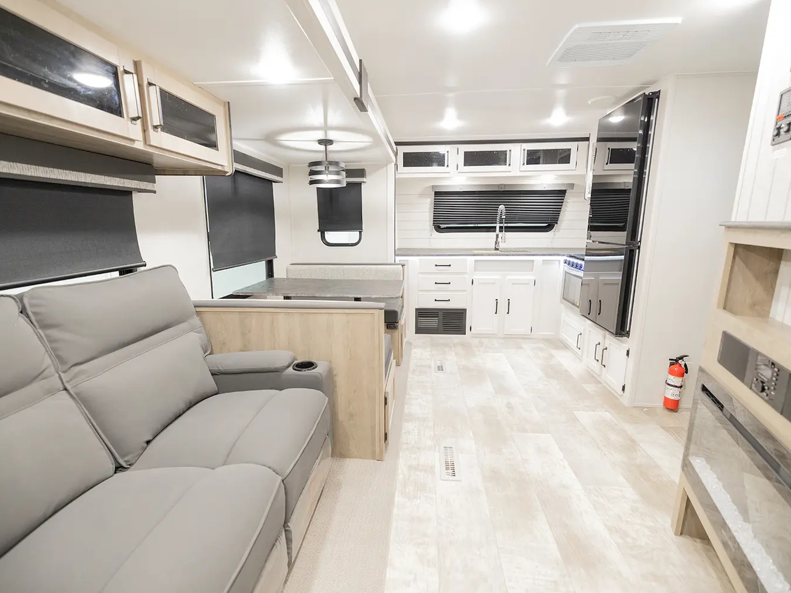 This front kitchen travel trailer will give you lots of space for entertaining guests! The front of the camper has lots of countertop space, deep overhead cabinets, and a scenic window that gives off plenty of natural light. The Dinette and the Sofa will provide plenty of room for your guests to either dine or sleep. The rear of the camper will consist of a full size queen bed and lots of cabinet space for clothes, goods, etc. All of this under 30'!