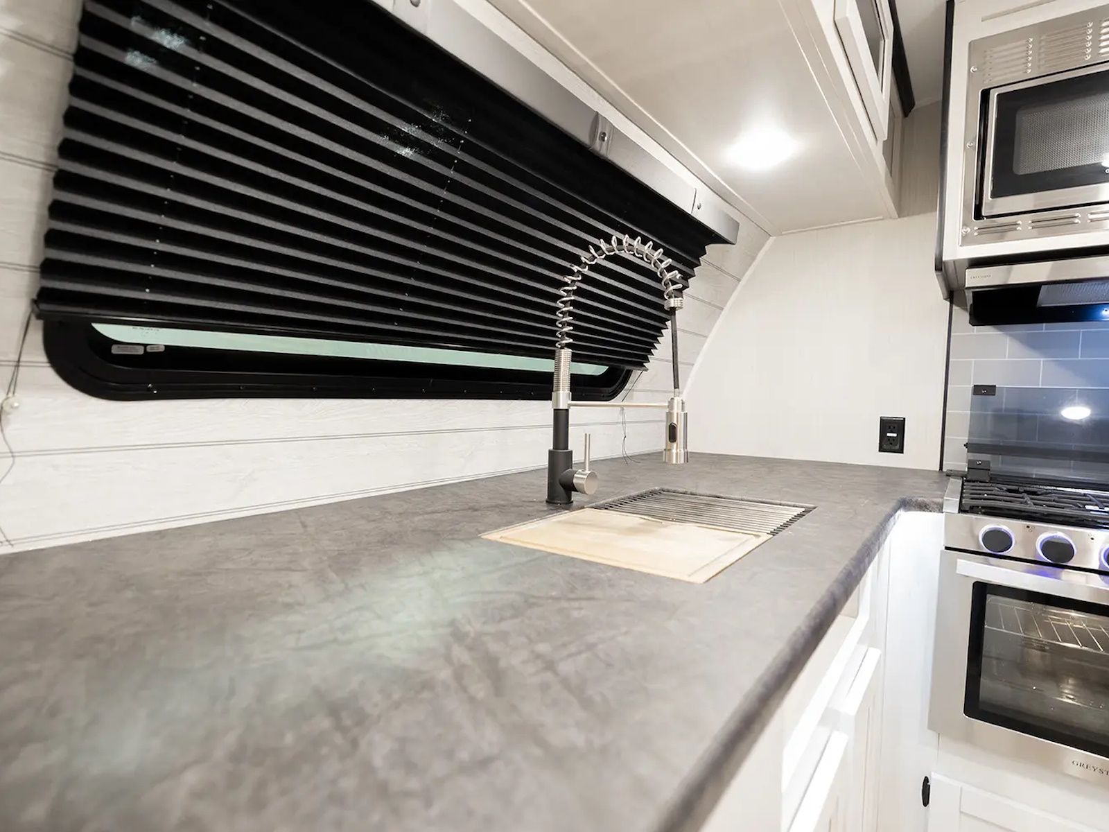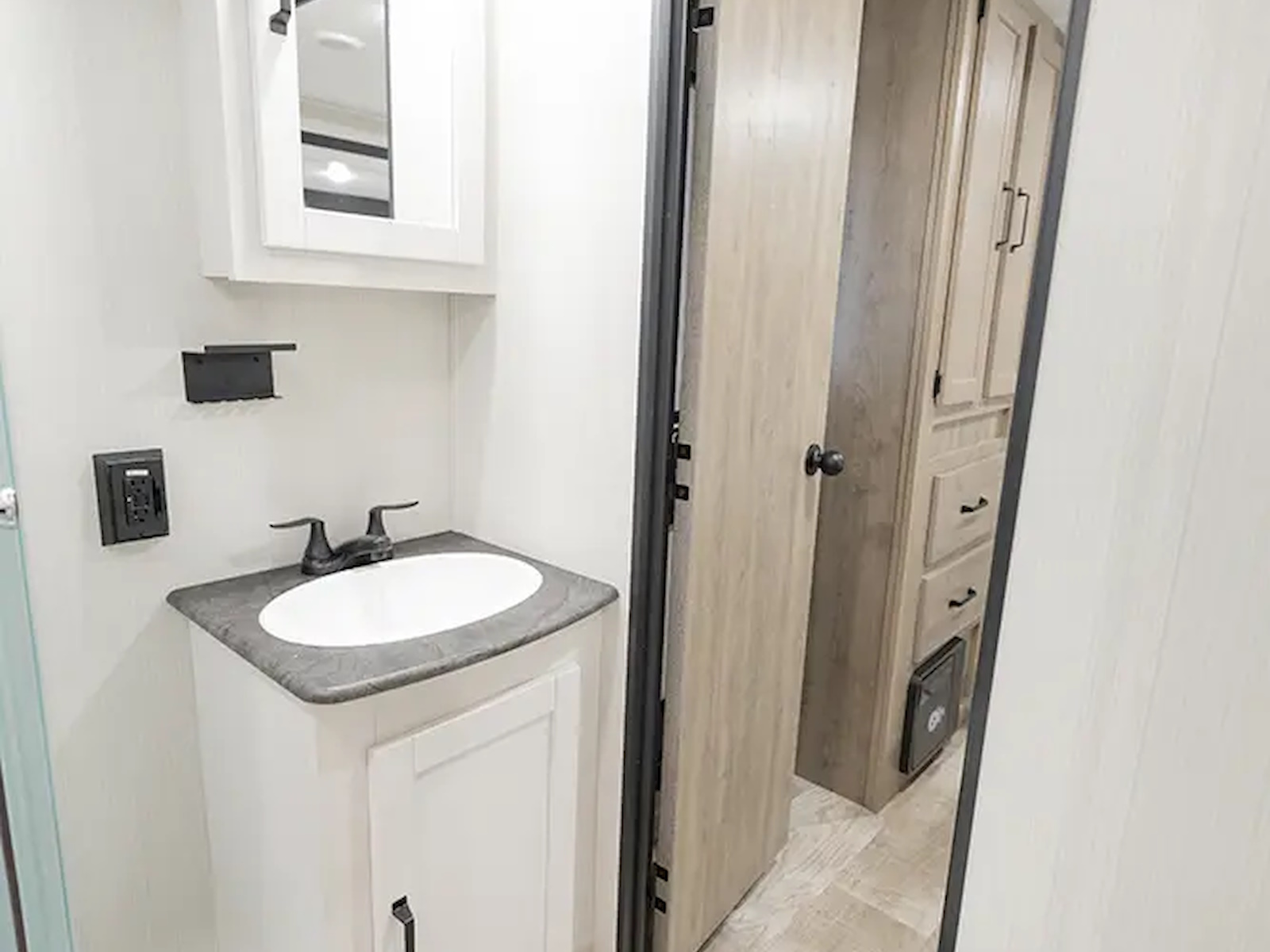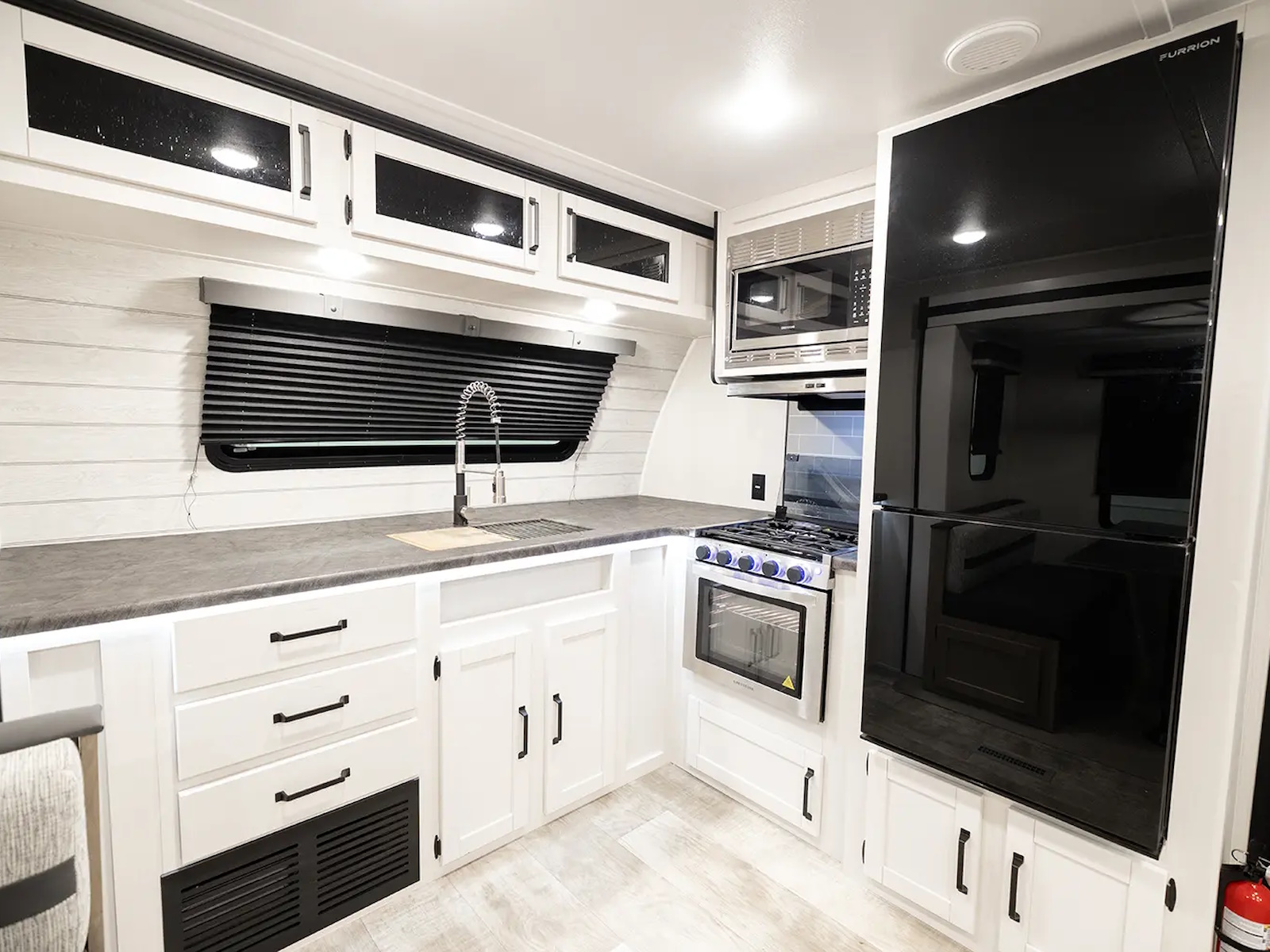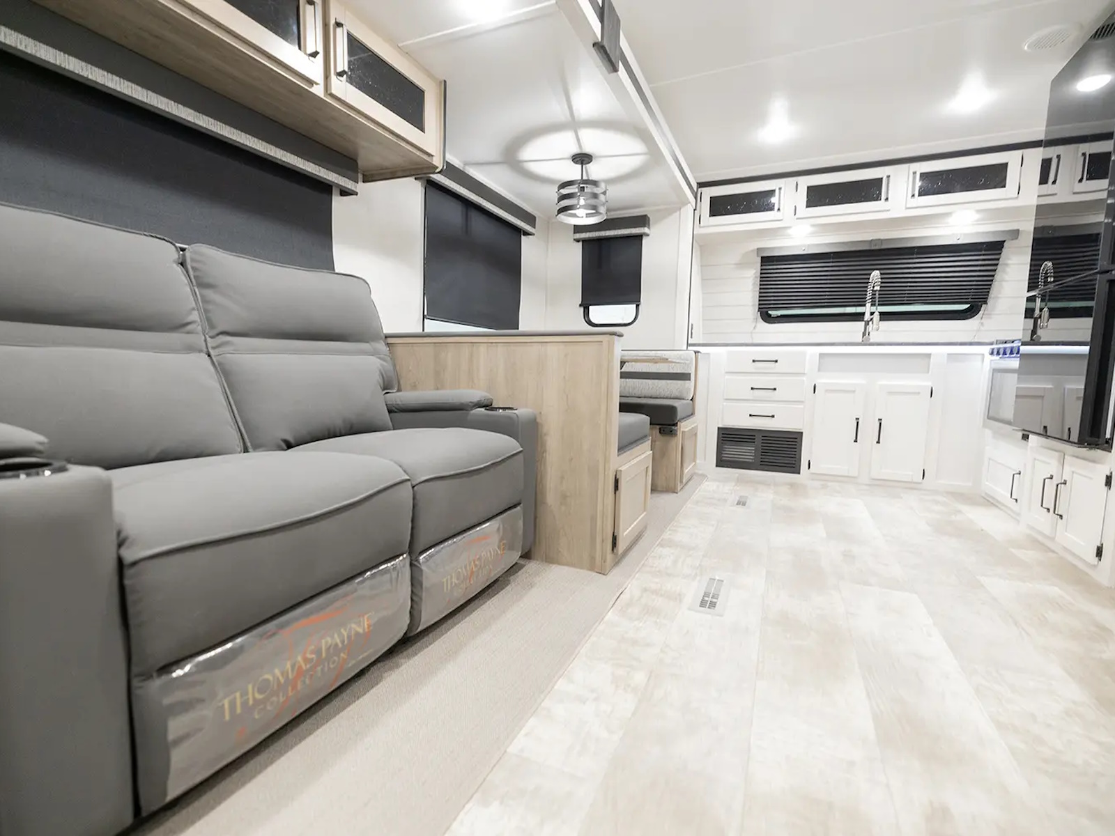 This front kitchen travel trailer will give you lots of space for entertaining guests! The front of the camper has lots of countertop space, deep overhead cabinets, and a scenic window that gives off plenty of natural light. The Dinette and the Sofa will provide plenty of room for your guests to either dine or sleep. The rear of the camper will consist of a full size queen bed and lots of cabinet space for clothes, goods, etc. All of this under 30'!