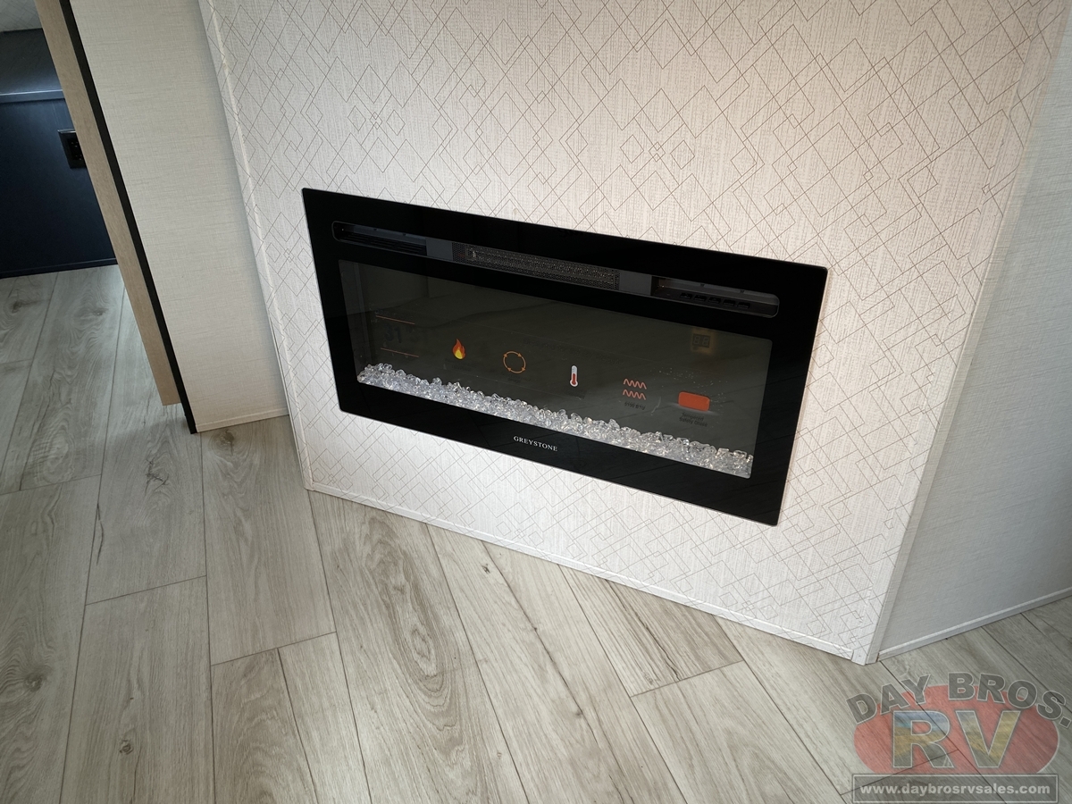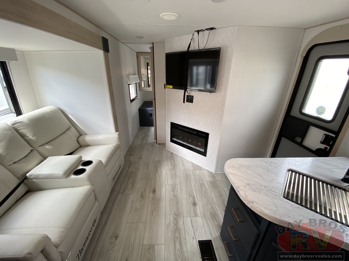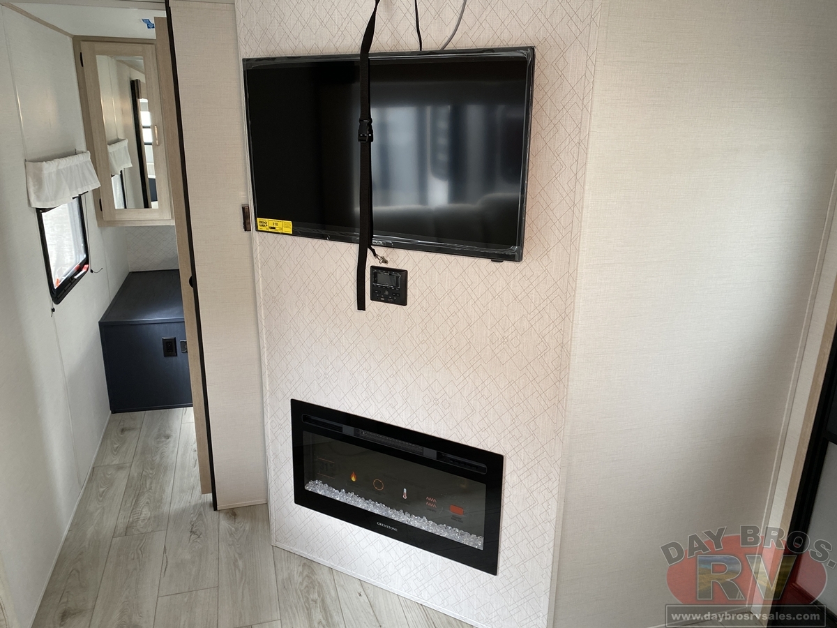 Your family will love this trailer and camping anywhere you go! With a full and half bathroom, you will have the easiest time getting ready in the morning and cleaning up after a full day of hiking. The half bathroom is completely secluded within the front bedroom creating an enticing master suite for the owner of this trailer, and the full bathroom contains the second exterior entry door so that everyone else can quickly get inside to use the restroom while outside playing. The large slide is going to make the main living space feel open and inviting, and the double-size bunks provide you with compact sleeping for four. There is also a large pantry for storing your snacks and a fireplace for keeping the interior cozy.