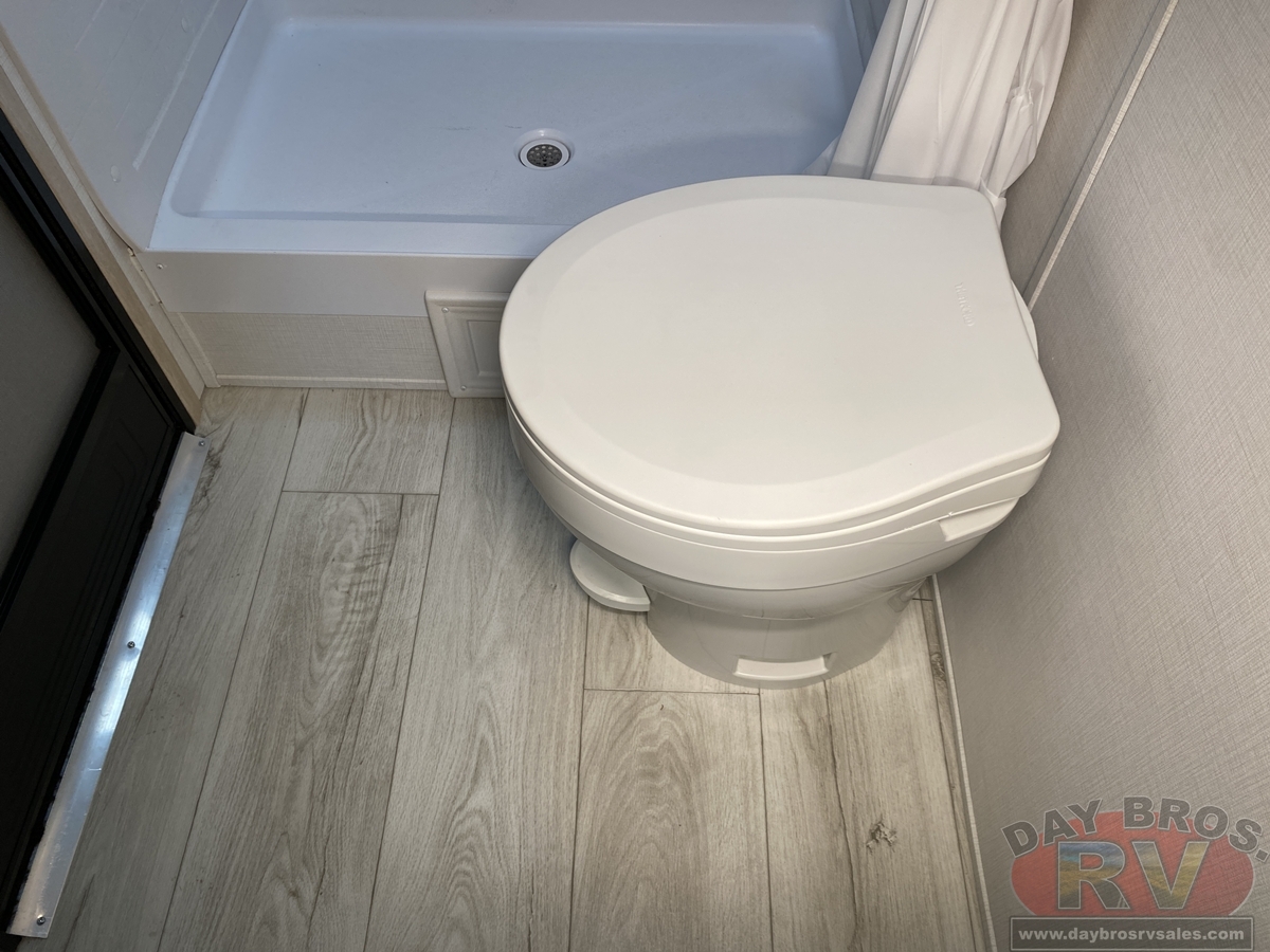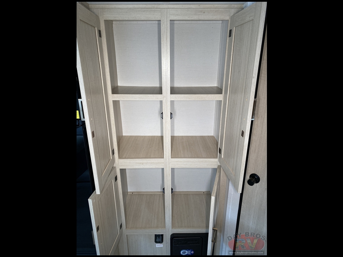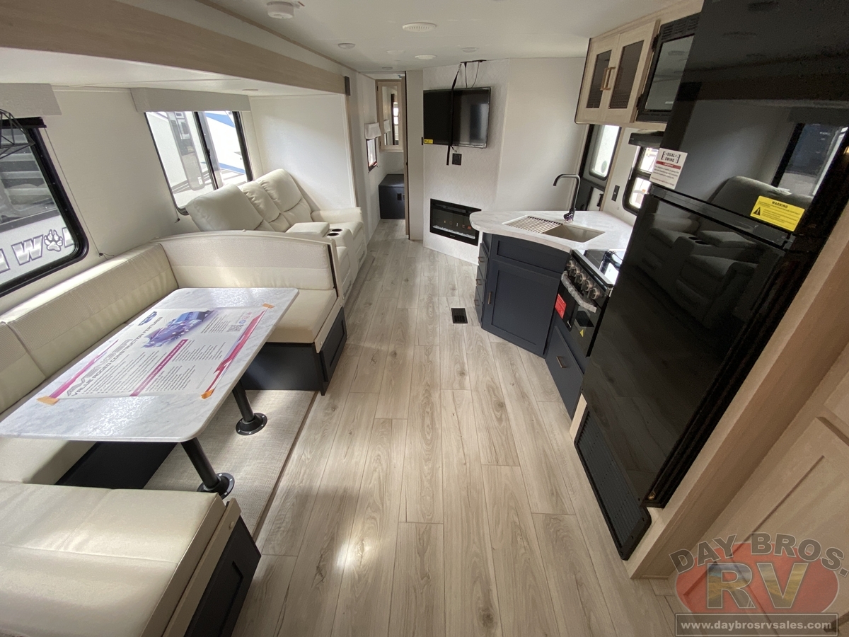 Your family will love this trailer and camping anywhere you go! With a full and half bathroom, you will have the easiest time getting ready in the morning and cleaning up after a full day of hiking. The half bathroom is completely secluded within the front bedroom creating an enticing master suite for the owner of this trailer, and the full bathroom contains the second exterior entry door so that everyone else can quickly get inside to use the restroom while outside playing. The large slide is going to make the main living space feel open and inviting, and the double-size bunks provide you with compact sleeping for four. There is also a large pantry for storing your snacks and a fireplace for keeping the interior cozy.