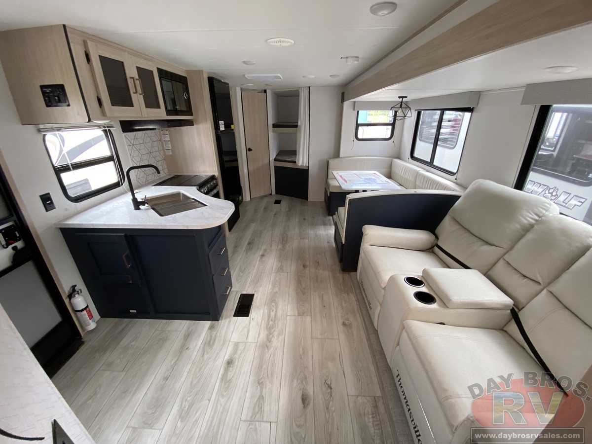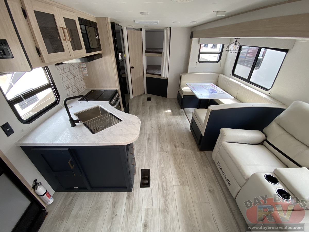 The Avenger 2DBS model features a front queen bedroom that's separate from the rest of the coach, with sliding doors for extra privacy. The main living area feels roomy thanks to the slideout with sofa and spacious U-dinette. Large windows bring in natural light and great outdoor views. The fully equipped kitchen makes mealtime a snap, with residential appliances and a pantry for extra storage. In the rear, the bunk room provides a pair of large double bunk beds, plus a full bathroom.