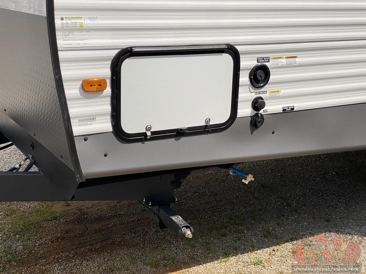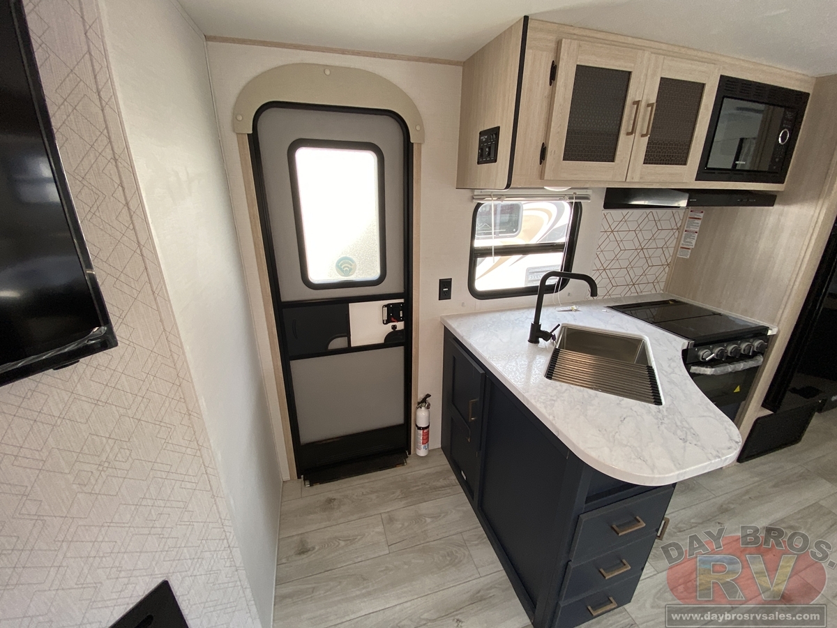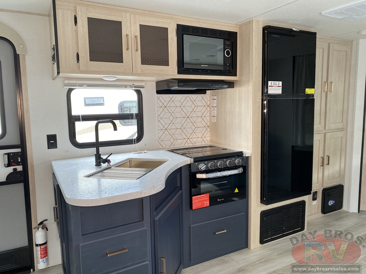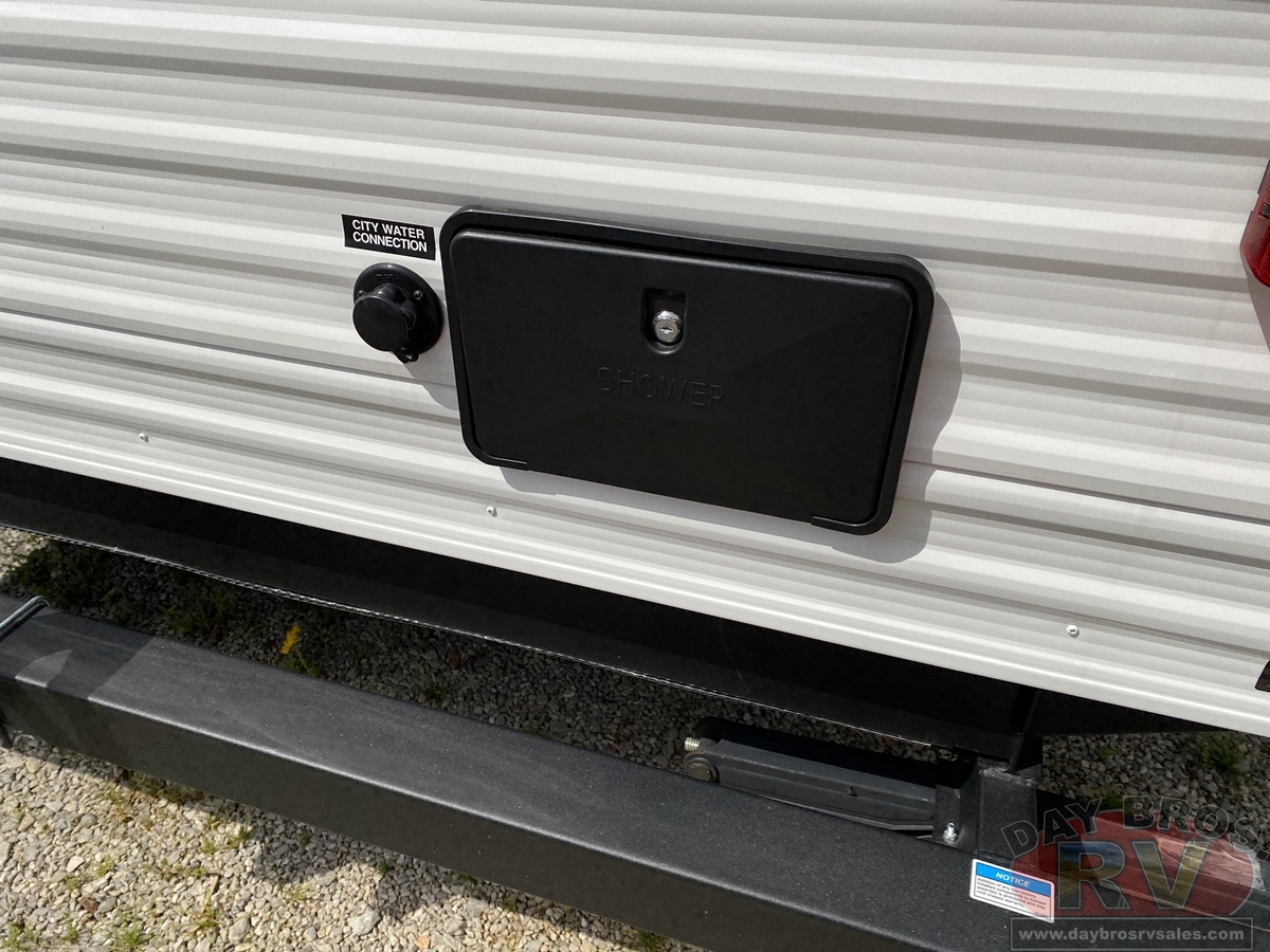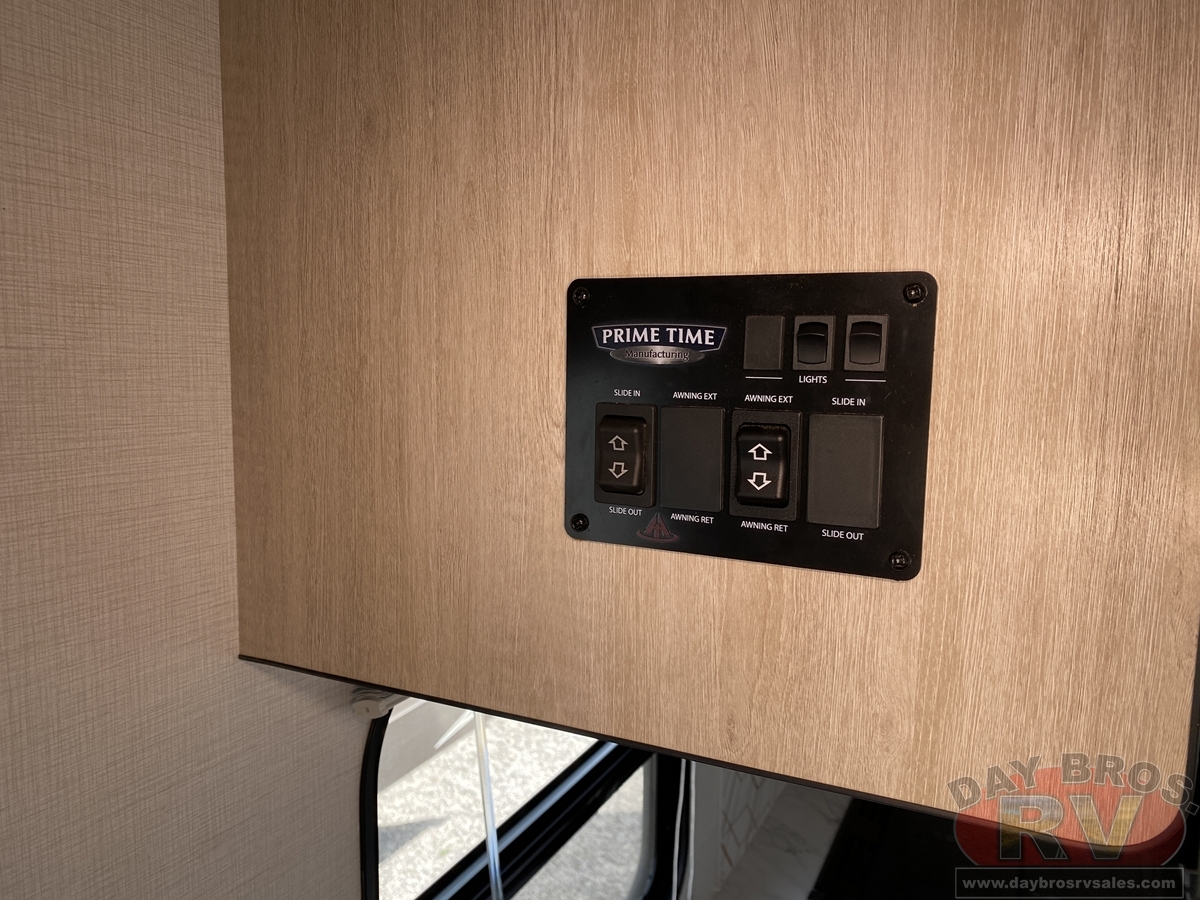 With any Avenger travel trailer by Prime Time, the exterior includes an aerodynamic smooth front metal, a diamond plate front rock guard for protection on the road, and four stabilizer jacks to keep your unit secure. There is a fully walkable roof plus an enclosed and heated underbelly that will help extend your camping season. The interior offers a 15,000 BTU air conditioner for the perfect climate inside, in-floor ducted heat, a systems monitor panel, and a Winegard 360+ antenna with Wi-Fi prep that will give you the option to stay connected as you camp. Each model also includes seamless Carefree Congoleum flooring, kitchen backsplash, shower pans in all models, and pleated nightshades throughout to name a few interior comforts!