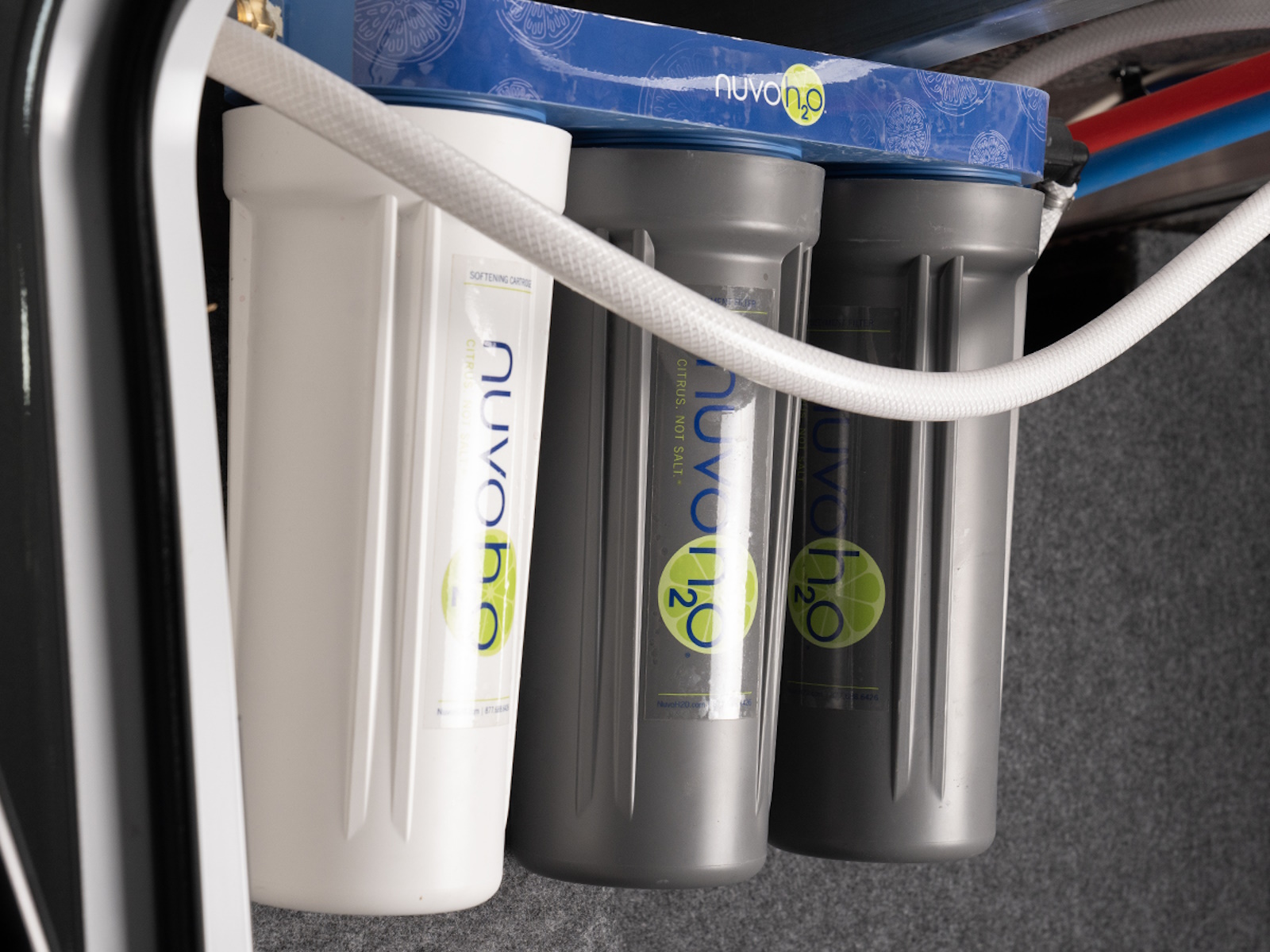 This year, we are also excited to introduce the brand-new NuvoH2O water purification system. This whole-house system is compatible with both city water and dry camping, featuring a salt-free softener that filters 5,000 gallons and effectively prevents and removes scale buildup, meaning that your drinking water is safer, healthier and better tasting. You'll also have softer water to wash with so no more staining of your shower or toilet. Finally, you'll be impressed by the power theater seats with industry-first three-position headrests. The Pinnacle features residential cloth fabric powered theater seats in the main living area, complete with satin protection, power recline, LED lights, USB ports, and heat and massage functions. These seats are designed to resist stains and avoid the wear and tear of pleather, ensuring they look great over time. Enjoy ultimate comfort while reclining and conveniently recharge your devices with the USB ports located right on the seats.