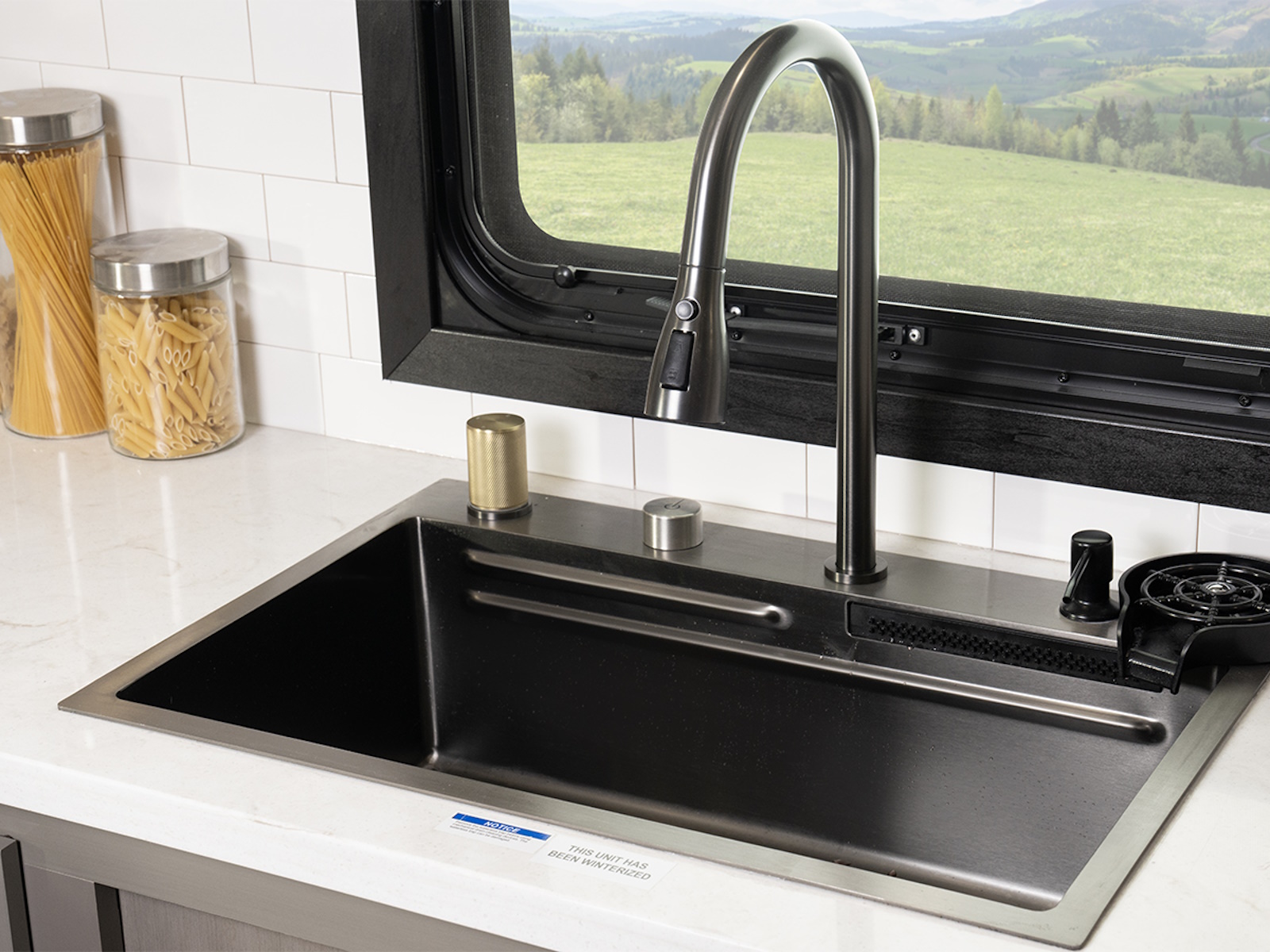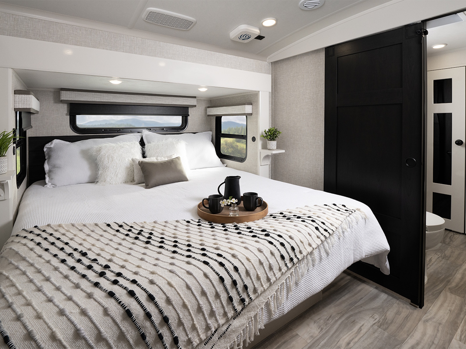 In the kitchen, you’ll find all GE appliances, including a 21 cu. ft. residential refrigerator with an 1800W inverter, a GE Profile Series 30 in. residential convection microwave with built-in air fryer and GE Profile Series residential 24 in. range. With appliances from a brand you can trust, like GE, and a built-in air fryer, could you dream up a more amazing kitchen? We even added a flip up 24” X 24” butcher block countertop kitchen island extension, as well as pull-out utility storage under the sink: you’ll have more room to entertain, prep delicious meals and serve them. Beyond the entertaining you’ll do at the butcher block countertop, the residential Bluetooth®/HDMI entertainment system will be the envy of the campground. The high-output JBL® sound system with upgraded sound bar and Bluetooth® capability will take your movie nights or outdoor hangouts to the next level.