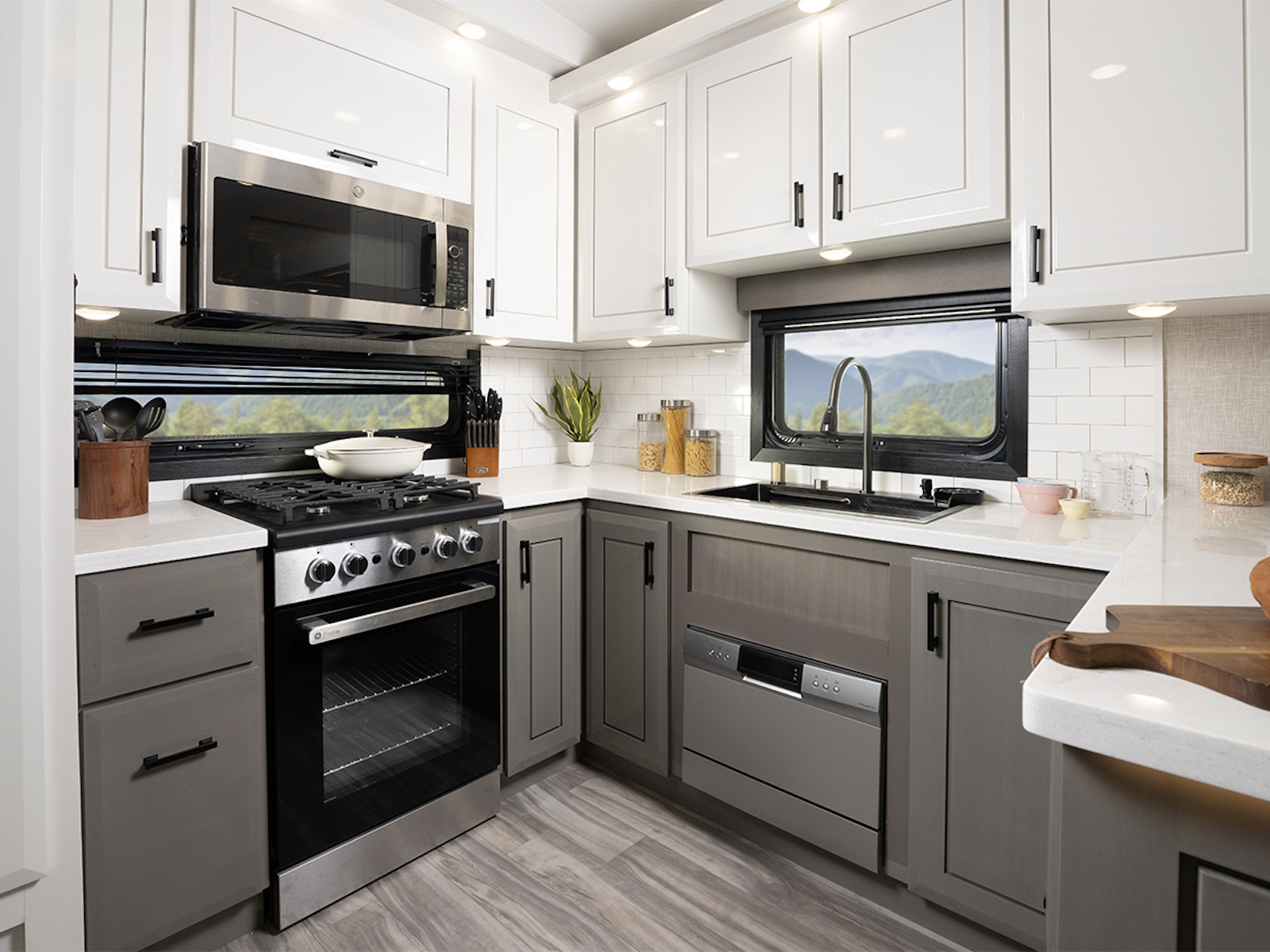 The Pinnacle takes advantage of the 102” wide body design’s maximum width to provide maximum living space and storage, including three, 40-lb. LP bottles, so you can spend less time filling propane bottles and more time making memories. Stay cool with the HELIX Cooling System™, which includes an improved curved vent design and a residential air return system. This setup maximizes airflow and efficiency while Whisper Quiet technology ensures a quieter cooling experience compared to traditional RV A/C systems.