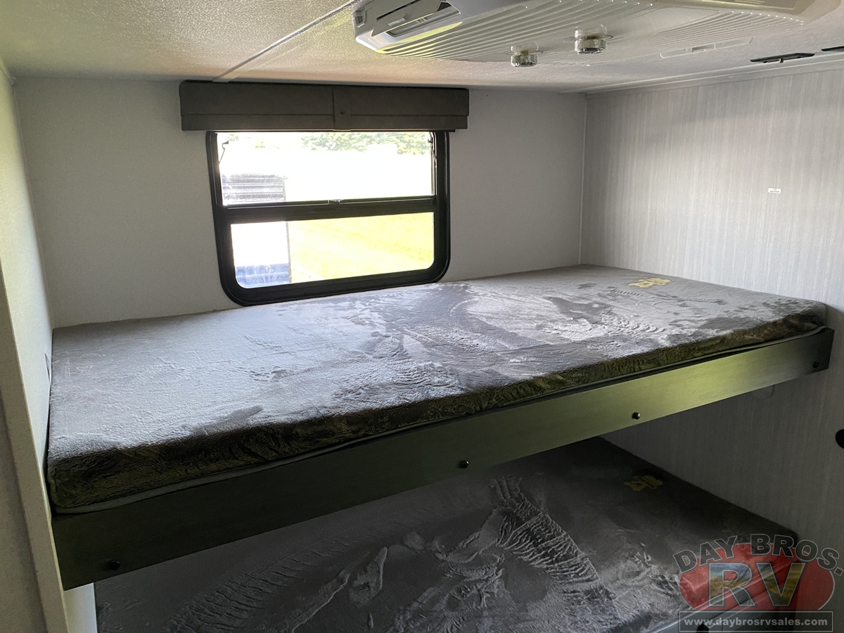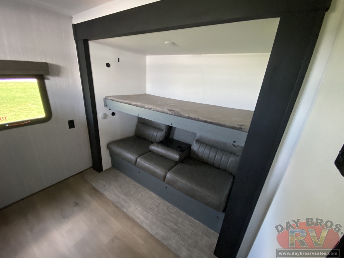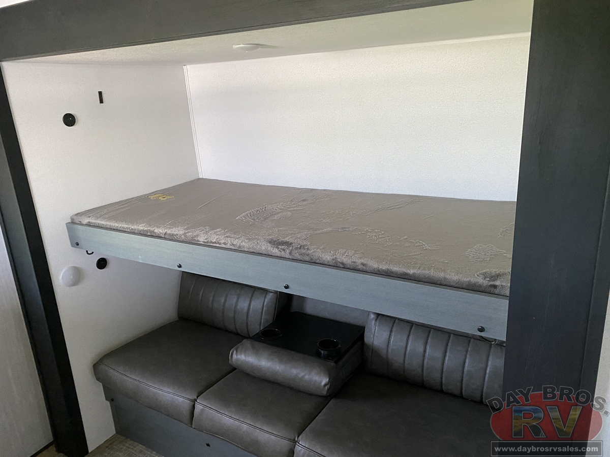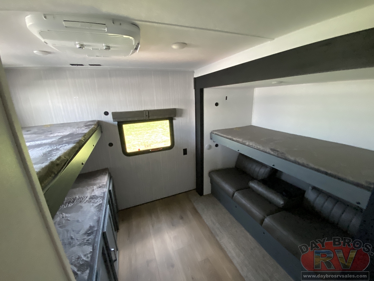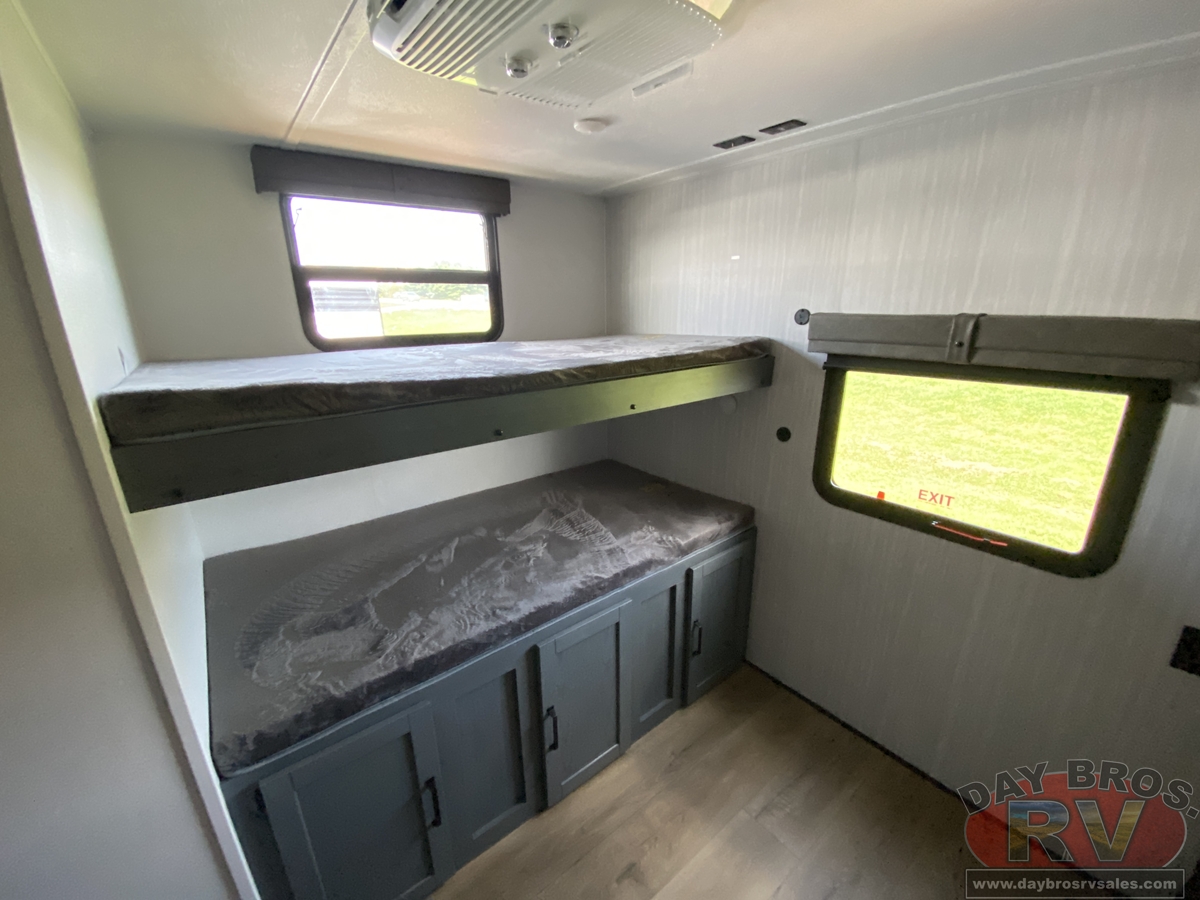 This bunk house travel trailer supplies you a great deal of space in the front bedroom. With a slide out and a large closet for all of your clothes, it will feel like your bedroom at home. The bunk house in the rear provides space for all guests to be comfortable and to make things a cut above, this floor plan provides two bathrooms. Furthermore, the exterior mini camp kitchen features a fridge and a griddle for those of you who like to cook in nature.