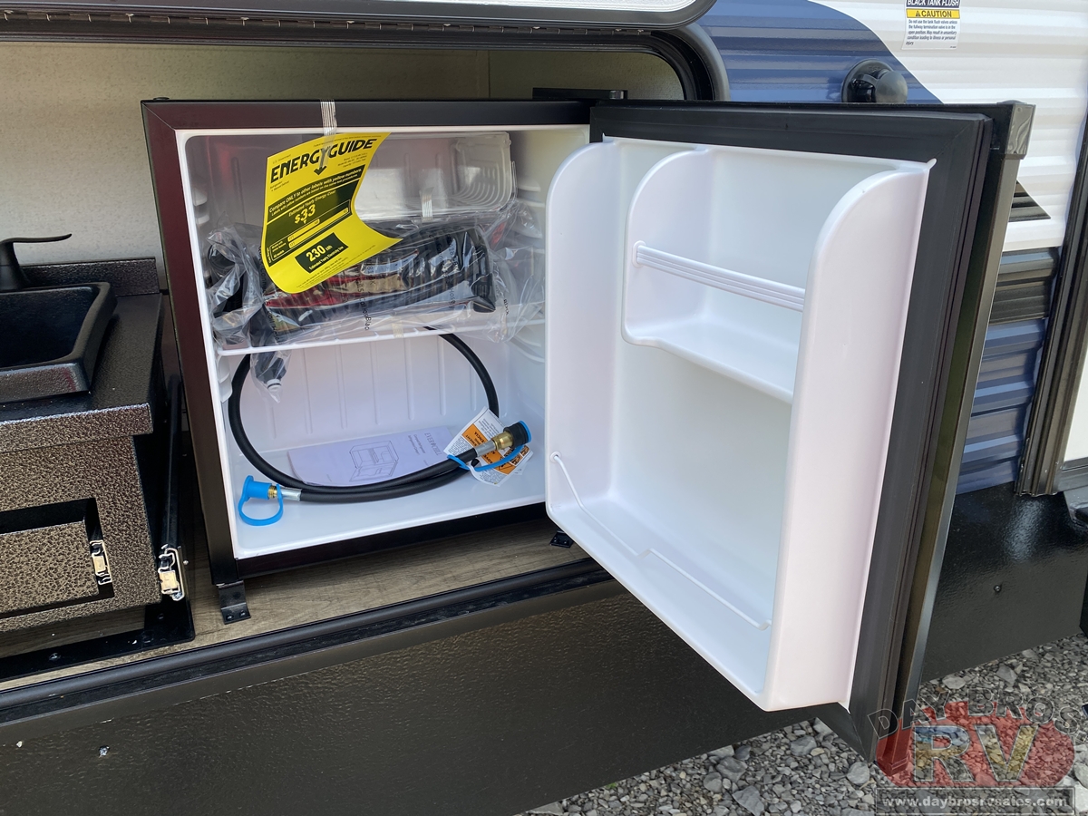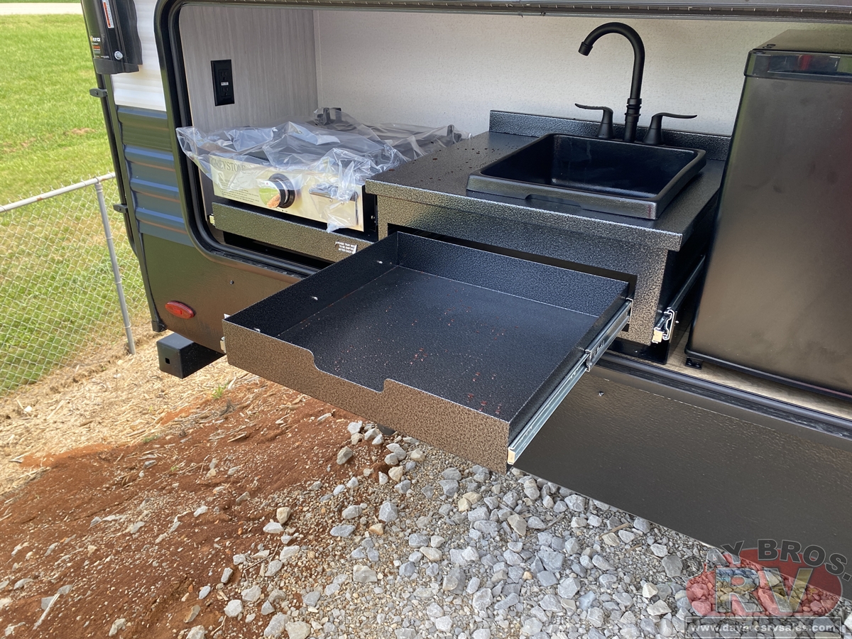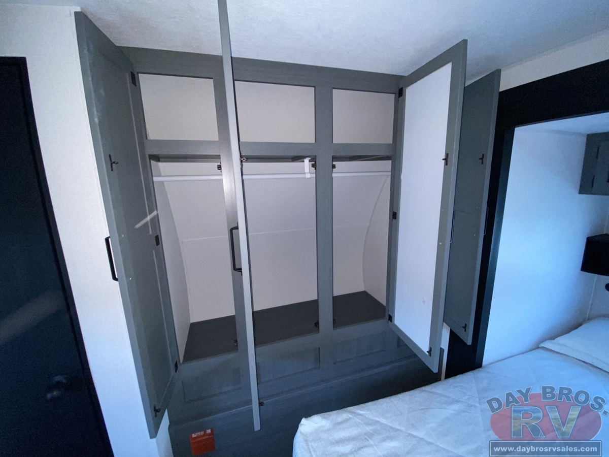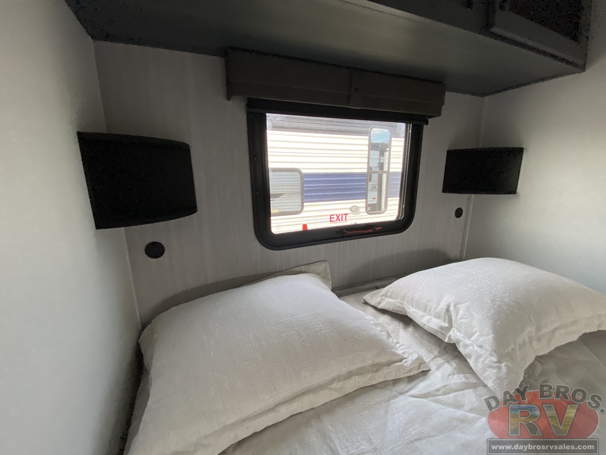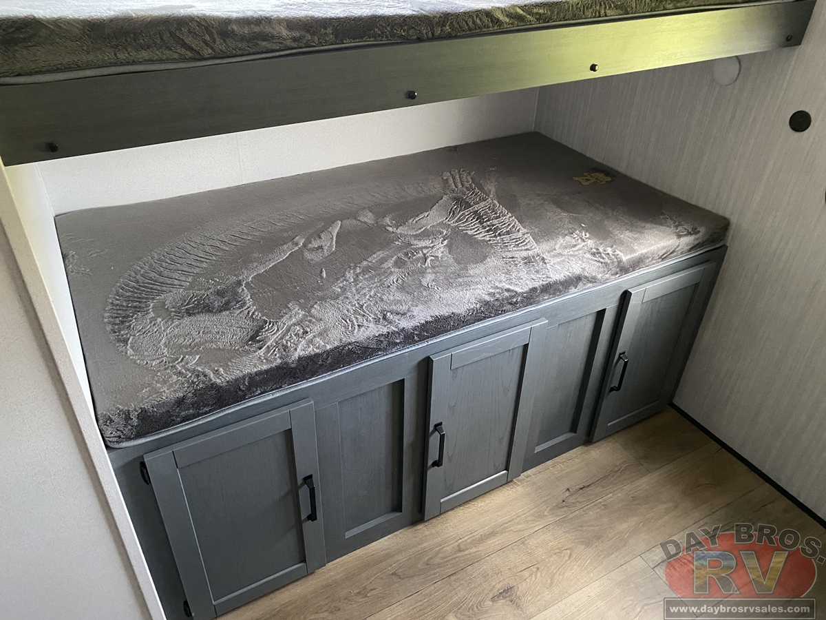 This bunk house travel trailer supplies you a great deal of space in the front bedroom. With a slide out and a large closet for all of your clothes, it will feel like your bedroom at home. The bunk house in the rear provides space for all guests to be comfortable and to make things a cut above, this floor plan provides two bathrooms. Furthermore, the exterior mini camp kitchen features a fridge and a griddle for those of you who like to cook in nature.