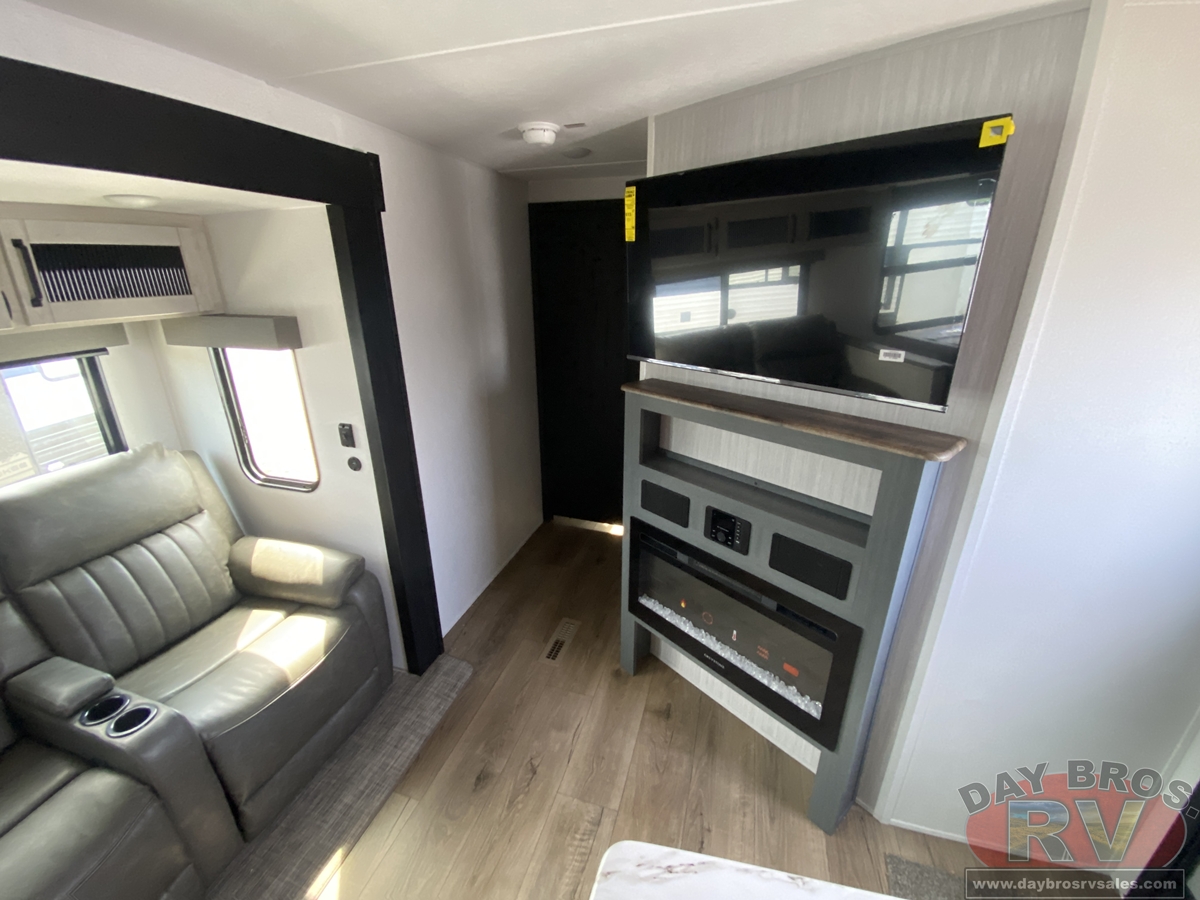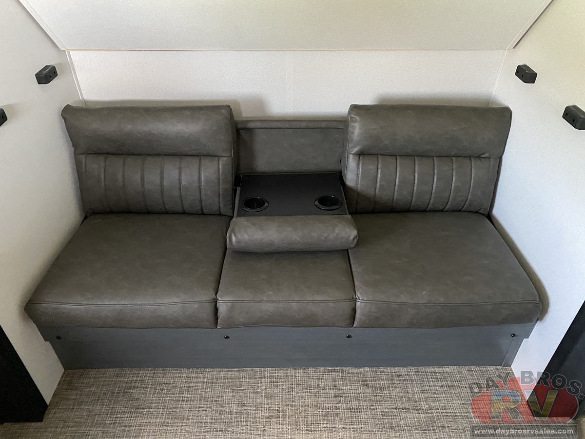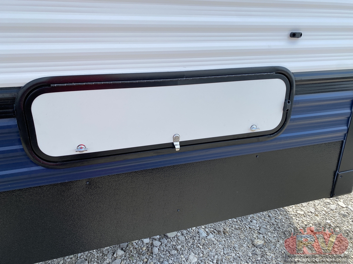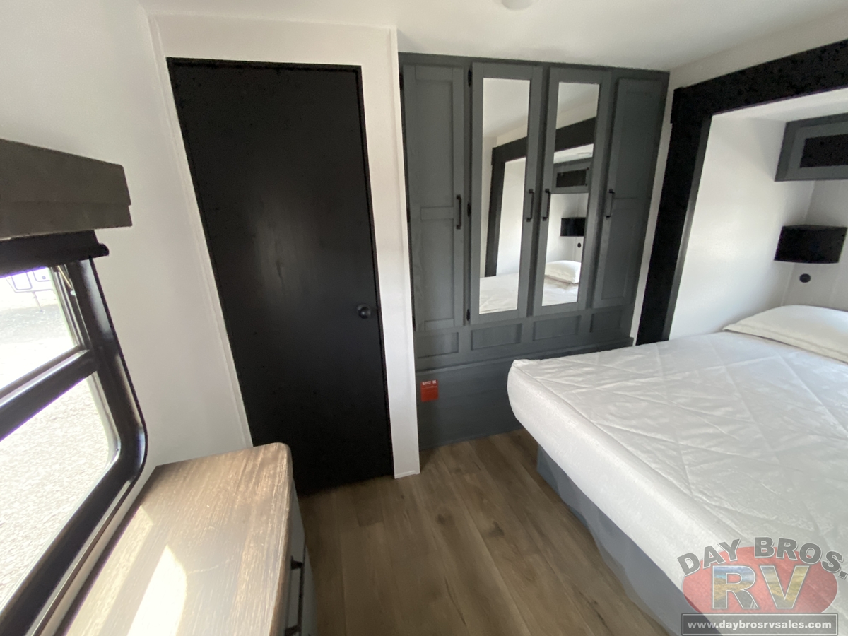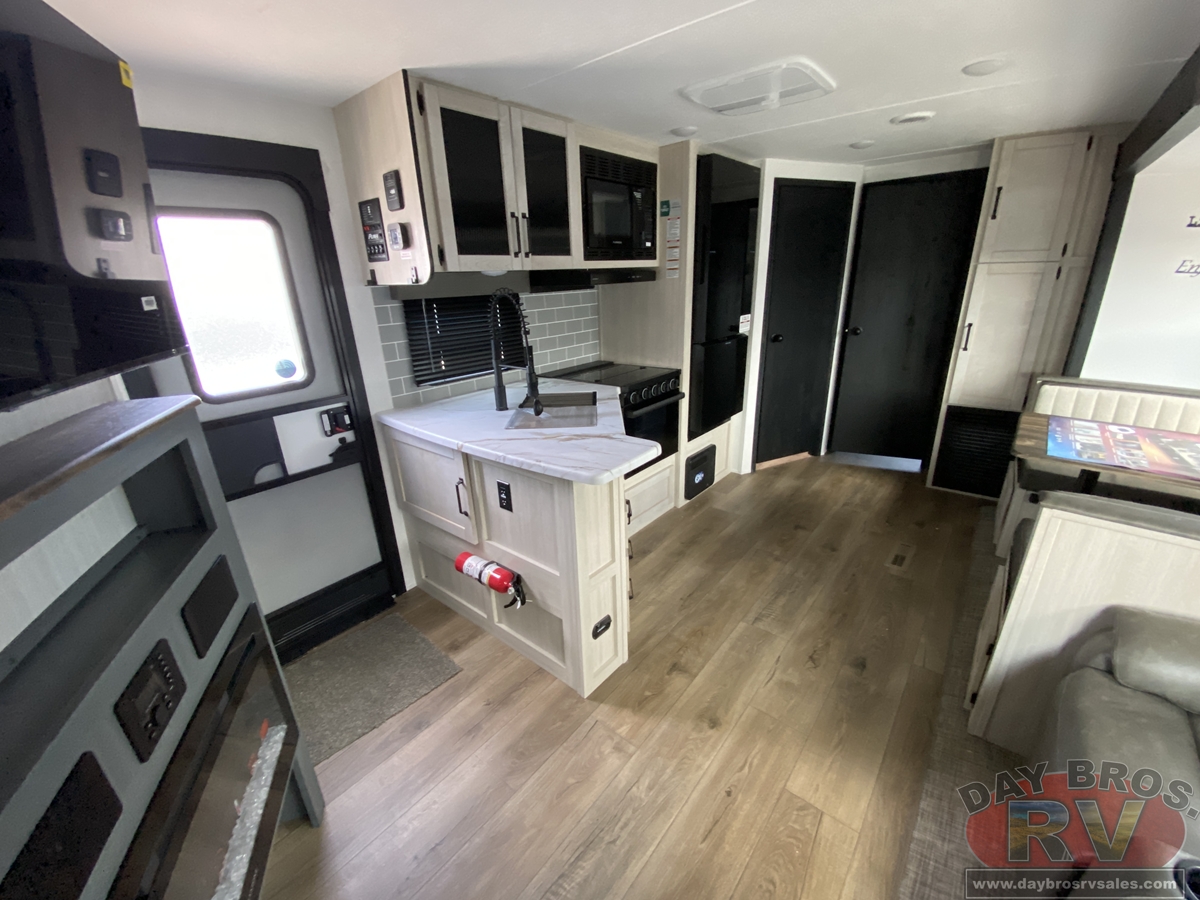 This bunk house travel trailer supplies you a great deal of space in the front bedroom. With a slide out and a large closet for all of your clothes, it will feel like your bedroom at home. The bunk house in the rear provides space for all guests to be comfortable and to make things a cut above, this floor plan provides two bathrooms. Furthermore, the exterior mini camp kitchen features a fridge and a griddle for those of you who like to cook in nature.