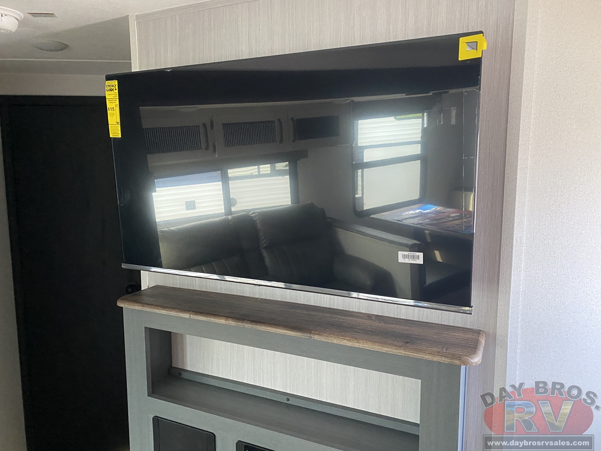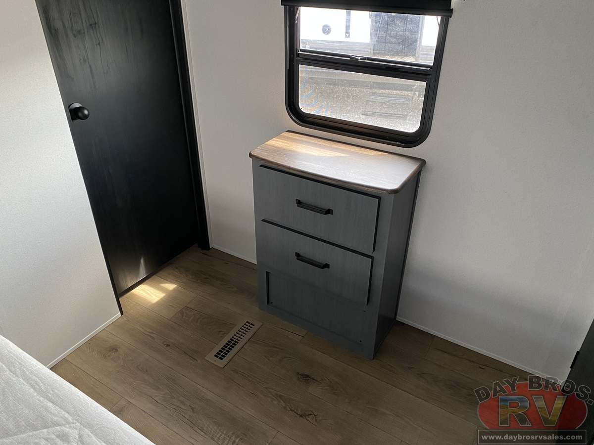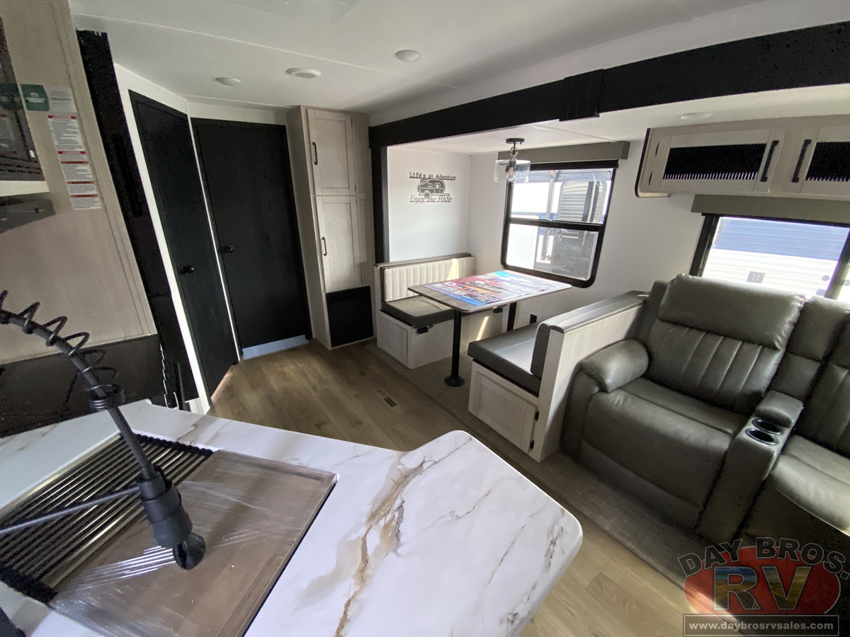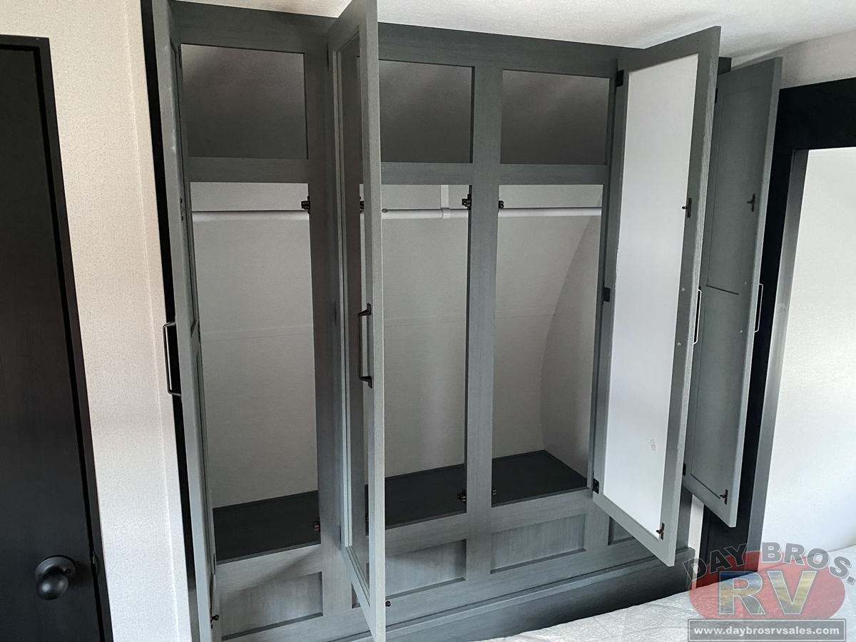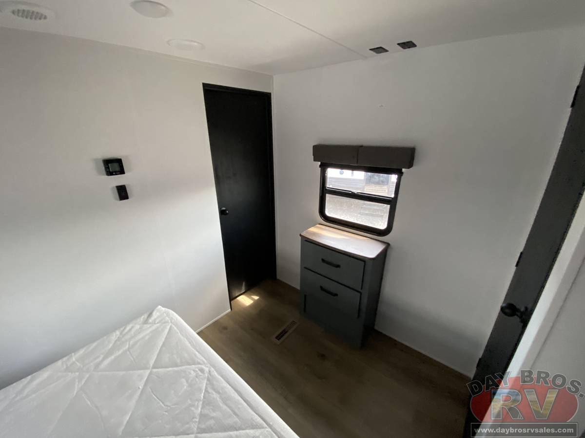This bunk house travel trailer supplies you a great deal of space in the front bedroom. With a slide out and a large closet for all of your clothes, it will feel like your bedroom at home. The bunk house in the rear provides space for all guests to be comfortable and to make things a cut above, this floor plan provides two bathrooms. Furthermore, the exterior mini camp kitchen features a fridge and a griddle for those of you who like to cook in nature.