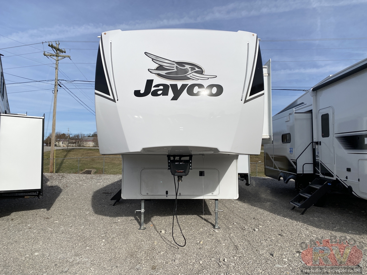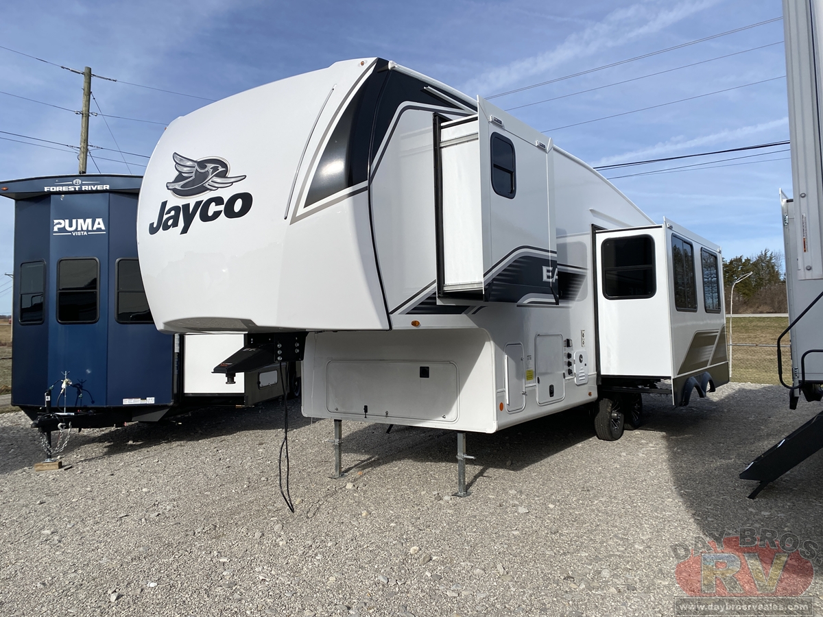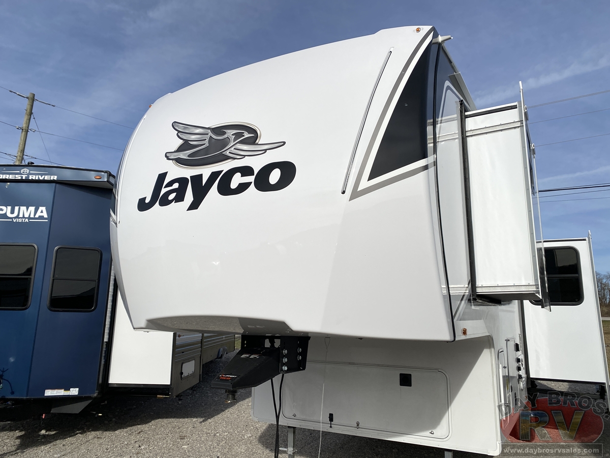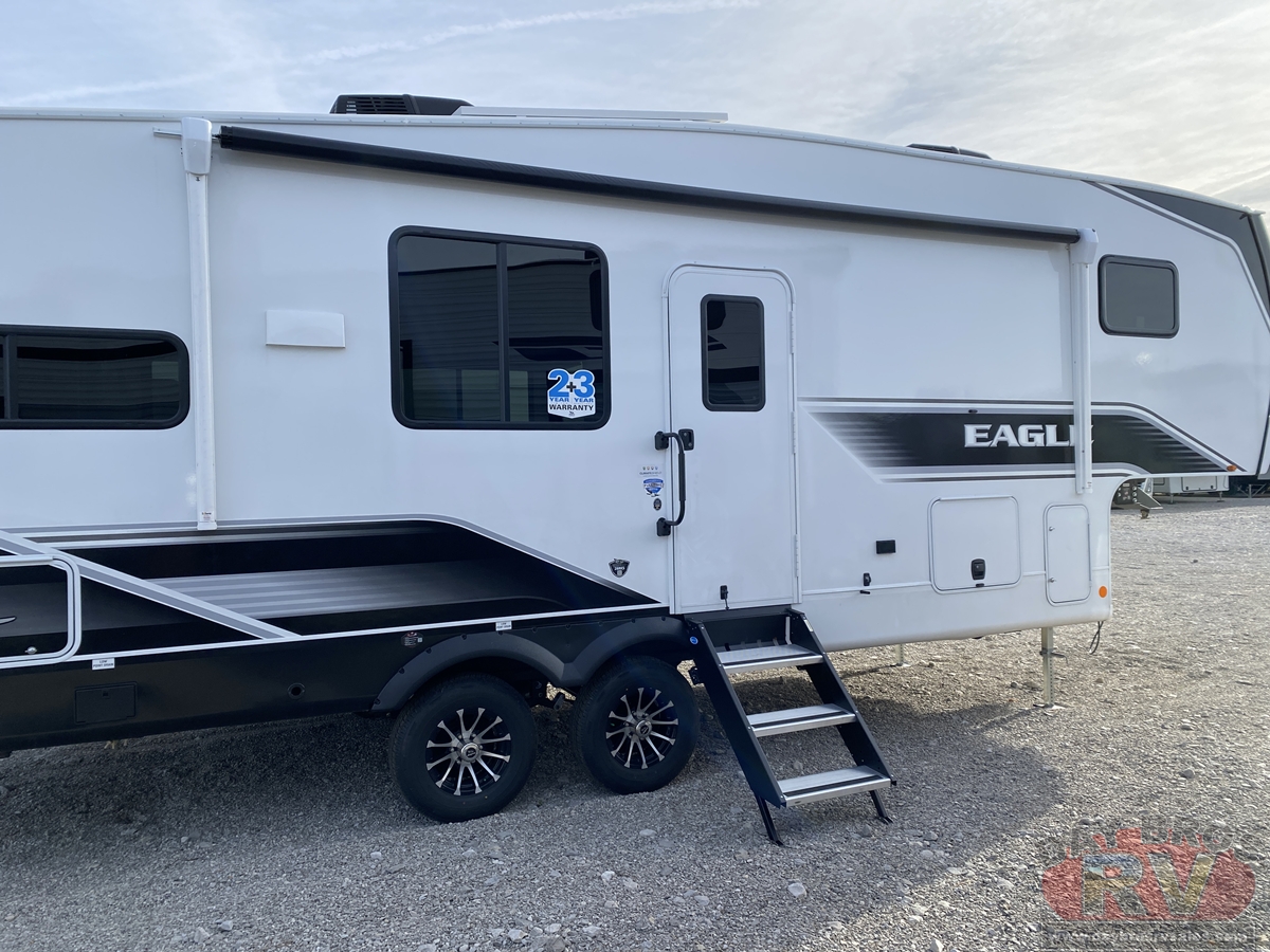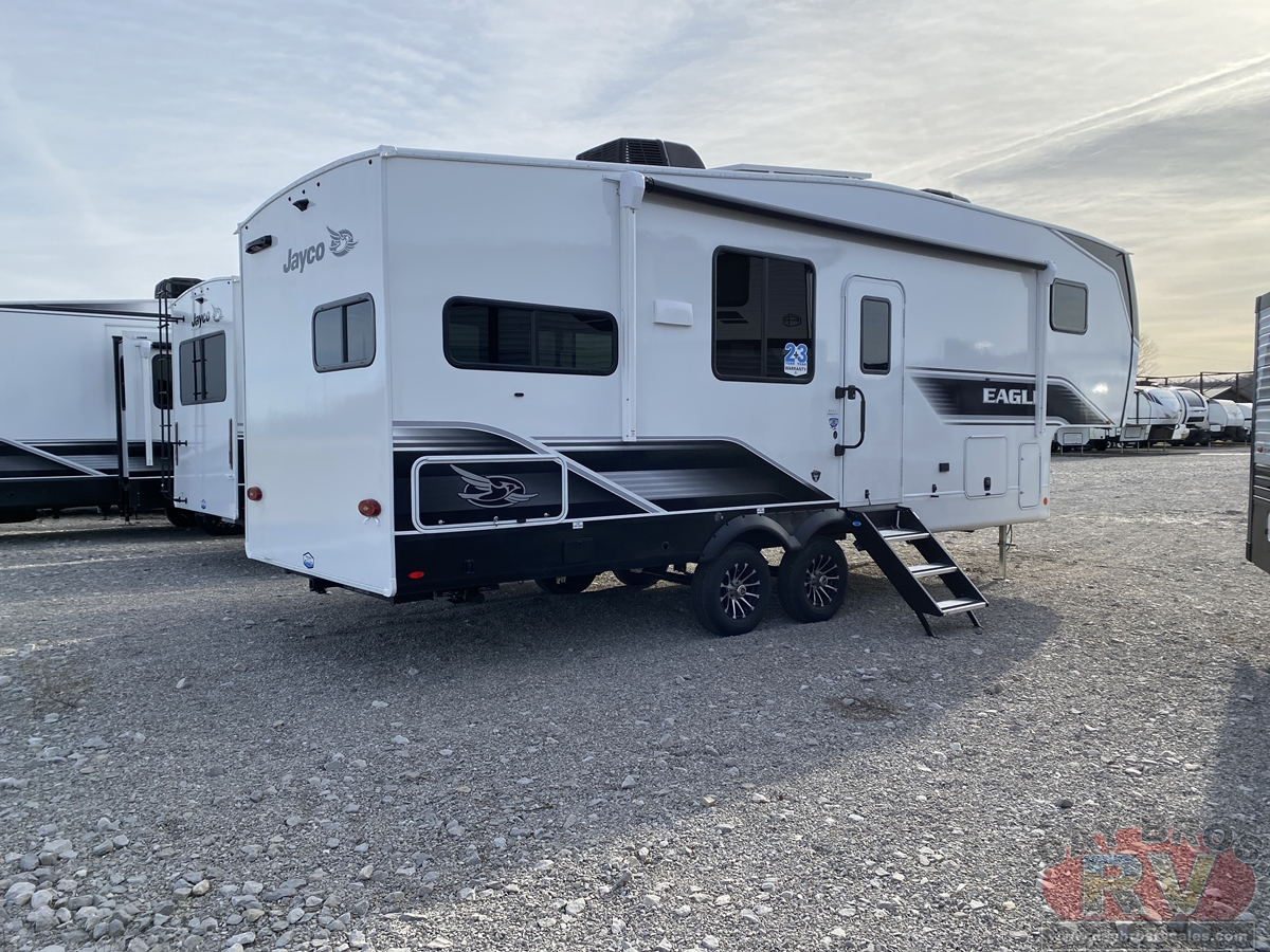 With any Eagle SLE fifth wheel by Jayco, you will enjoy a lighter tow weight, high-end finishes, and the same quality construction you've come to expect from Jayco! There is an Alpha Ply TPO roof membrane, a fully enclosed and heated underbelly, plus Stronghold VBL walls for added durability. There is also a rear 2" towing receiver outside, along with metal slam latch baggage doors, MORryde Step Above entry steps, and a Winegard Air 360 antenna with router prep if you want to stay connected as you camp. Once inside you'll enjoy the handcrafted door/drawer fronts, shower skylight, and residential vinyl flooring throughout with no carpet for an easier clean. The on-demand water heater, 30K BTU furnace, and 15K BTU "Whisper Quiet" A/C will ensure your comfort, and the Overland 1 Solar Package will provide off-grid capabilities!