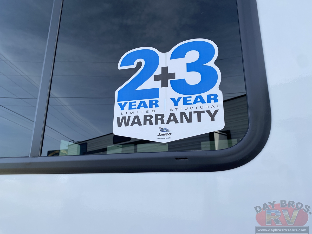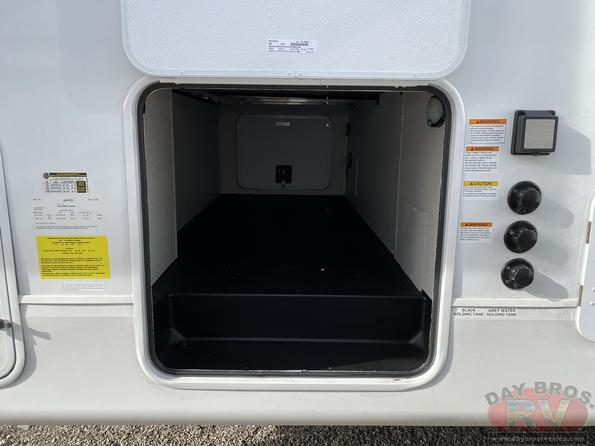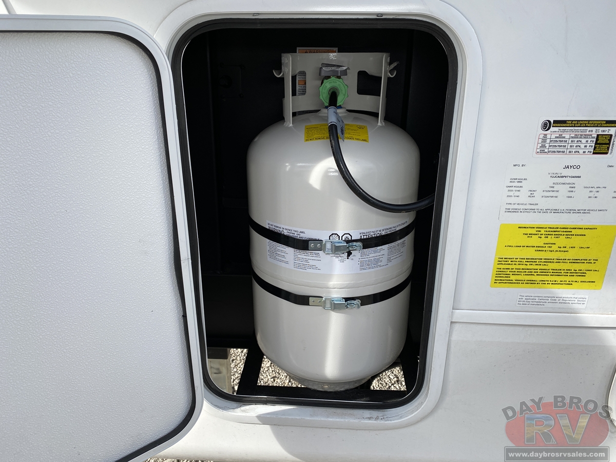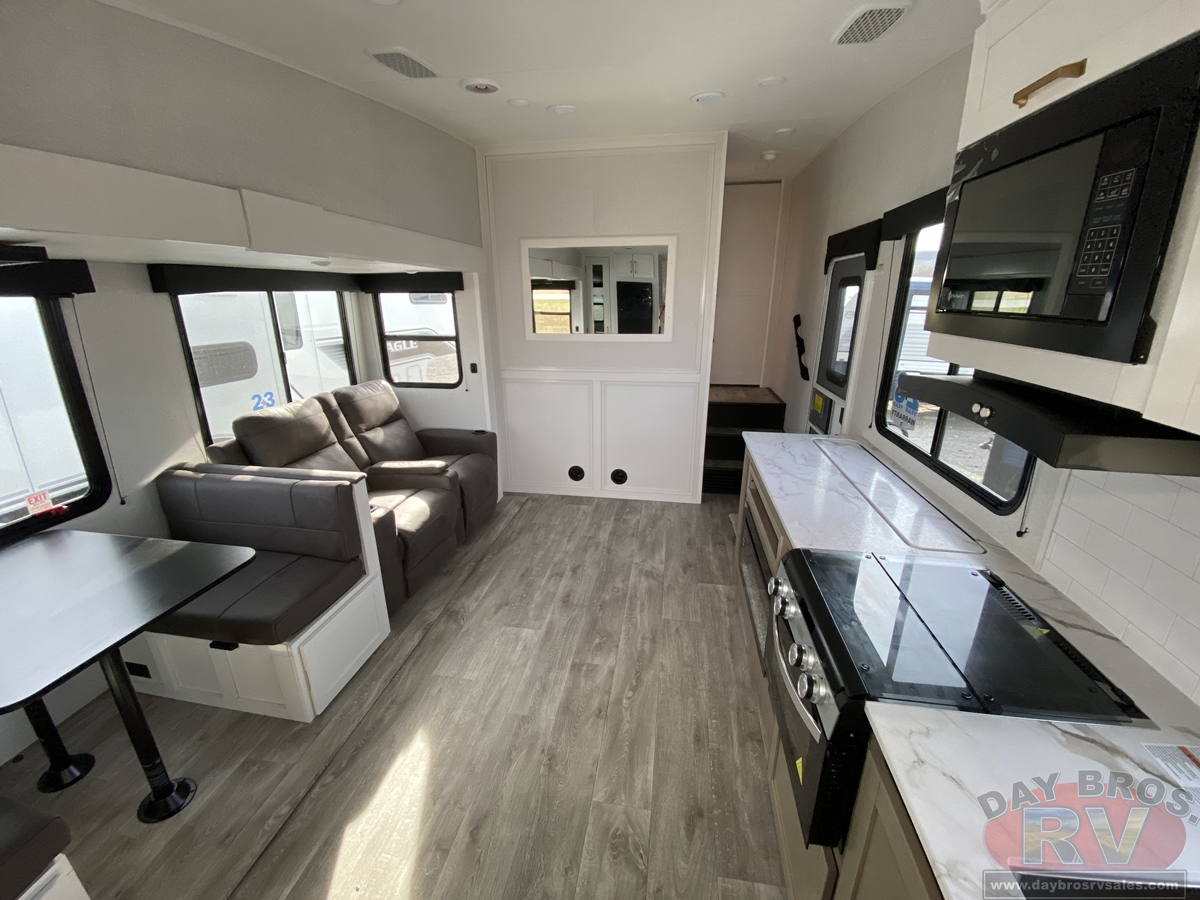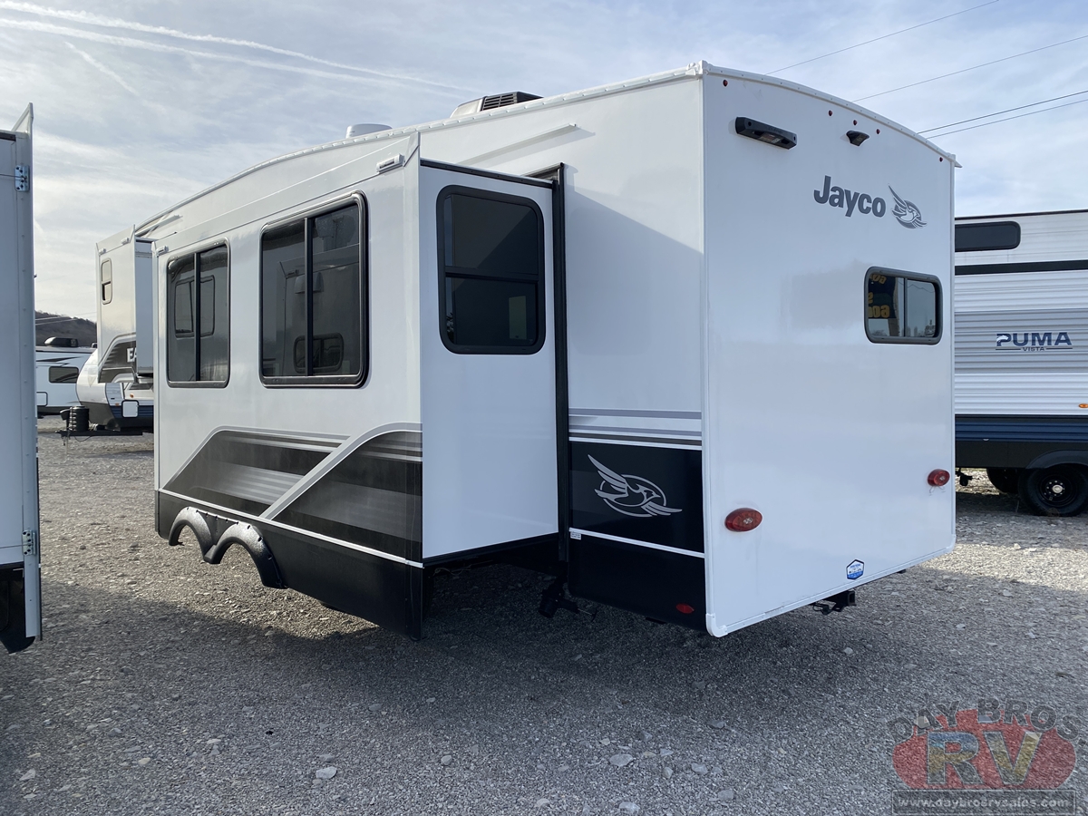 With any Eagle SLE fifth wheel by Jayco, you will enjoy a lighter tow weight, high-end finishes, and the same quality construction you've come to expect from Jayco! There is an Alpha Ply TPO roof membrane, a fully enclosed and heated underbelly, plus Stronghold VBL walls for added durability. There is also a rear 2" towing receiver outside, along with metal slam latch baggage doors, MORryde Step Above entry steps, and a Winegard Air 360 antenna with router prep if you want to stay connected as you camp. Once inside you'll enjoy the handcrafted door/drawer fronts, shower skylight, and residential vinyl flooring throughout with no carpet for an easier clean. The on-demand water heater, 30K BTU furnace, and 15K BTU "Whisper Quiet" A/C will ensure your comfort, and the Overland 1 Solar Package will provide off-grid capabilities!