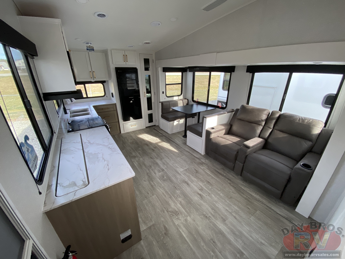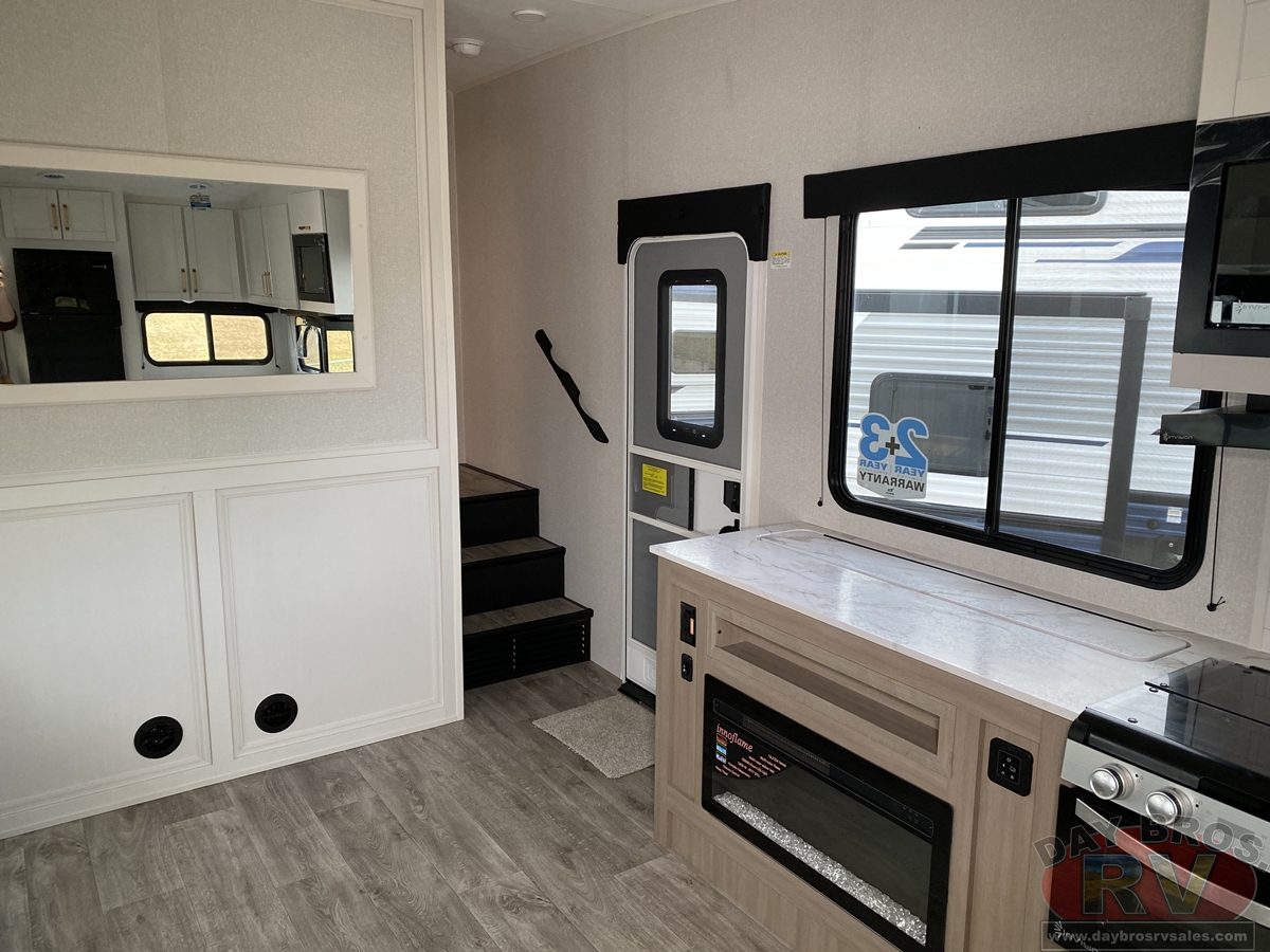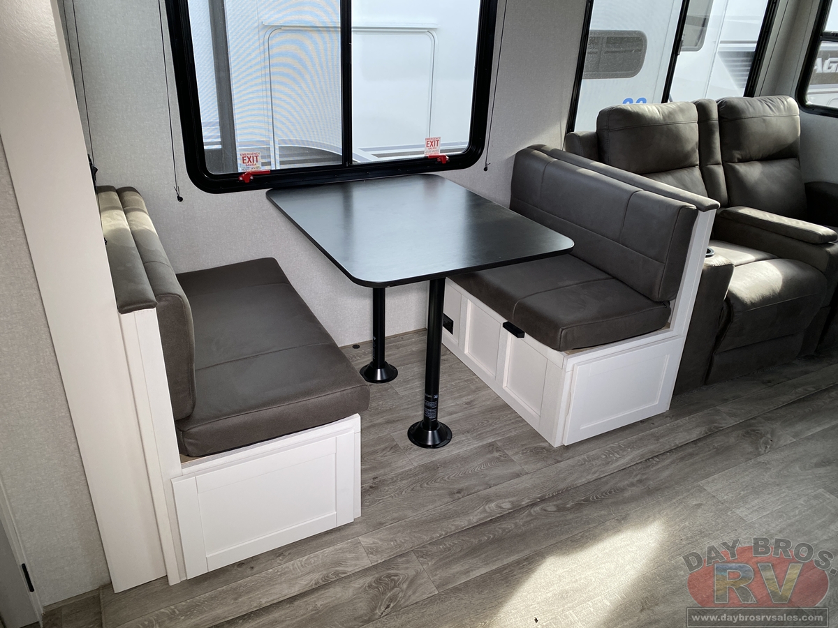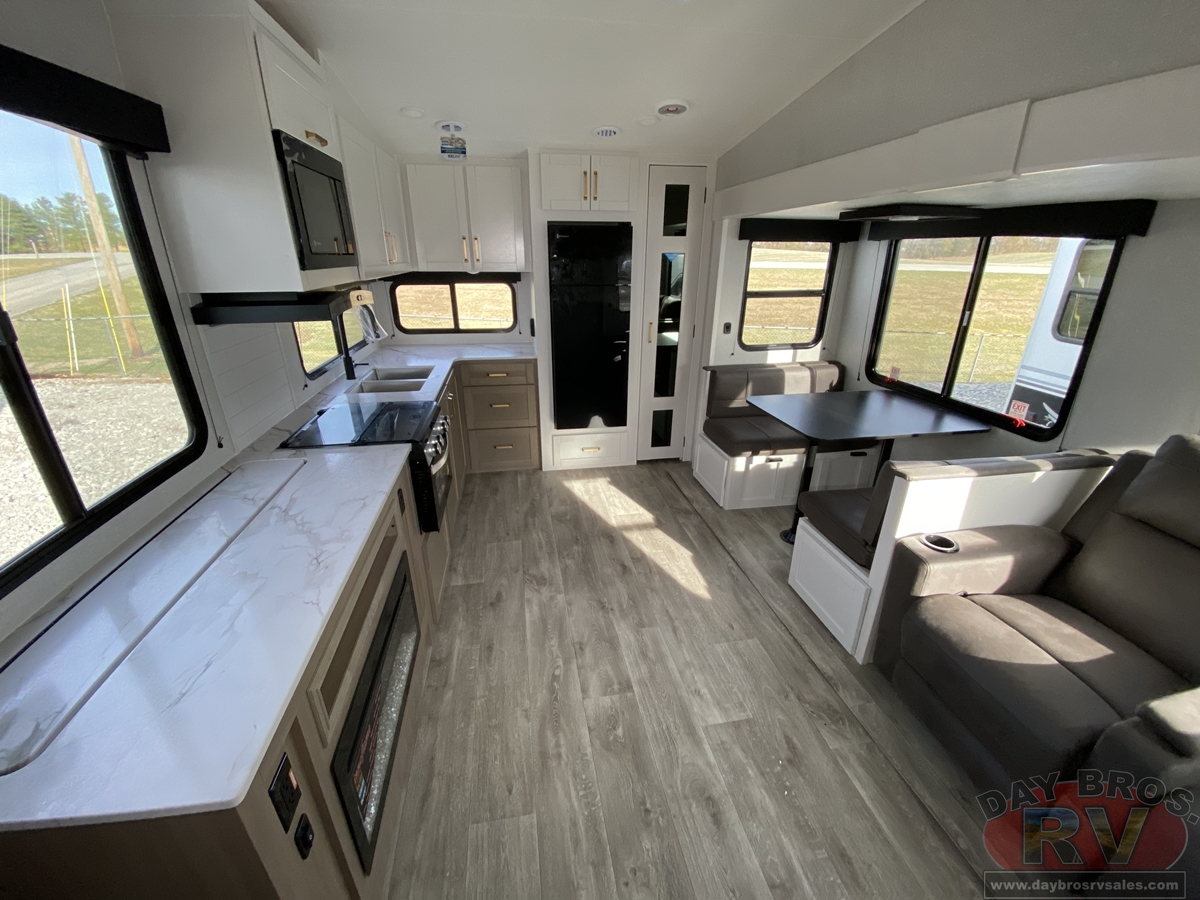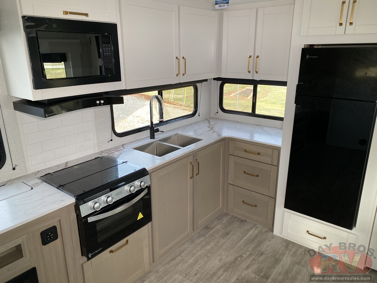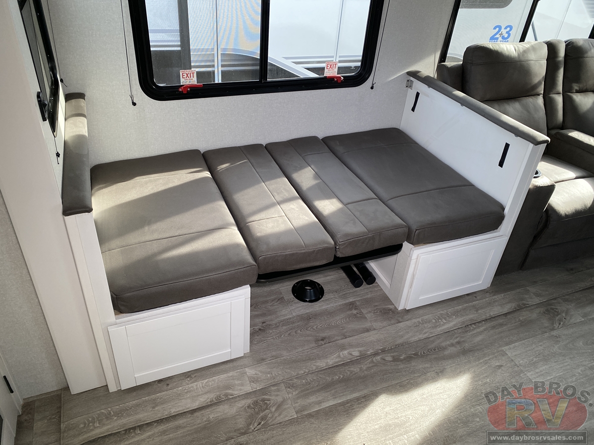 Camping just got a whole lot sweeter in this fifth wheel with double slides, a rear kitchen, and sleeping space for five to six. You'll love waking up each morning in the front private bedroom that includes a queen bed, overhead cabinets, plus a wardrobe and dresser slide. Your guests who slept on the tri-fold sofa and booth dinette can convert these back to seating space in the morning, and breakfast can be made in the rear kitchen. Here, you'll find ample counter space, a microwave and range, plus a pantry and 12V refrigerator for food storage. Outside, gear can be stored in the pass-thru storage area, and you're sure to enjoy the 17' power awning with LED Lights!