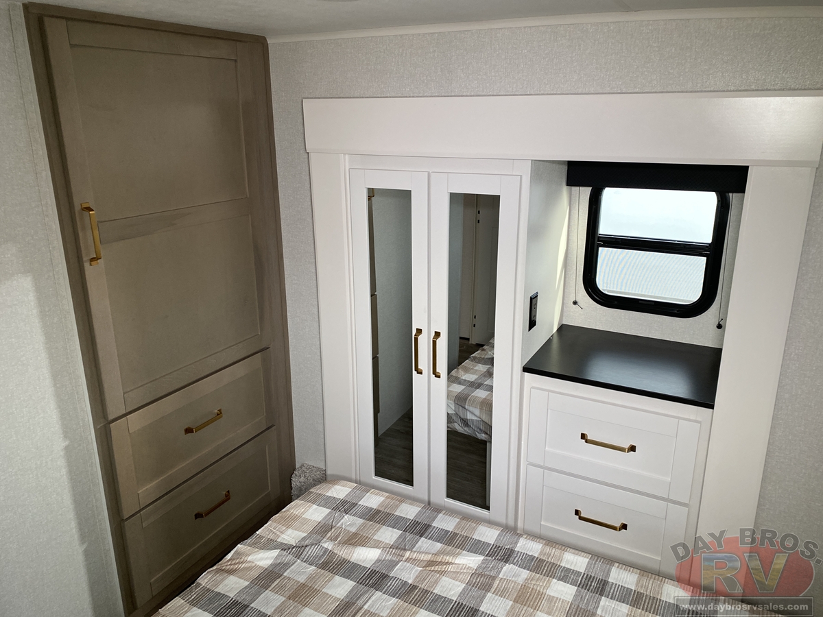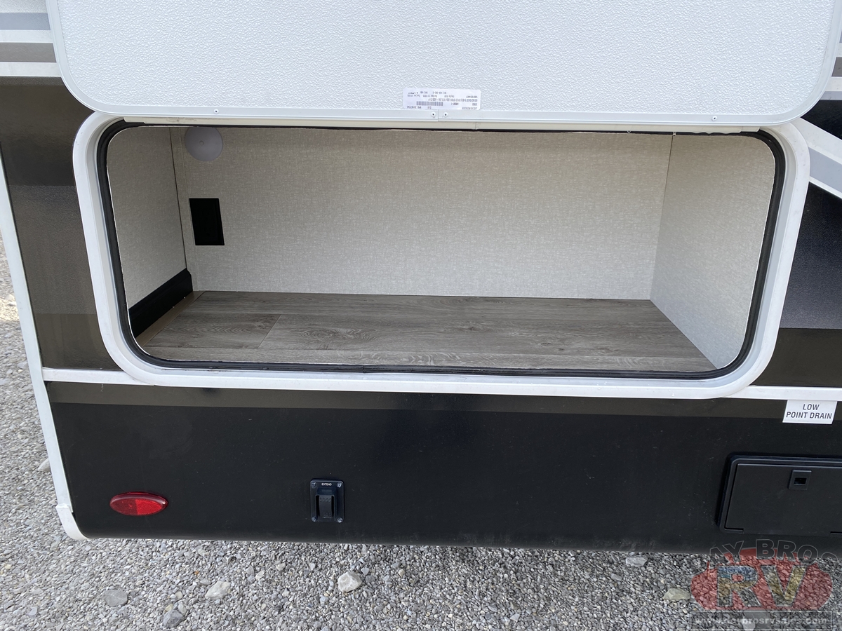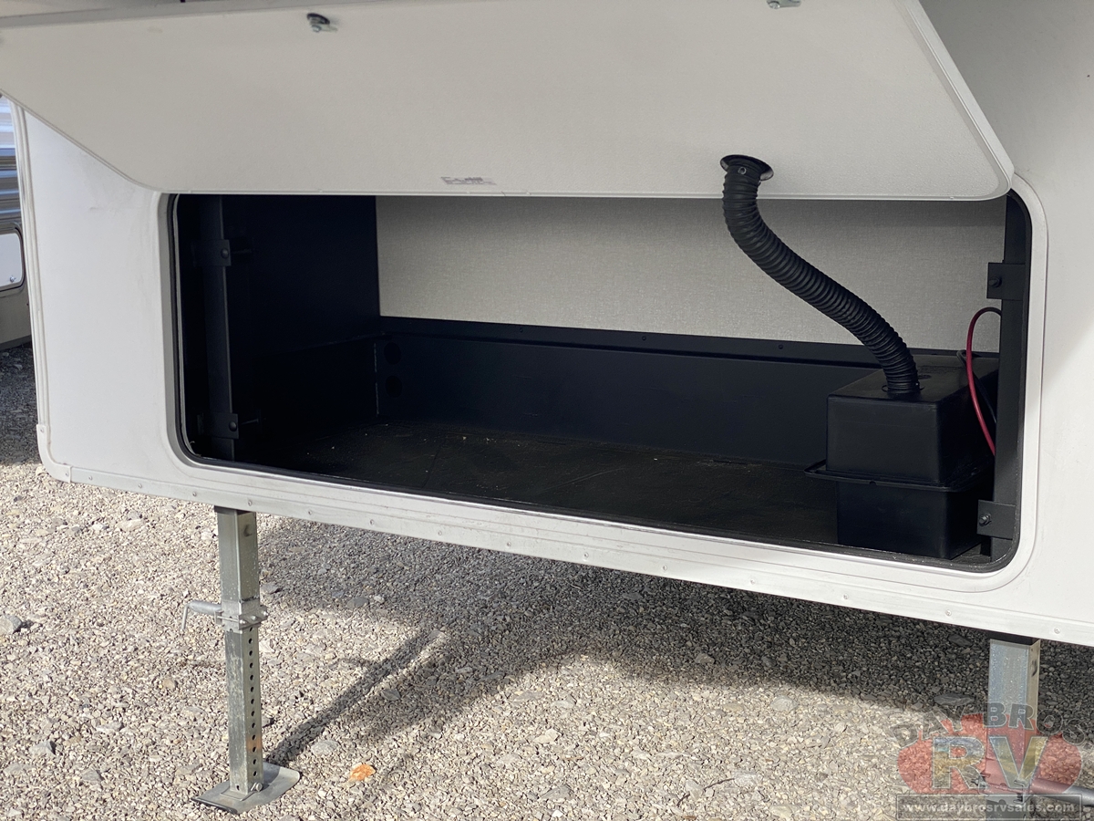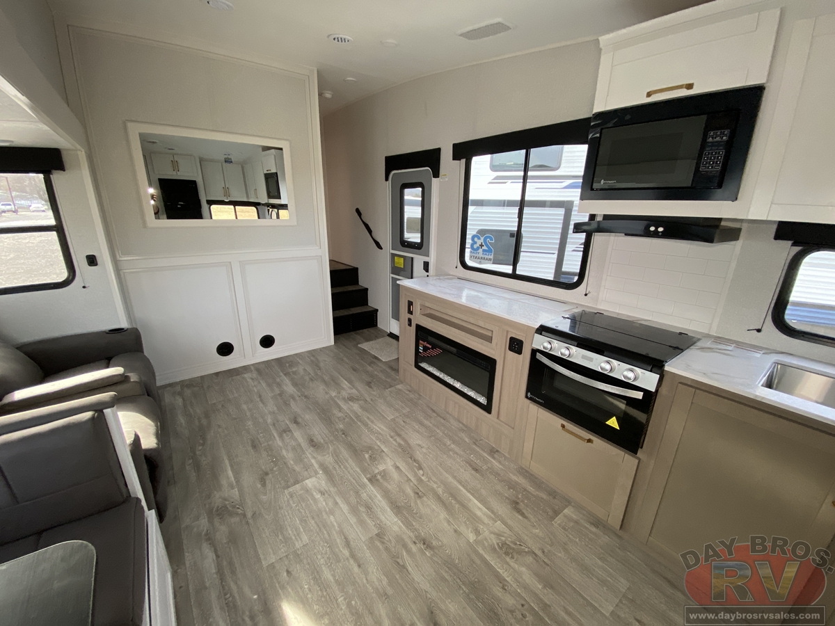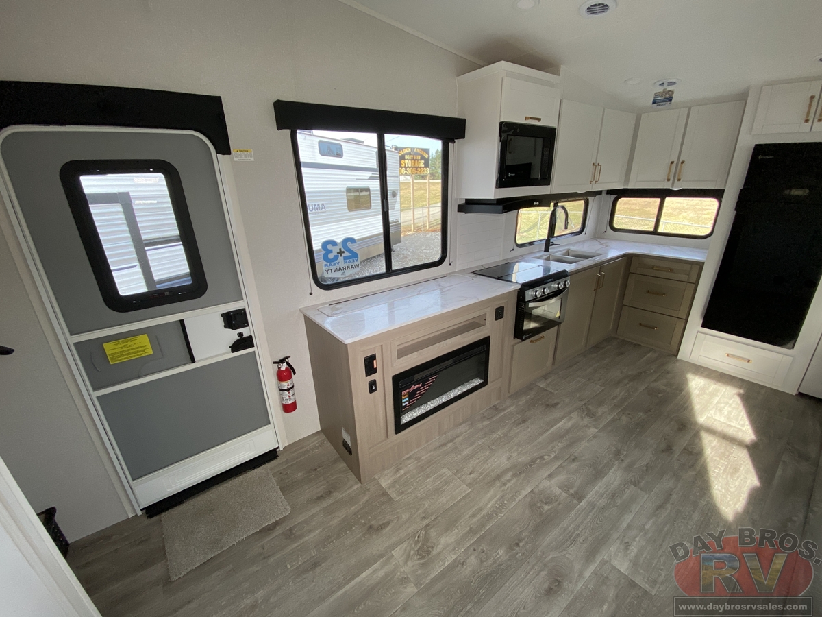 Camping just got a whole lot sweeter in this fifth wheel with double slides, a rear kitchen, and sleeping space for five to six. You'll love waking up each morning in the front private bedroom that includes a queen bed, overhead cabinets, plus a wardrobe and dresser slide. Your guests who slept on the tri-fold sofa and booth dinette can convert these back to seating space in the morning, and breakfast can be made in the rear kitchen. Here, you'll find ample counter space, a microwave and range, plus a pantry and 12V refrigerator for food storage. Outside, gear can be stored in the pass-thru storage area, and you're sure to enjoy the 17' power awning with LED Lights!