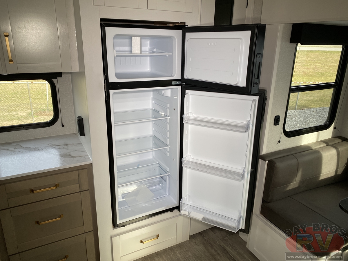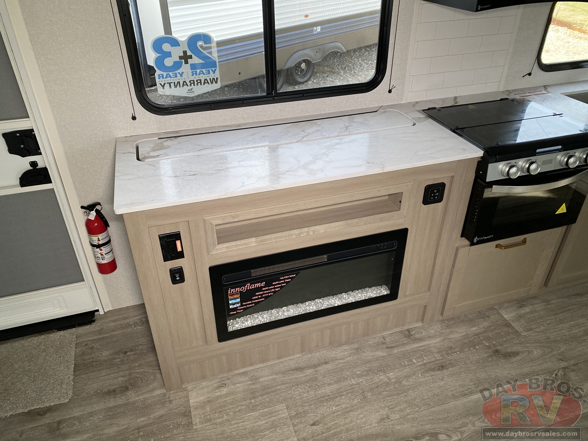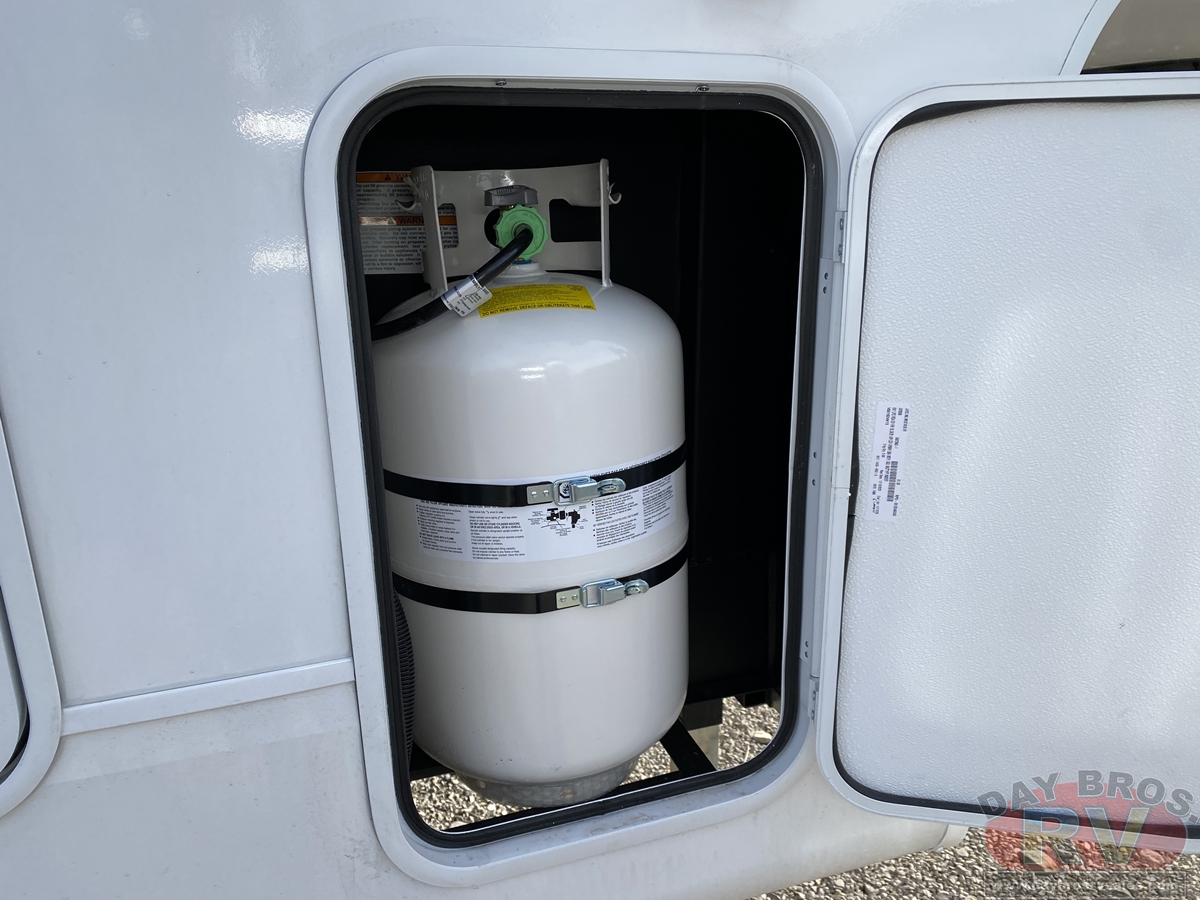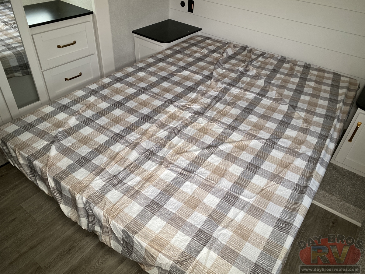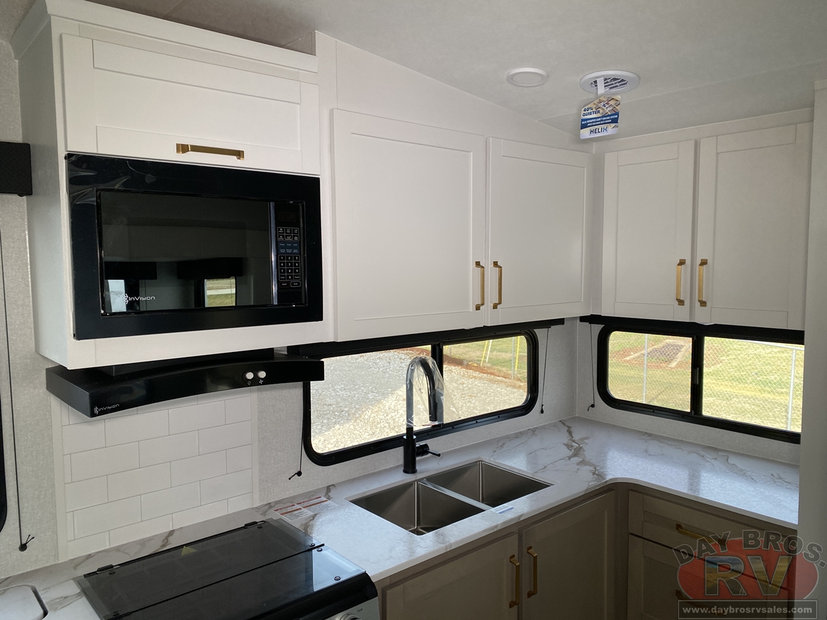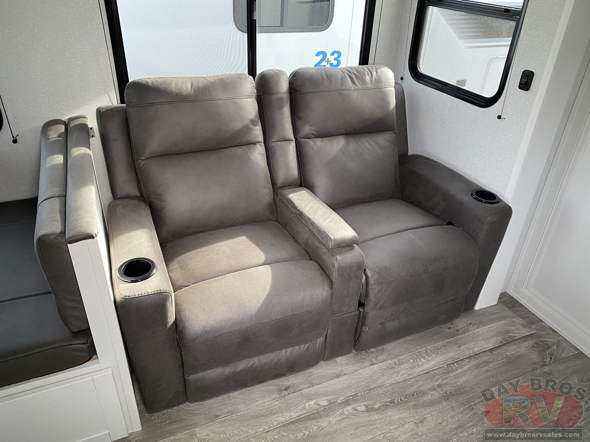 Camping just got a whole lot sweeter in this fifth wheel with double slides, a rear kitchen, and sleeping space for five to six. You'll love waking up each morning in the front private bedroom that includes a queen bed, overhead cabinets, plus a wardrobe and dresser slide. Your guests who slept on the tri-fold sofa and booth dinette can convert these back to seating space in the morning, and breakfast can be made in the rear kitchen. Here, you'll find ample counter space, a microwave and range, plus a pantry and 12V refrigerator for food storage. Outside, gear can be stored in the pass-thru storage area, and you're sure to enjoy the 17' power awning with LED Lights!
