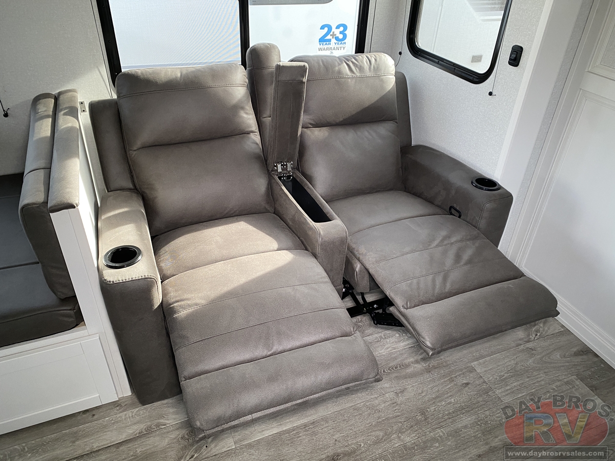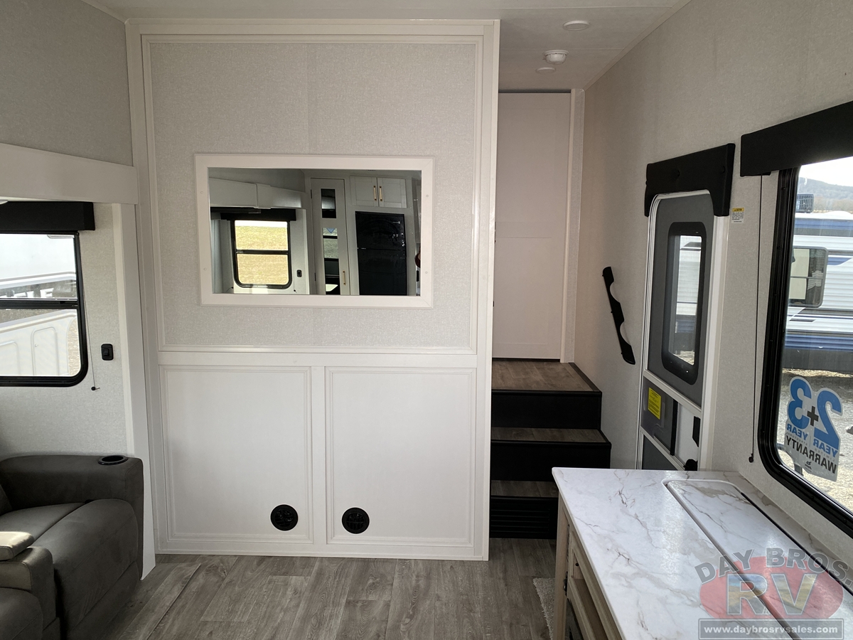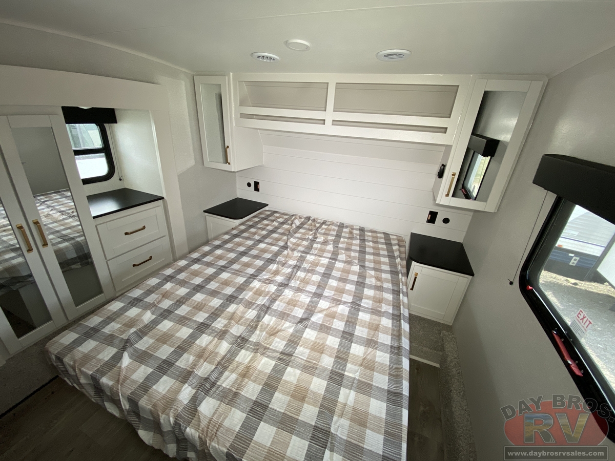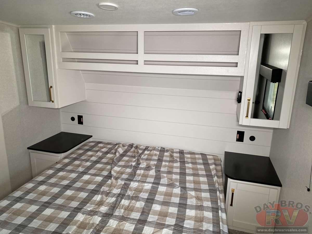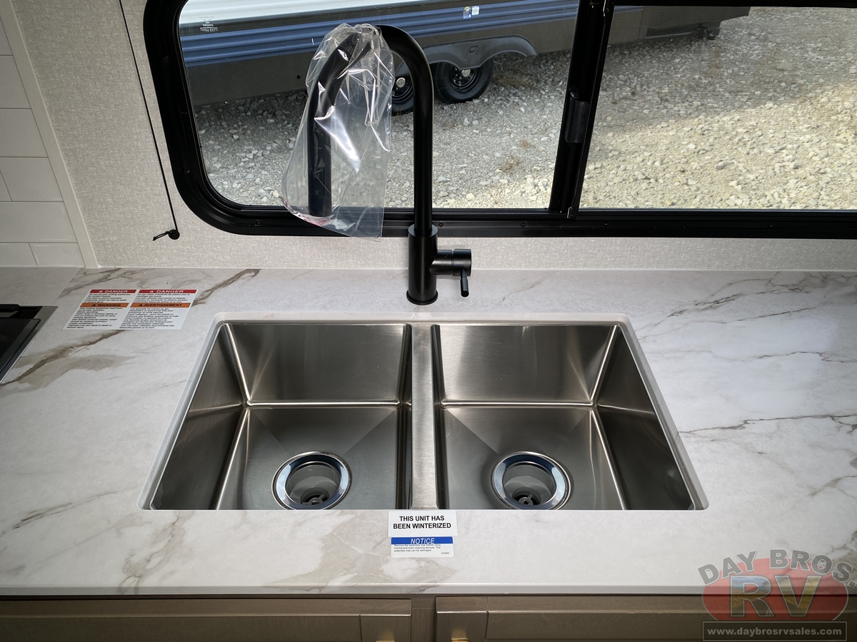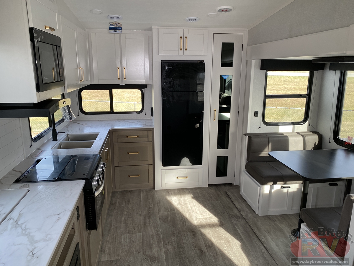 Camping just got a whole lot sweeter in this fifth wheel with double slides, a rear kitchen, and sleeping space for five to six. You'll love waking up each morning in the front private bedroom that includes a queen bed, overhead cabinets, plus a wardrobe and dresser slide. Your guests who slept on the tri-fold sofa and booth dinette can convert these back to seating space in the morning, and breakfast can be made in the rear kitchen. Here, you'll find ample counter space, a microwave and range, plus a pantry and 12V refrigerator for food storage. Outside, gear can be stored in the pass-thru storage area, and you're sure to enjoy the 17' power awning with LED Lights!
