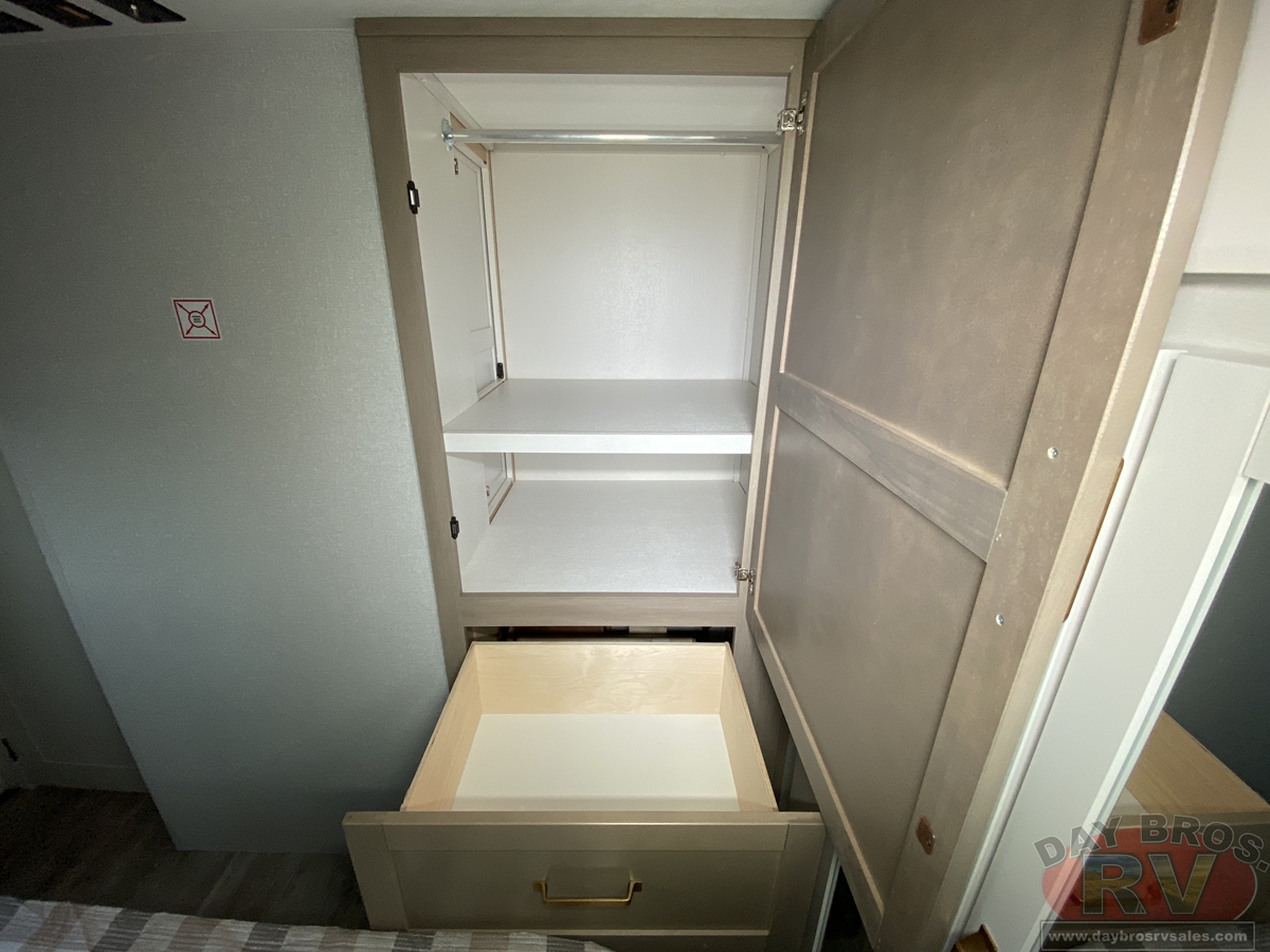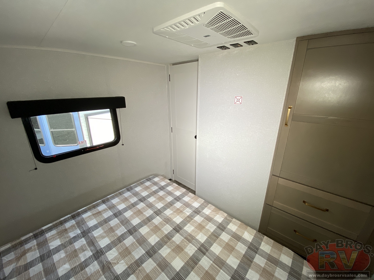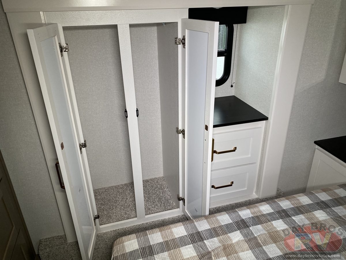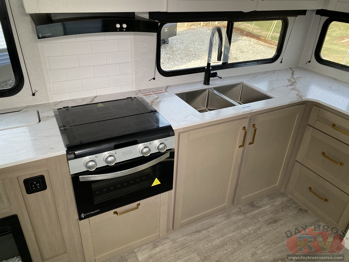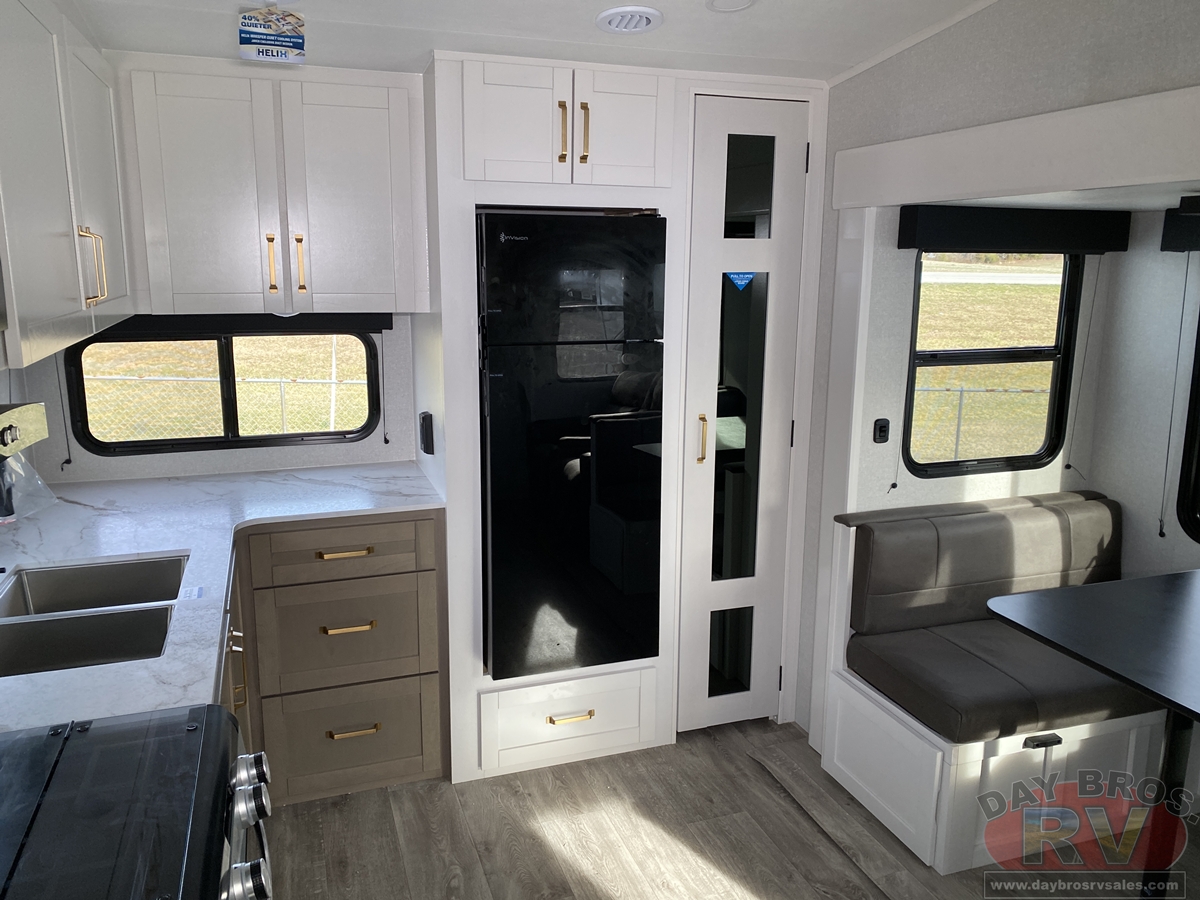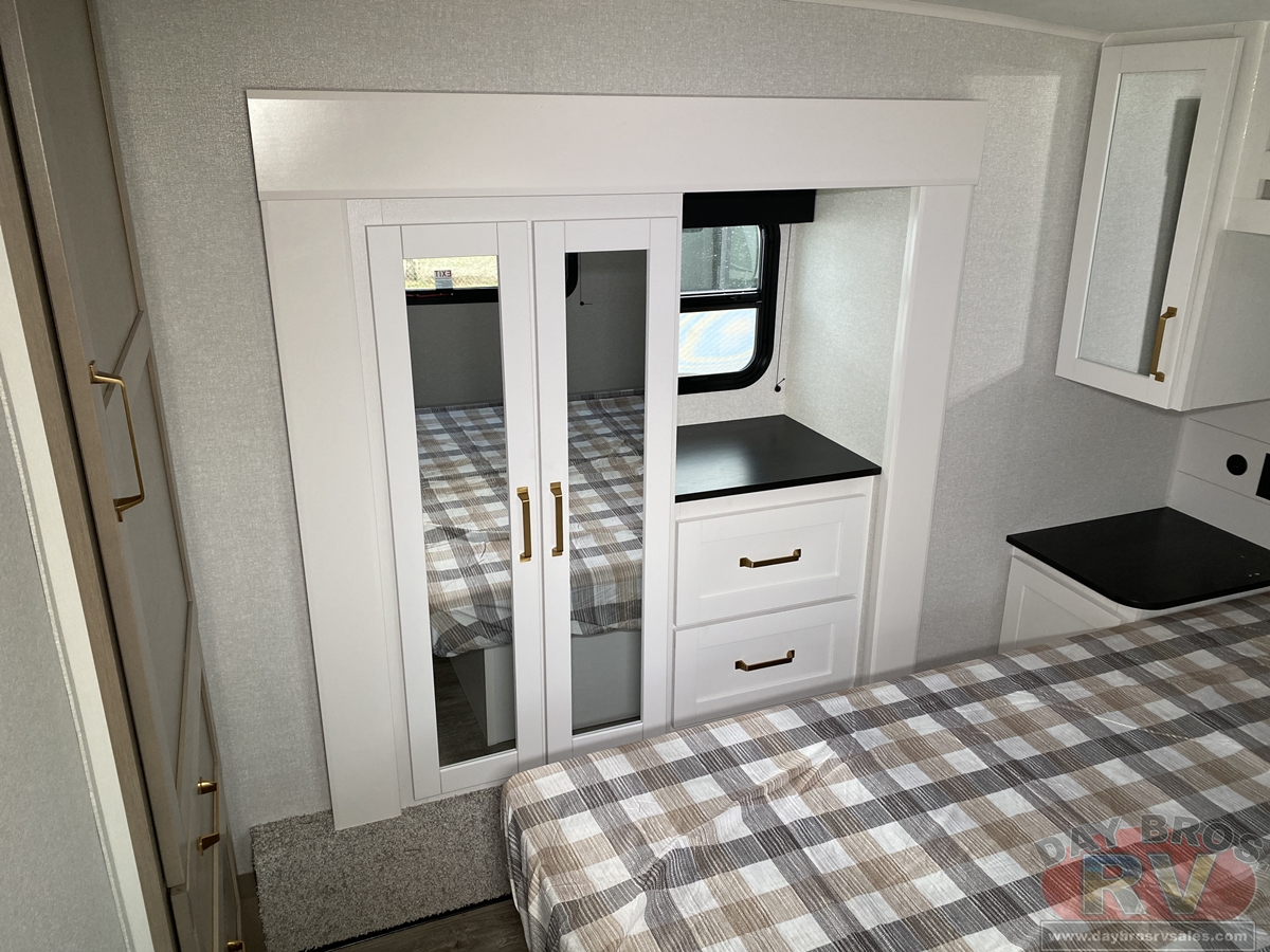 Camping just got a whole lot sweeter in this fifth wheel with double slides, a rear kitchen, and sleeping space for five to six. You'll love waking up each morning in the front private bedroom that includes a queen bed, overhead cabinets, plus a wardrobe and dresser slide. Your guests who slept on the tri-fold sofa and booth dinette can convert these back to seating space in the morning, and breakfast can be made in the rear kitchen. Here, you'll find ample counter space, a microwave and range, plus a pantry and 12V refrigerator for food storage. Outside, gear can be stored in the pass-thru storage area, and you're sure to enjoy the 17' power awning with LED Lights!