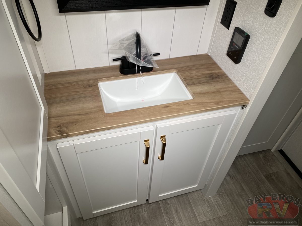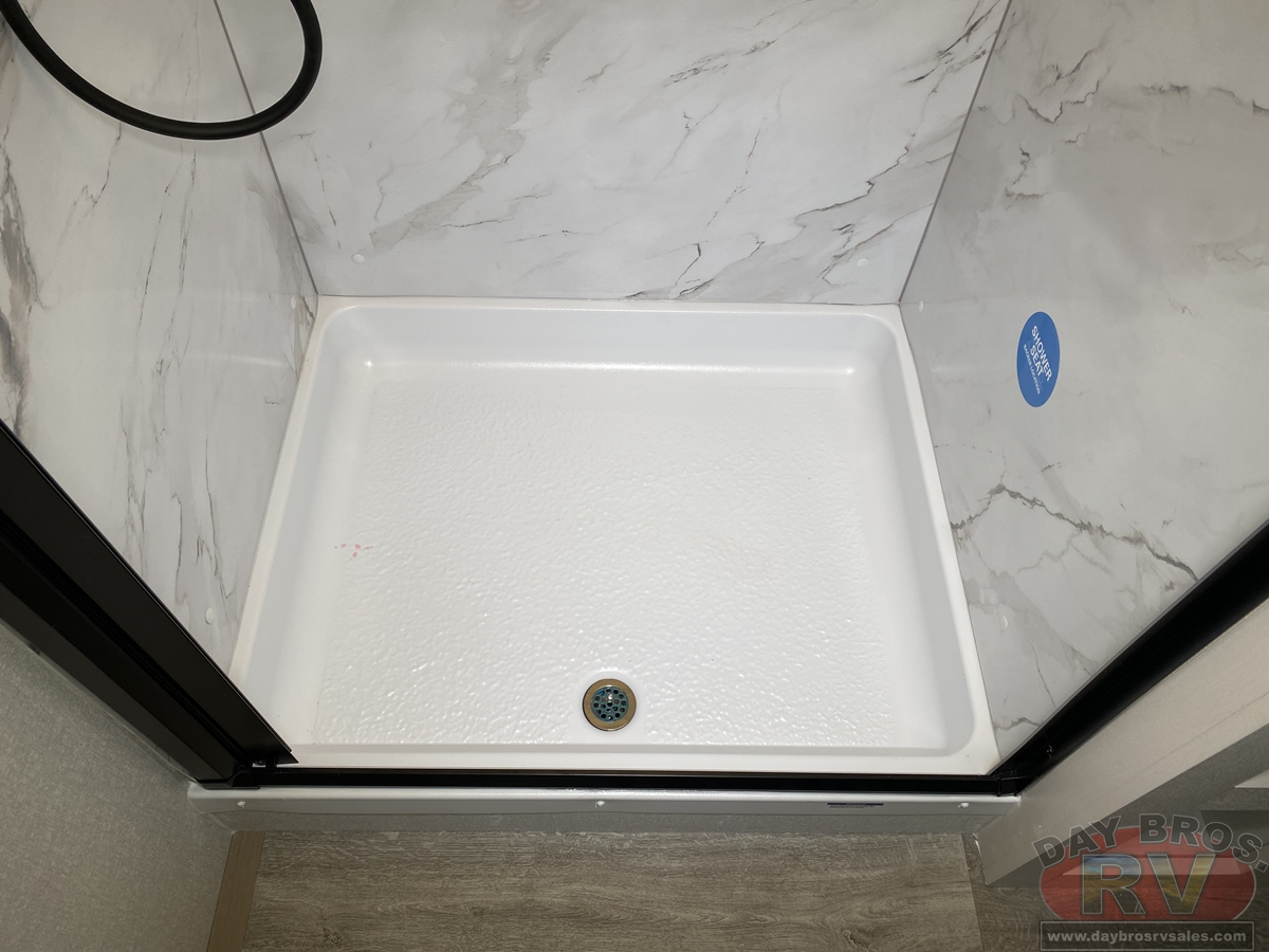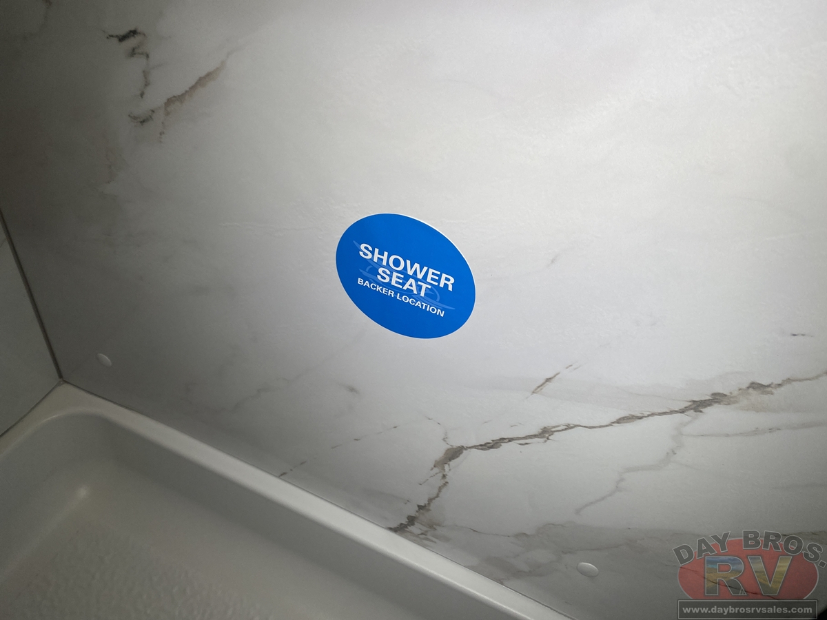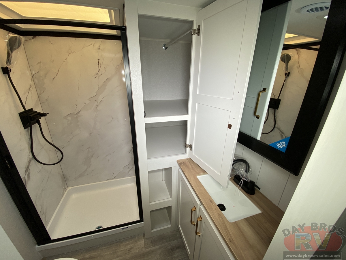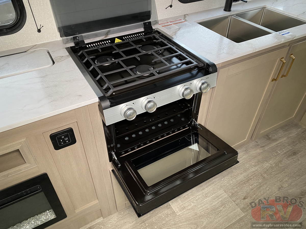 Camping just got a whole lot sweeter in this fifth wheel with double slides, a rear kitchen, and sleeping space for five to six. You'll love waking up each morning in the front private bedroom that includes a queen bed, overhead cabinets, plus a wardrobe and dresser slide. Your guests who slept on the tri-fold sofa and booth dinette can convert these back to seating space in the morning, and breakfast can be made in the rear kitchen. Here, you'll find ample counter space, a microwave and range, plus a pantry and 12V refrigerator for food storage. Outside, gear can be stored in the pass-thru storage area, and you're sure to enjoy the 17' power awning with LED Lights!