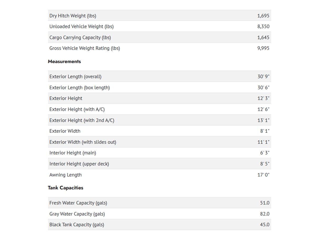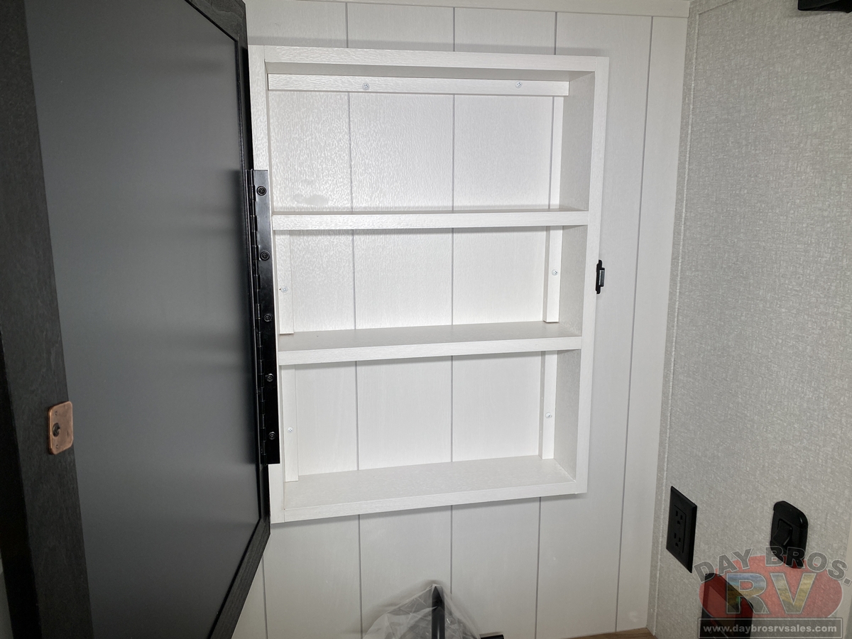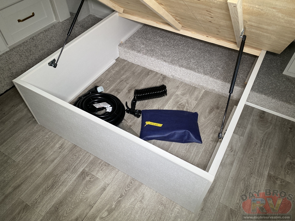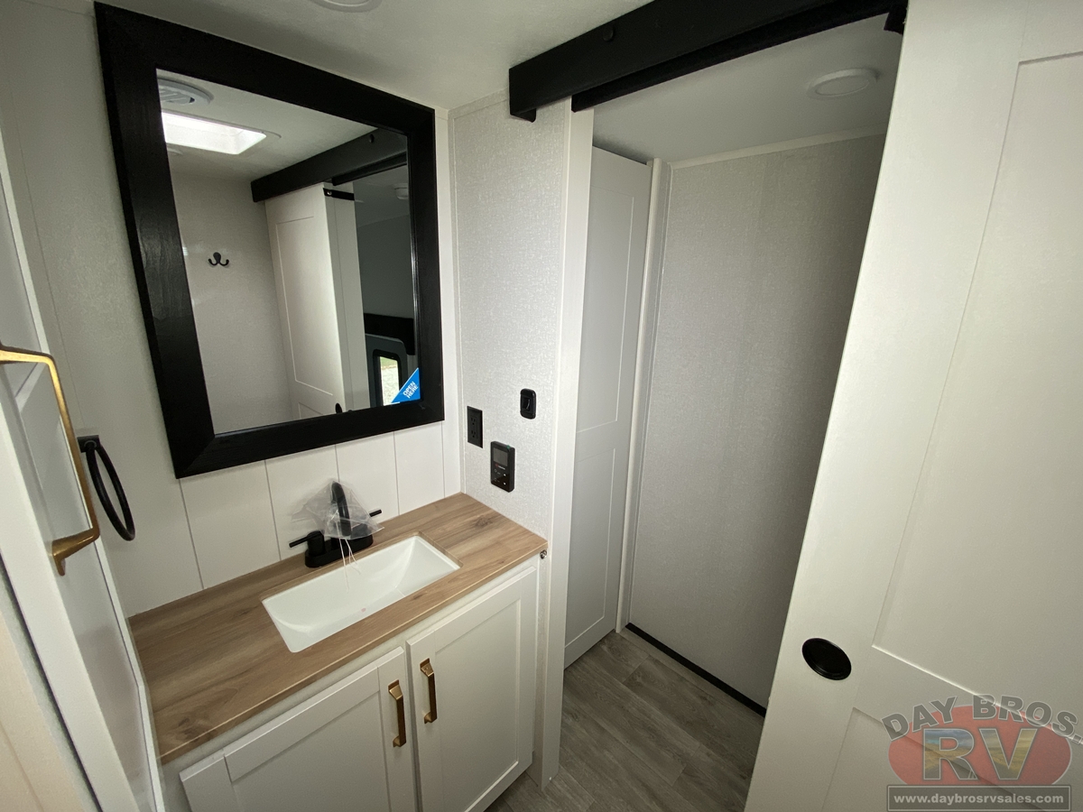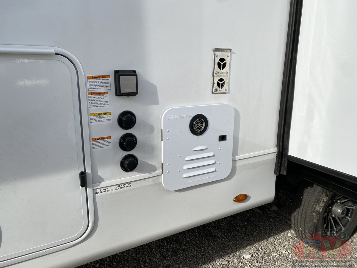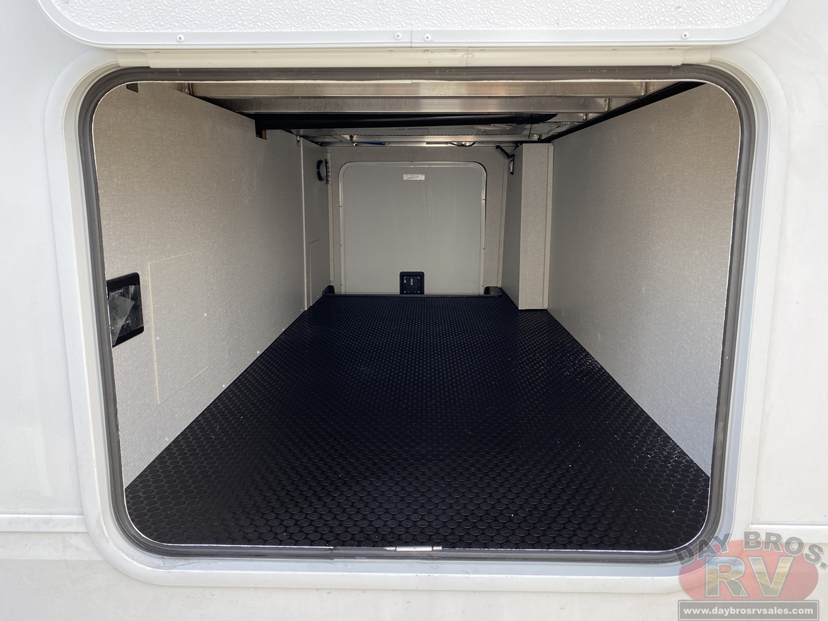 Camping just got a whole lot sweeter in this fifth wheel with double slides, a rear kitchen, and sleeping space for five to six. You'll love waking up each morning in the front private bedroom that includes a queen bed, overhead cabinets, plus a wardrobe and dresser slide. Your guests who slept on the tri-fold sofa and booth dinette can convert these back to seating space in the morning, and breakfast can be made in the rear kitchen. Here, you'll find ample counter space, a microwave and range, plus a pantry and 12V refrigerator for food storage. Outside, gear can be stored in the pass-thru storage area, and you're sure to enjoy the 17' power awning with LED Lights!