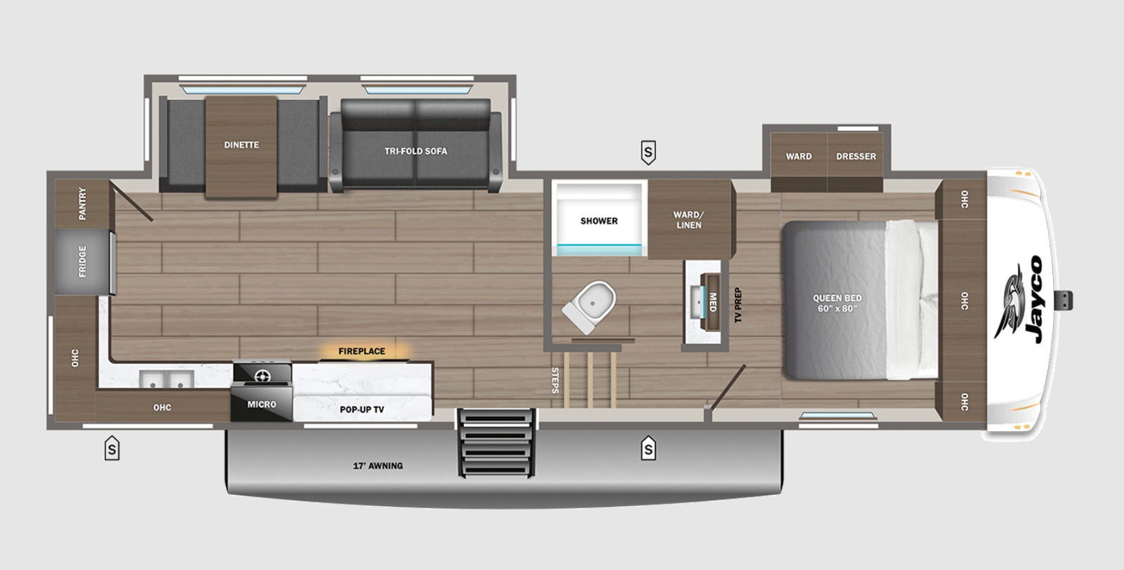 With any Eagle SLE fifth wheel by Jayco, you will enjoy a lighter tow weight, high-end finishes, and the same quality construction you've come to expect from Jayco! There is an Alpha Ply TPO roof membrane, a fully enclosed and heated underbelly, plus Stronghold VBL walls for added durability. There is also a rear 2" towing receiver outside, along with metal slam latch baggage doors, MORryde Step Above entry steps, and a Winegard Air 360 antenna with router prep if you want to stay connected as you camp. Once inside you'll enjoy the handcrafted door/drawer fronts, shower skylight, and residential vinyl flooring throughout with no carpet for an easier clean. The on-demand water heater, 30K BTU furnace, and 15K BTU "Whisper Quiet" A/C will ensure your comfort, and the Overland 1 Solar Package will provide off-grid capabilities!