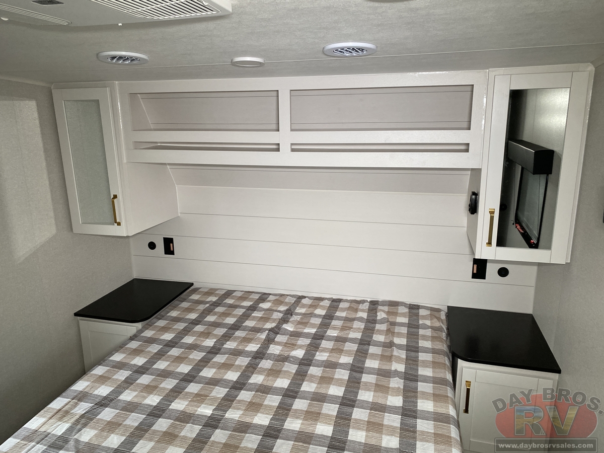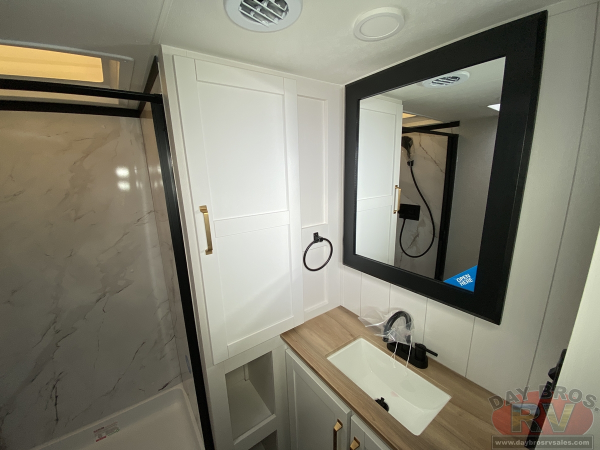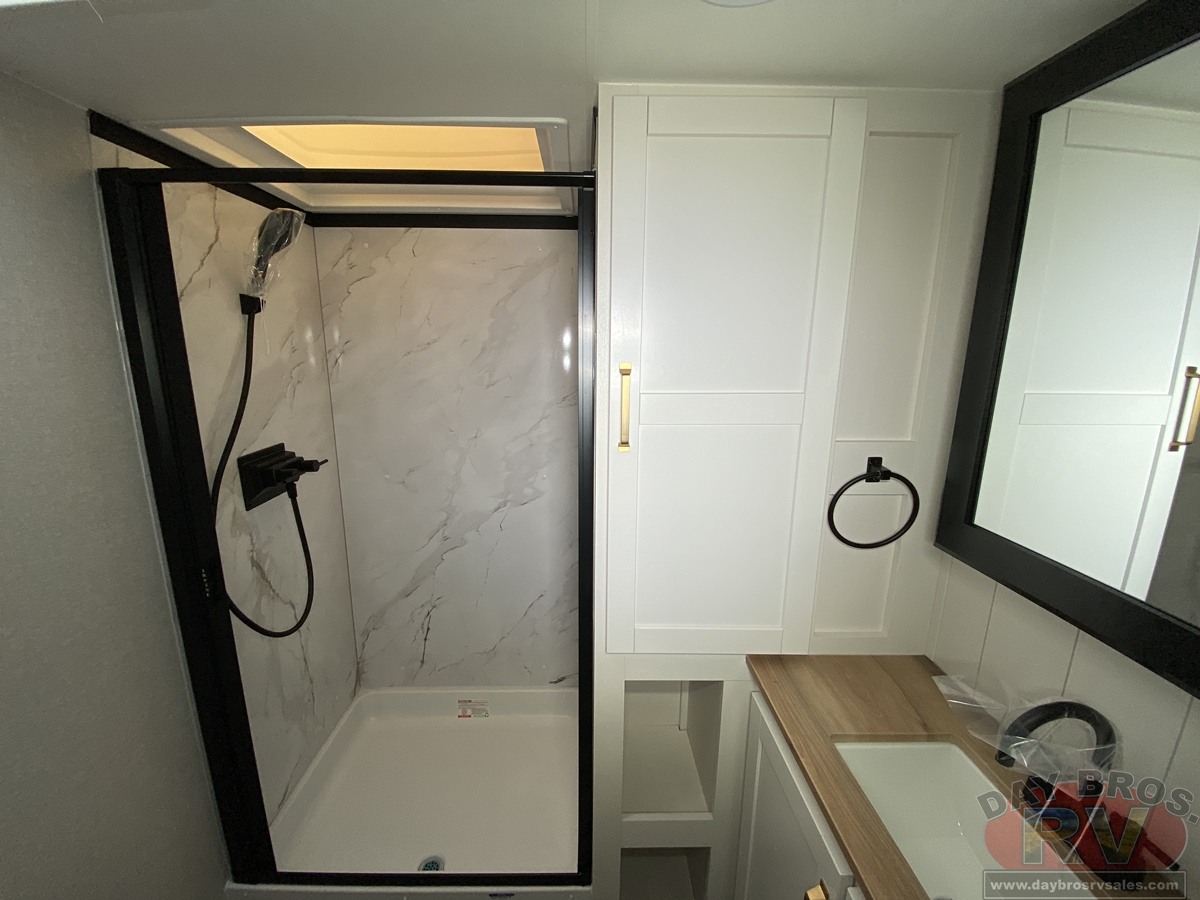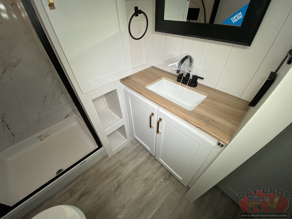 After a day of hiking, fishing, or exploring new destinations, retreat to the private master suite, where high-end finishes and smart design guarantee a restful night’s sleep. Gas-strutted under-bed storage provides extra room for all your essentials, and the design of the bed area is prepped for added convenience, including space for a CPAP machine. Panoramic windows let in natural light and fresh air, creating a breezy, open feel.