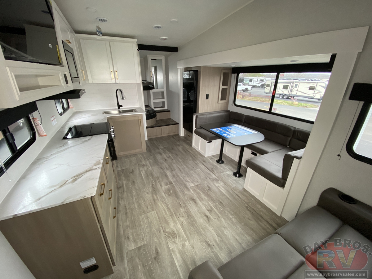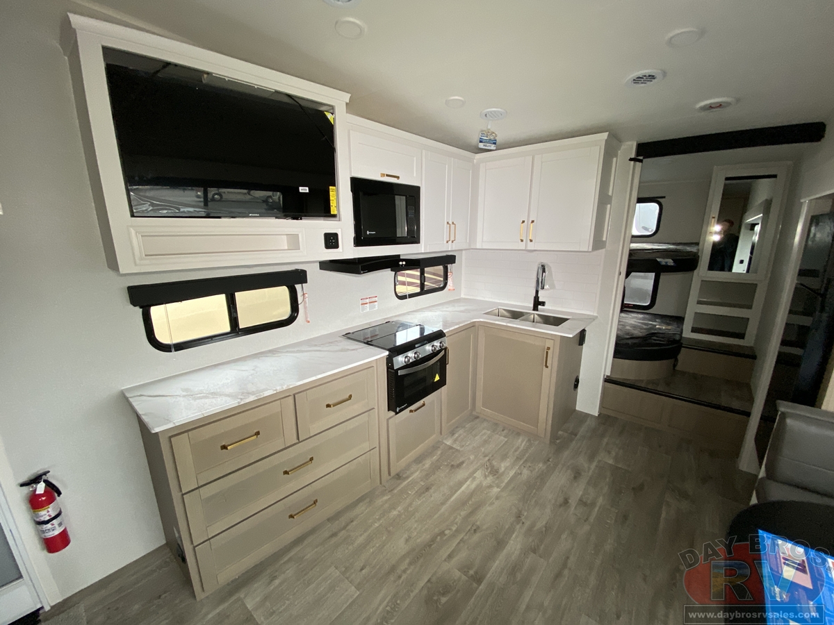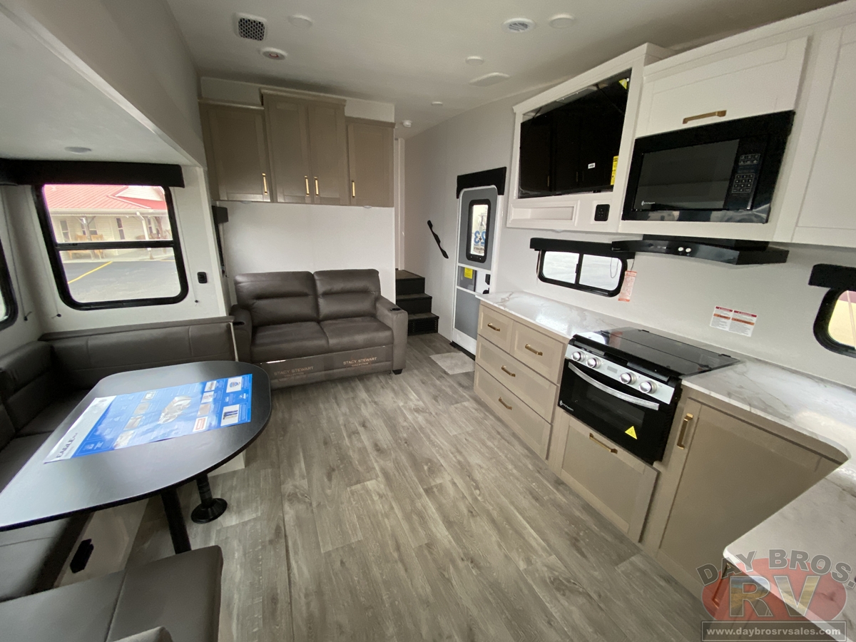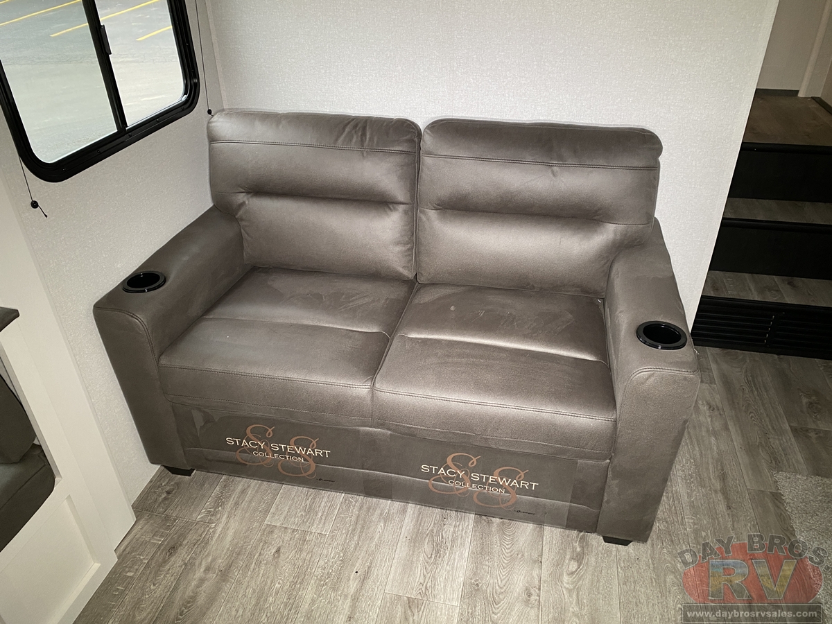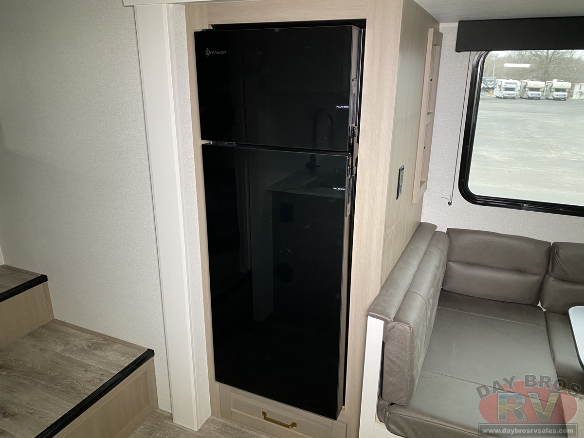 Step inside, and you’ll be greeted by an open-concept living space, complete with residential-style finishes and thoughtful details that elevate your RV experience. The Whisper Quiet 15K BTU A/C system ensures a peaceful retreat, while the HELIX Cooling System™ dual-duct design keeps temperatures steady, even in the summer heat. Relax by the optional LED fireplace with a 5,000 BTU space heater, perfect for cozying up on chilly nights. The deep stainless-steel sink with a pull-out sprayer, spacious countertops, and full-extension 75-lb. drawer guides make meal prep effortless. The tri-fold hide-a-bed sofa with a memory foam sleep surface (select models) ensures every guest sleeps in comfort. With USB-C charging ports, a 40” 4K Ultra LED HD Smart TV, and Bluetooth audio connectivity, your entertainment is always at your fingertips.
